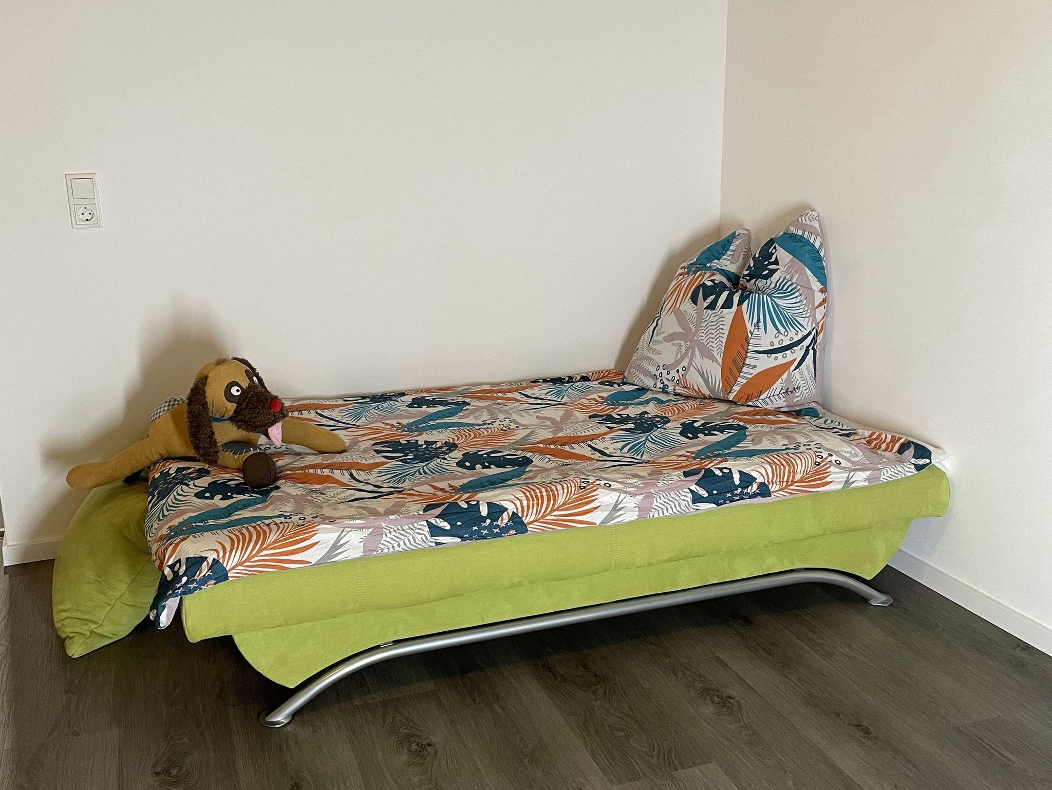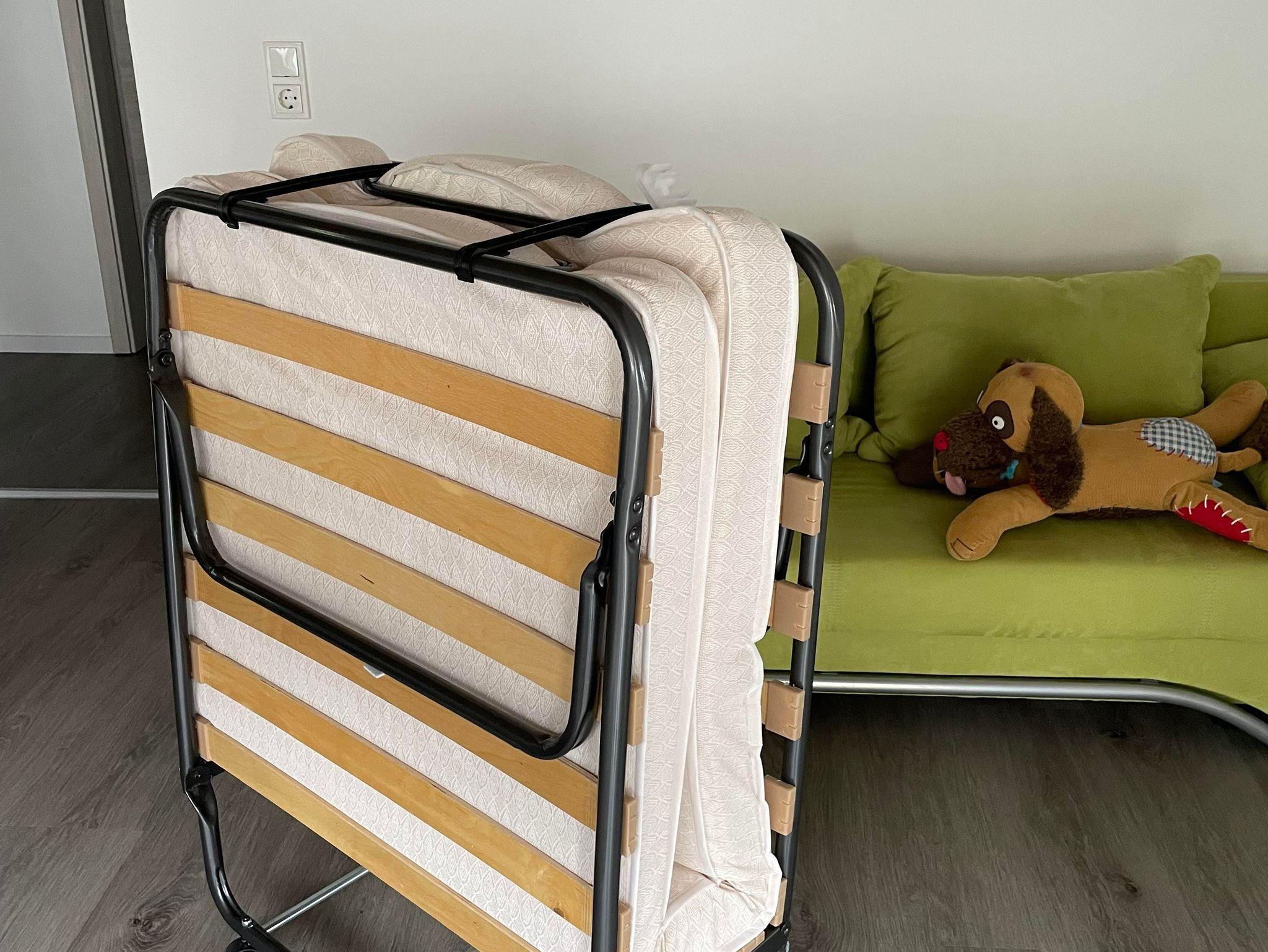 In den Fotos ist das Klappbett 0,80 auf 1,80 m mit 10 cm dicker Matratze + zusätzlichem Topper für die 4. Person ersichtlich.