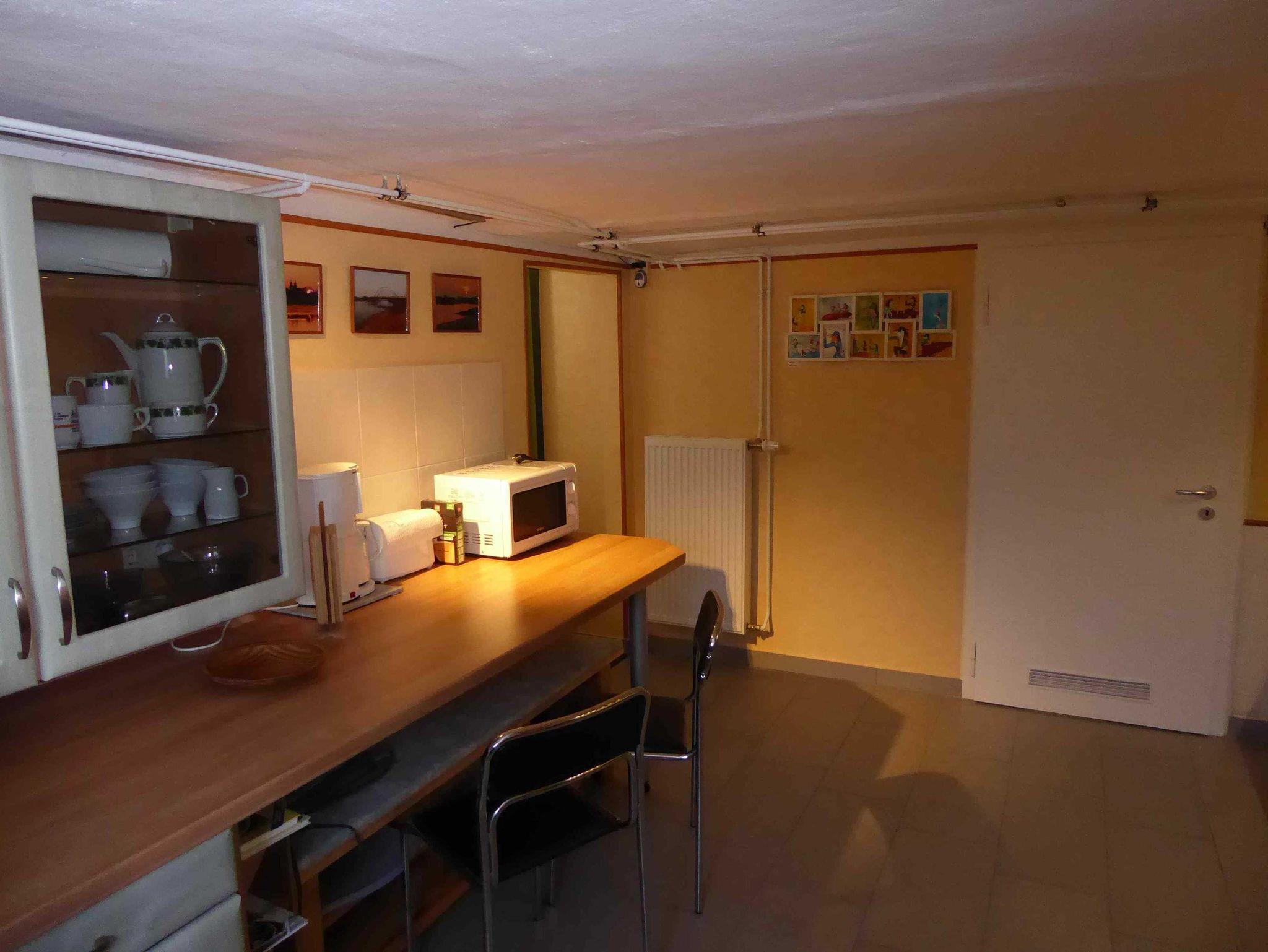 Über 3 Stufen erreichen Sie die vollständig ausgestattete Küche mit Herd (Backofen), Waschmaschine, Kühl-/Gefrierkombination, Wasserkocher, Kaffeemaschine, Mikrowelle und einem kleinen Essplatz.
