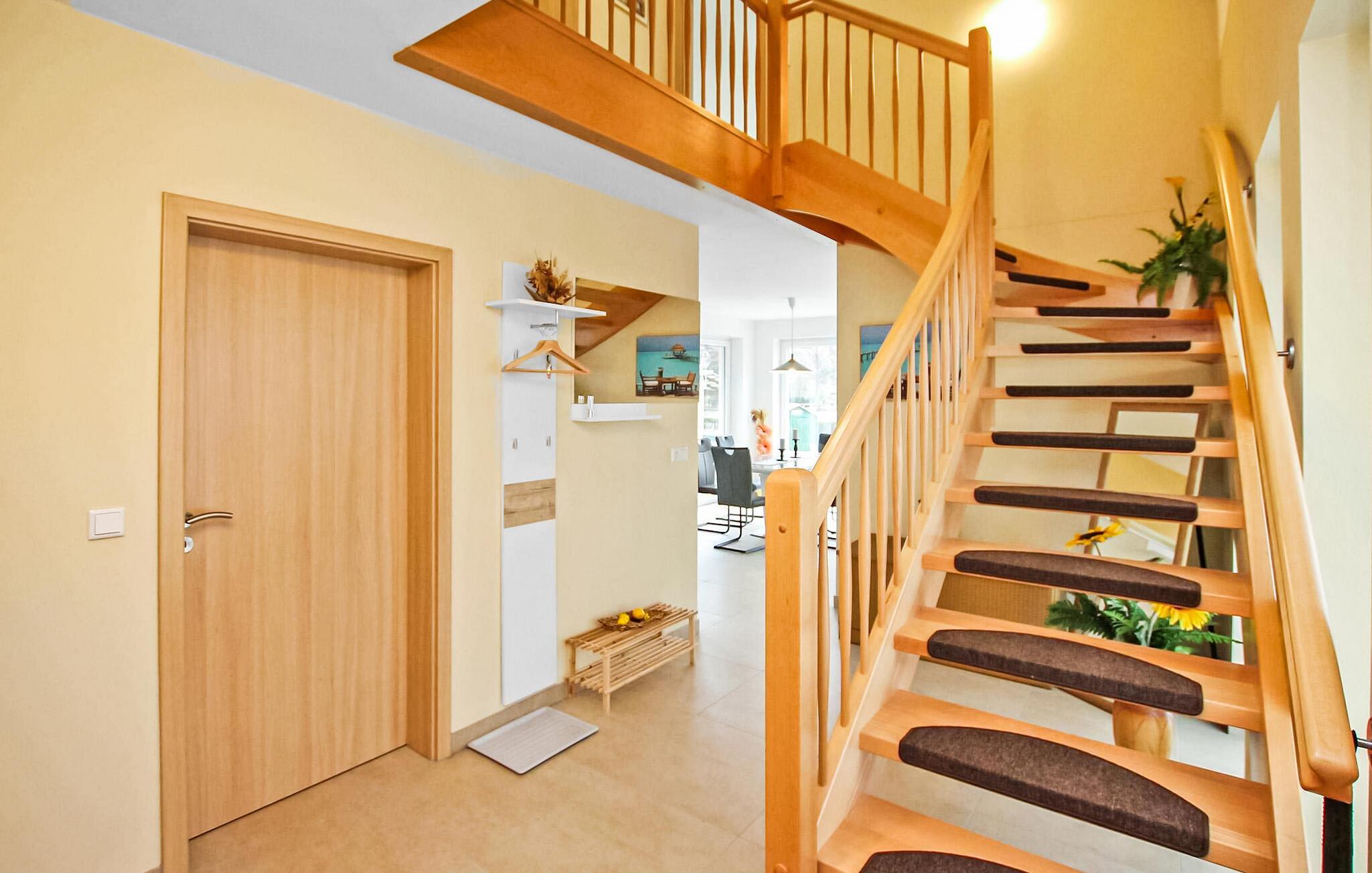Das ca. 159 qm große, mit (im EG Fußboden-)Heizung sowie Insektenschutz und elektrischen Rolläden an den Fenstern ausgestattete Nichtraucher-Haus erstreckt sich über zwei Etagen. Im Erdgeschoss befindet sich ein großer, offen gestalteter Wohnraum (Seeblick, Terrassenzugang, Schlafcouch, Radio, Esstisch) mit kompletter Küche (E-Herd mit Backofen, Kühlschrank mit Gefriermöglichkeit, Mikrowelle, Geschirrspüler, div. Küchenkleingeräte), ein Schlafraum (Doppel-Boxspringbett, Flachbild-TV, großer Kleiderschrank) und ein geräumiges Bad (ebenerdige Dusche, WC, Fön, Waschmaschine).