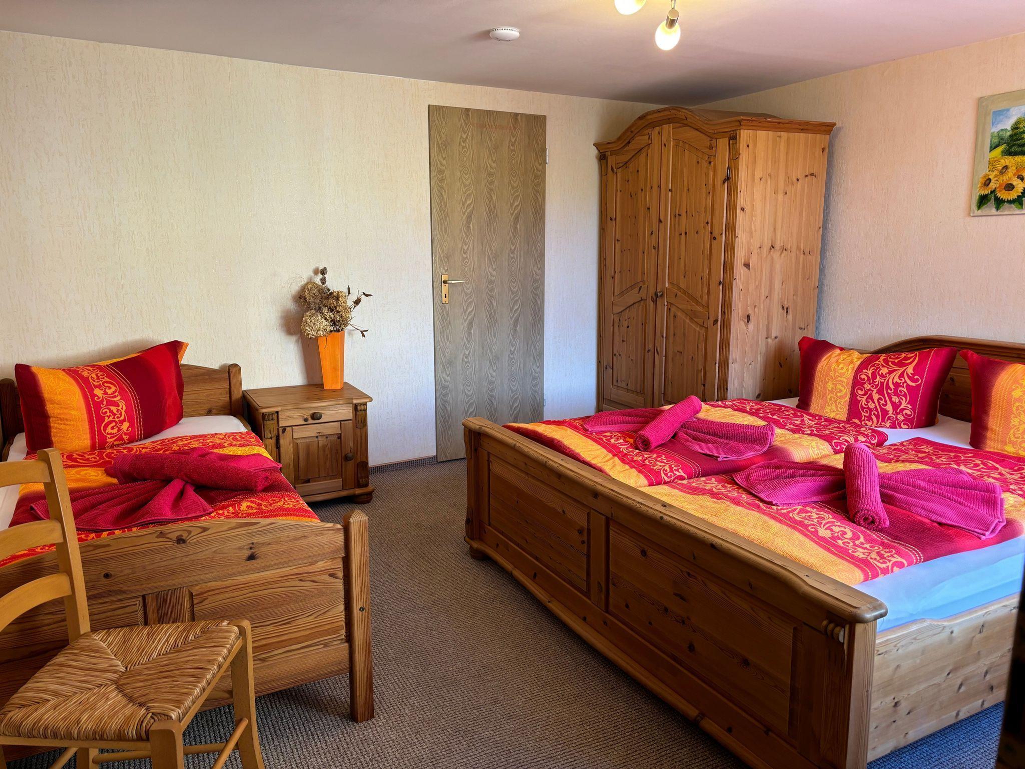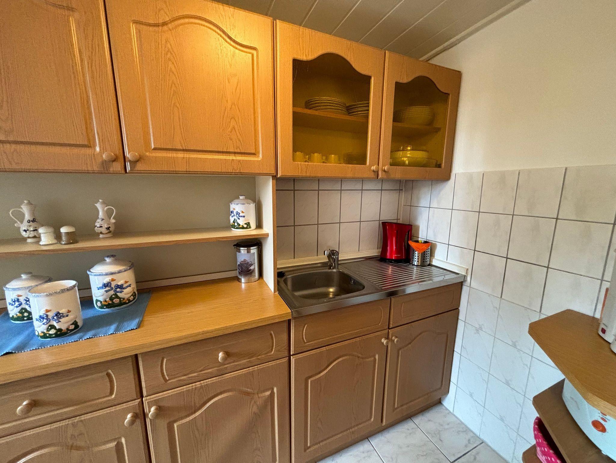 Die 46 qm große Ferienwohnung verfügt über ein Esszimmer mit Esstisch und 4 Stühlen, ein Wohnzimmer mit Sitzecke (die ausziehbare Couch bietet eine Aufbettung für 2 Personen) und TV. Die separate Küche ist ausgestattet mit einen 4-Platten-Herd, Backofen, Wasserkocher, Toaster etc. Das Schlafzimmer bietet neben einem Doppelbett, ein Einzelbett und einen Kleiderschrank. Das angrenzende Bad ist mit Dusche/WC ausgestattet.