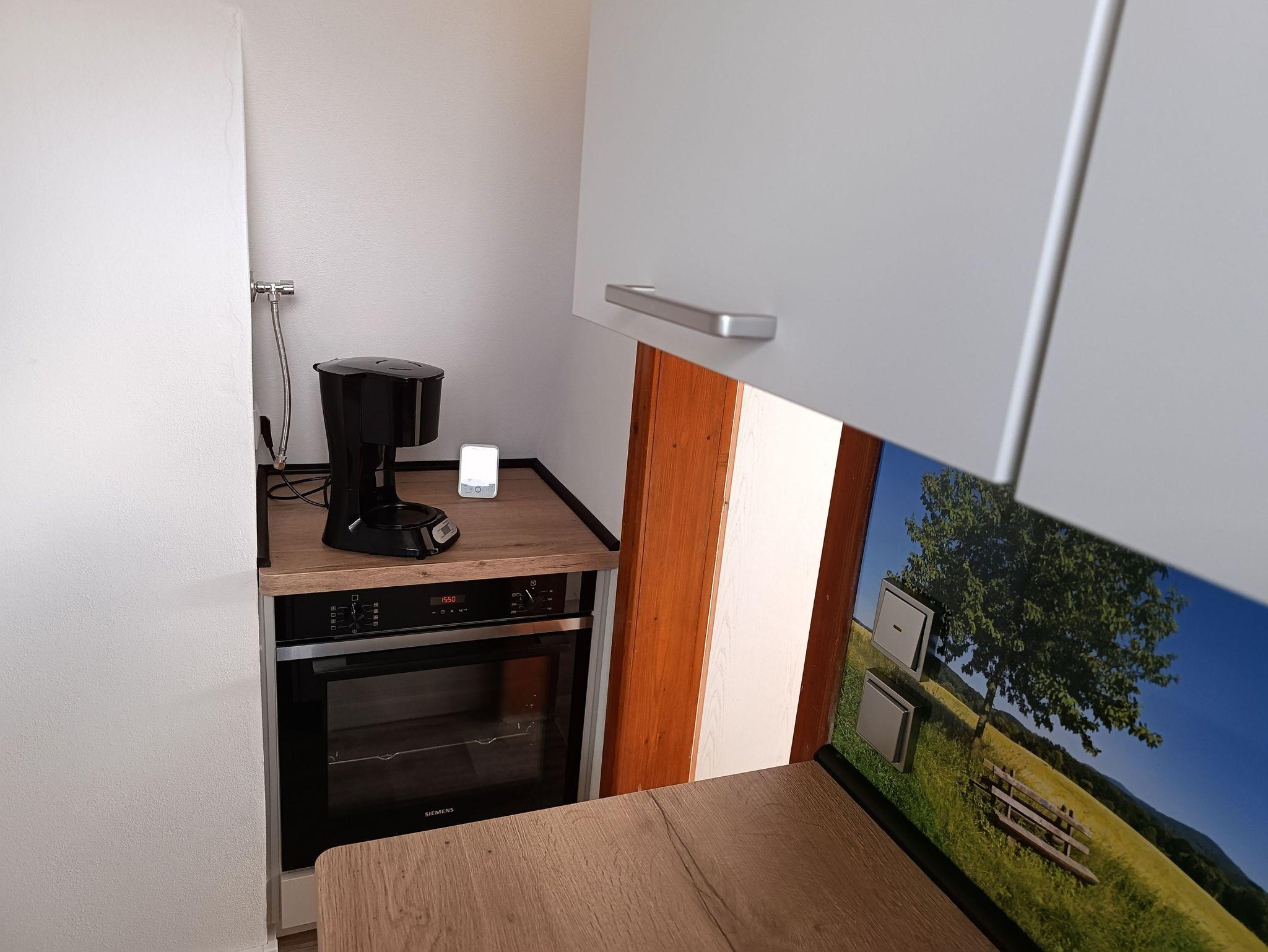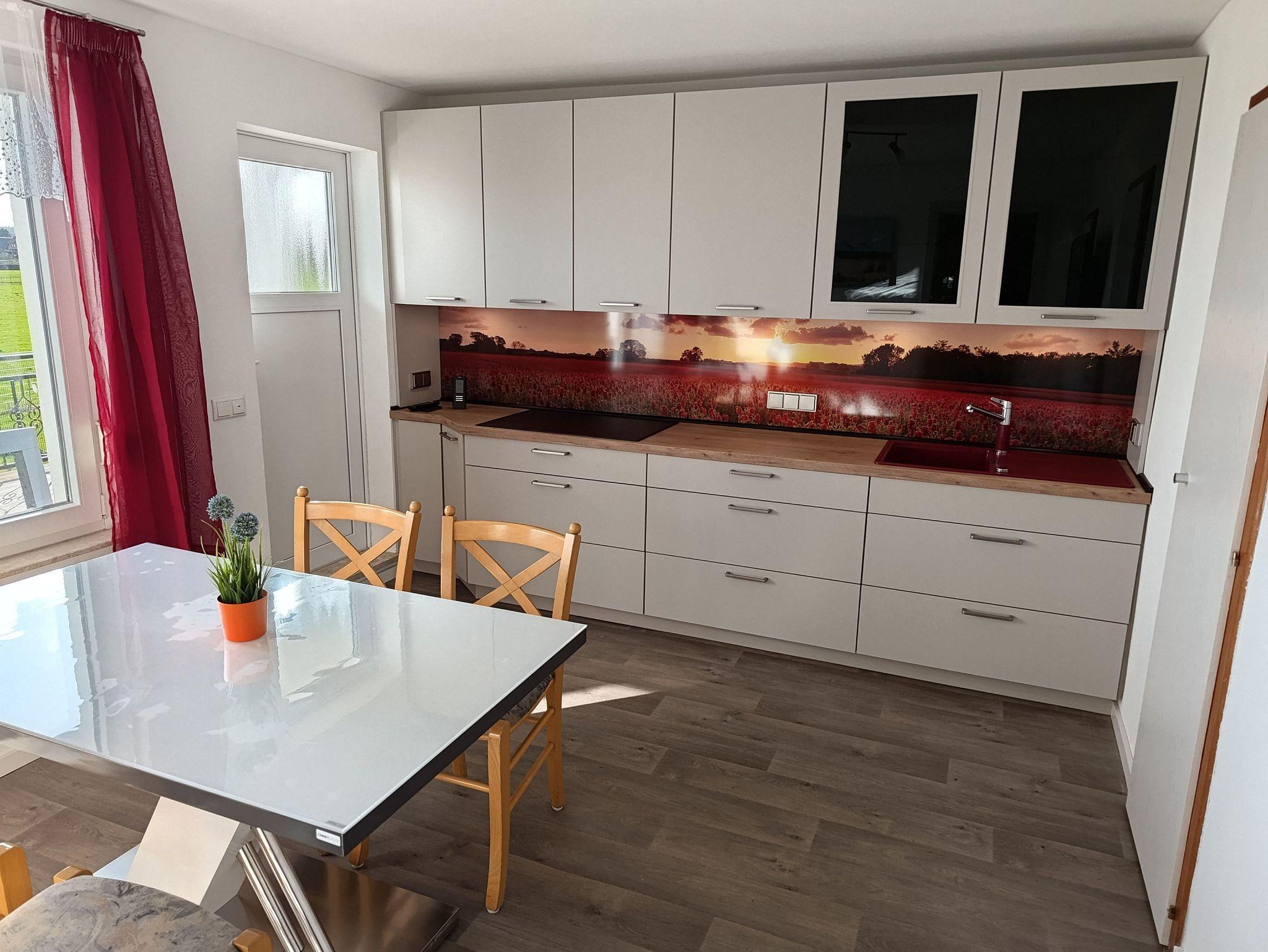 • Küche mit Mikrowelle, Backofen, Induktionsherd, Geschirrspüler und Kühlschrank