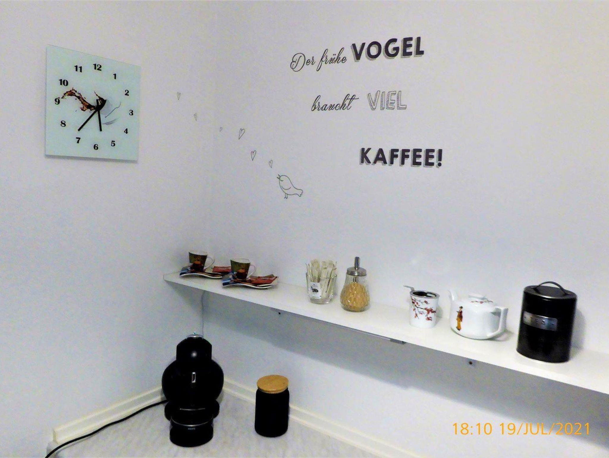 Zur Wohnungsausstattung gehören Fernseher, Radio, W-LAN, Spülmaschine, Föhn, Handtücher, Bettwäsche, Espressomaschine sowie zur Mitbenutzung Waschmaschine und Wäschetrockner.