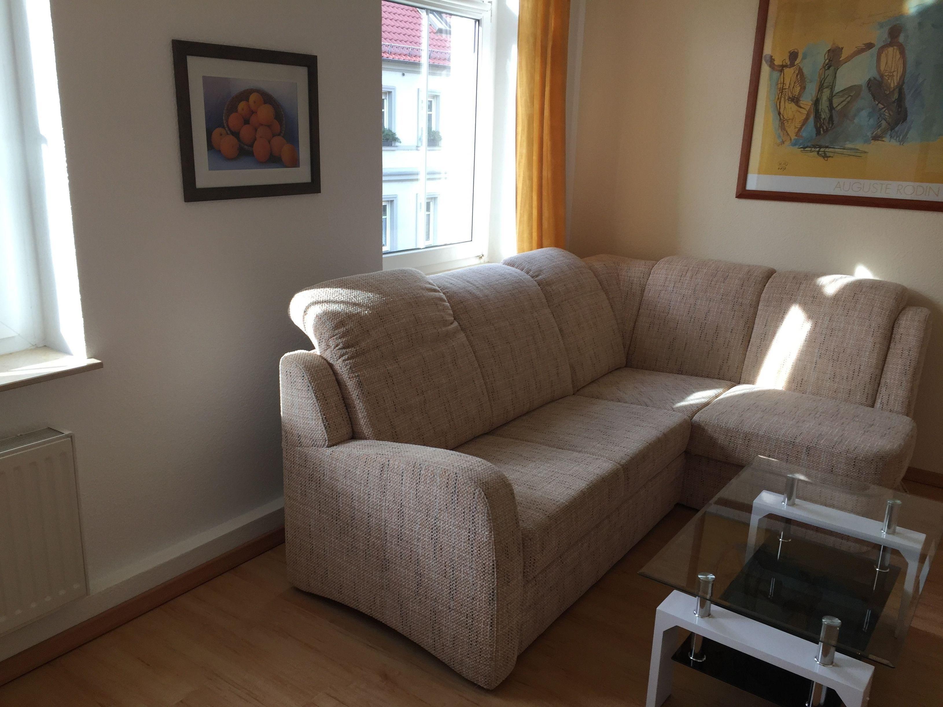 Ein Wohnzimmer mit angrenzendem kleinen Schlafraum (Bett 1,60 x 2,00 m), straßenseitig. Die Wohnküche besticht mit ihrer großzügigen Gemütlichkeit. Komplett eingerichtet mit Einbauküche und Sitzplatz. Herd mit Backofen und Ceranfeld, Spülmaschine, Kühlschrank, Kaffeemaschine, Toaster und Wasserkocher, Geschirr etc.
