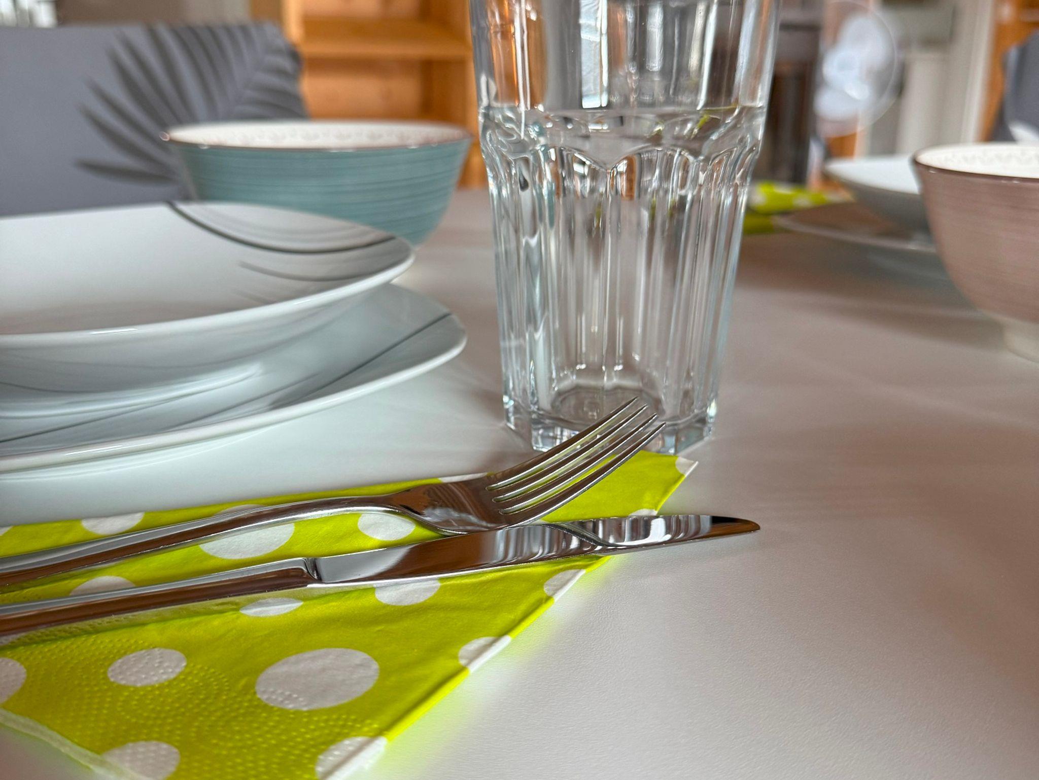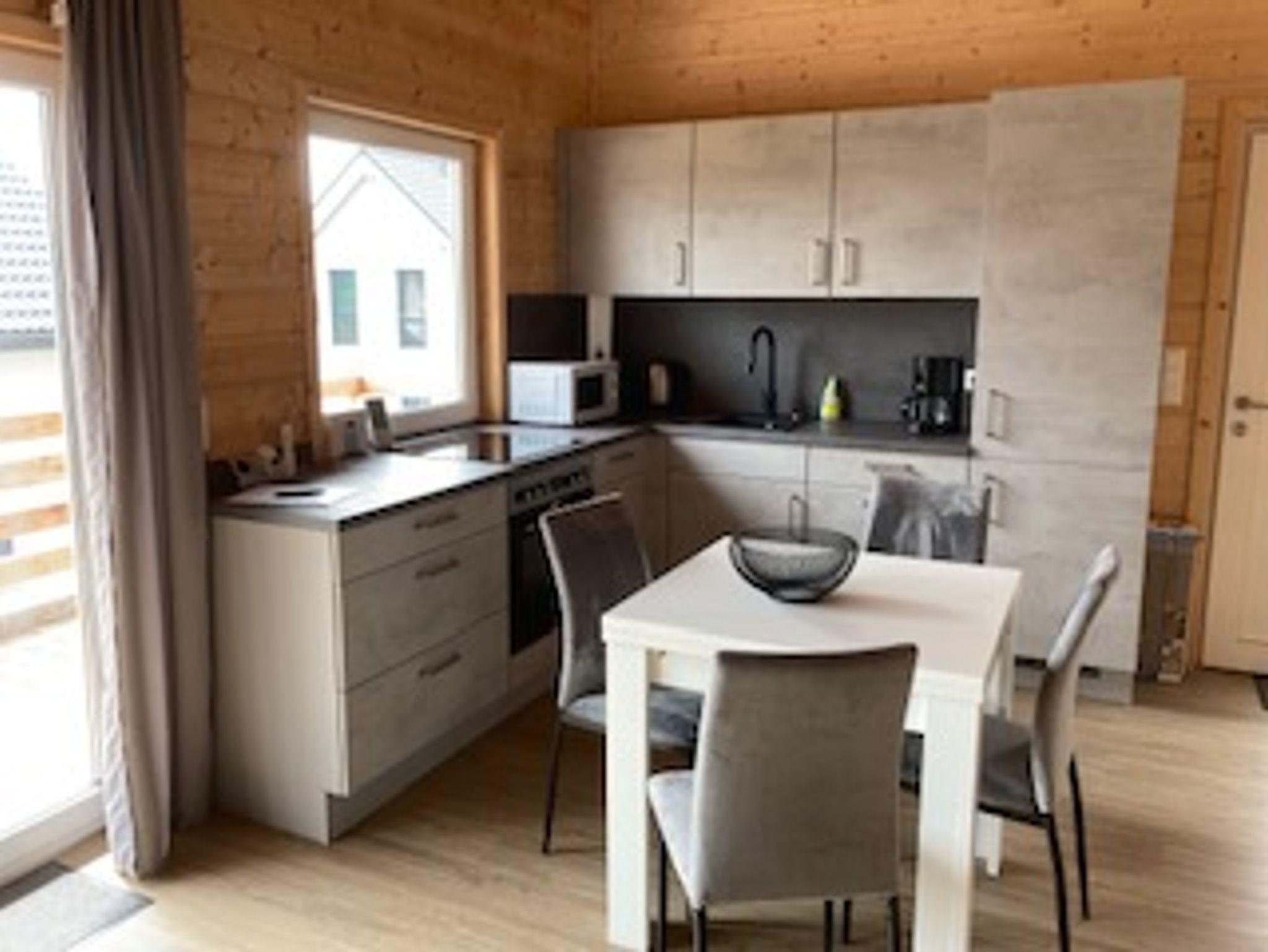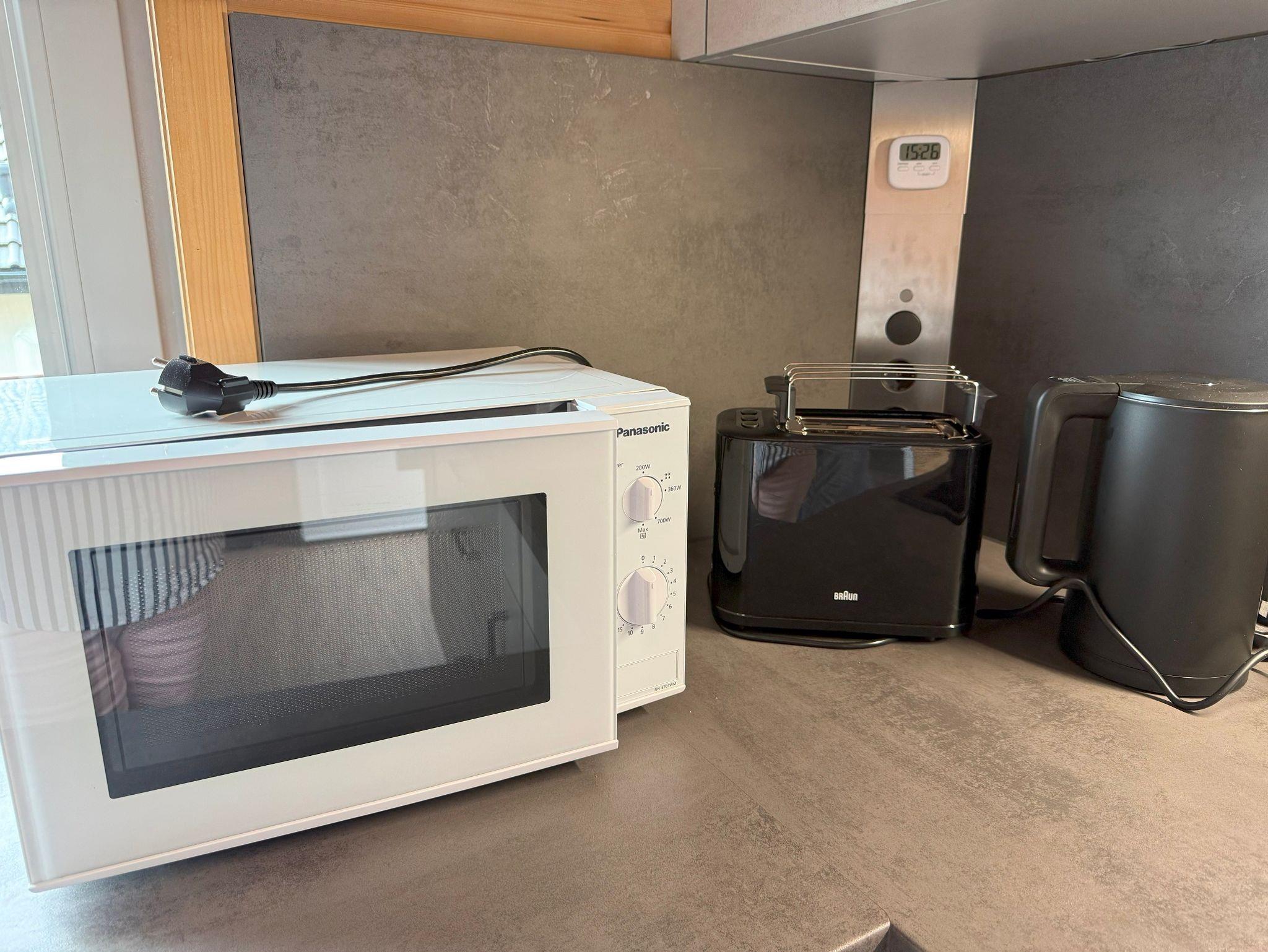 Die Küche ist mit einem Herd und Kochfeld mit 4 Platten ausgestattet. Ein Kühlschrank mit Gefrierfach, Mikrowelle, Kaffeemaschine, Wasserkocher und einem Toaster ausgestattet. Diverses Kochgeschirr, Ess- und Kaffeeservice sind genauso vorhanden wie verschiedene Gläser und Schüsseln.