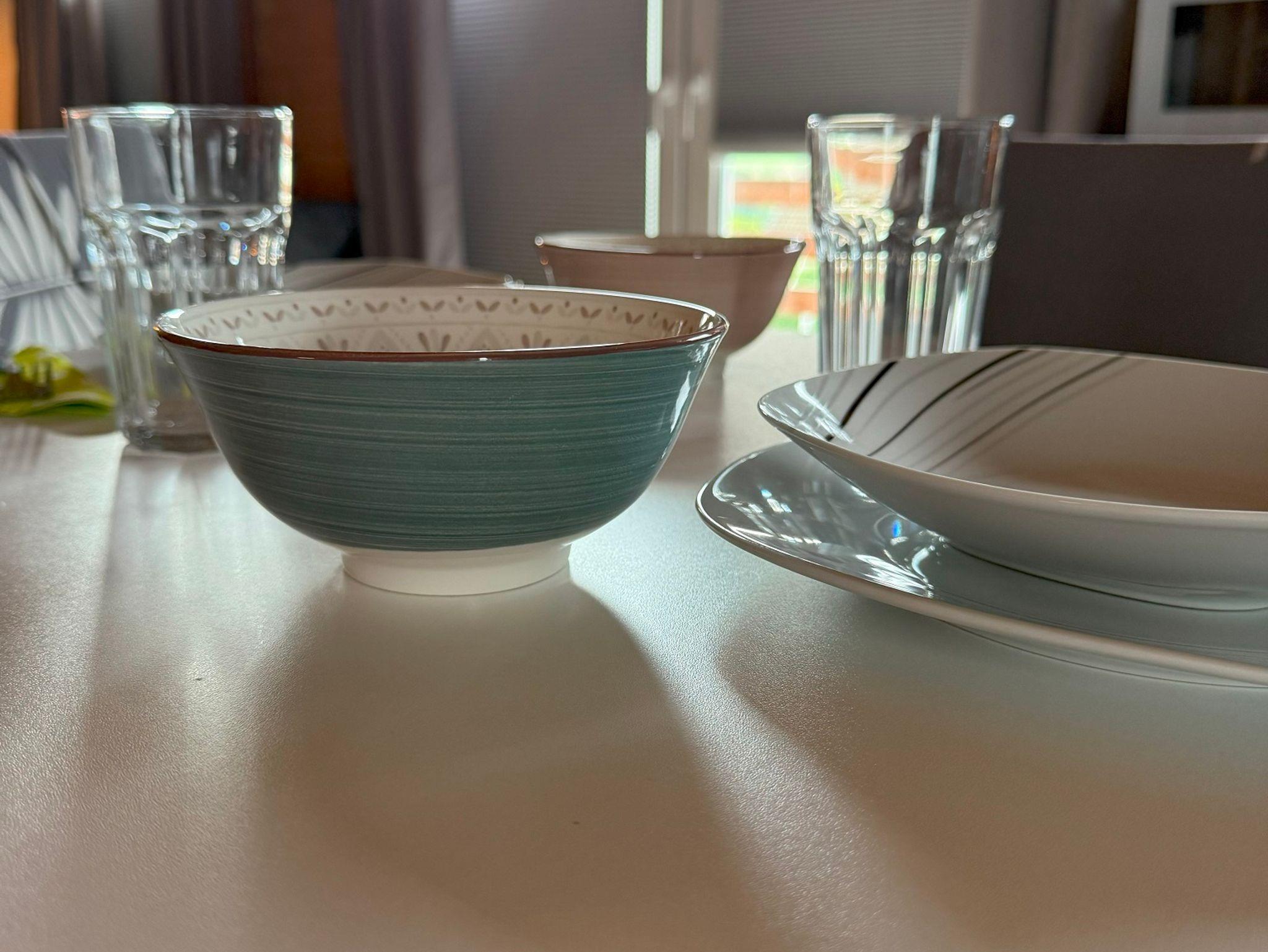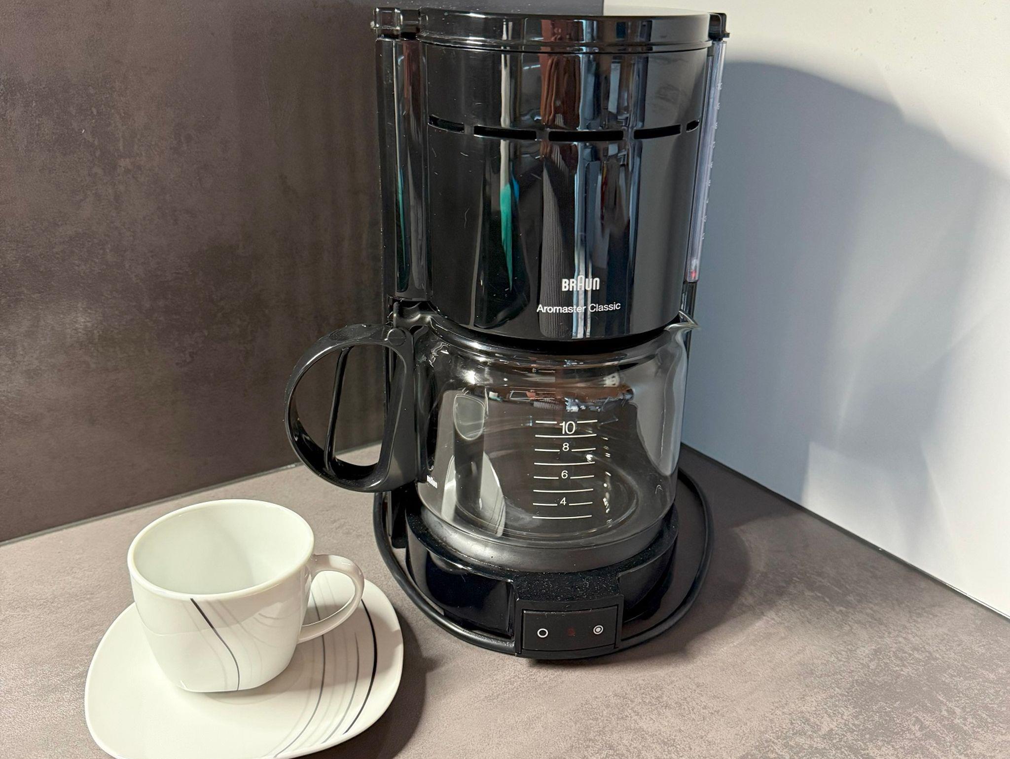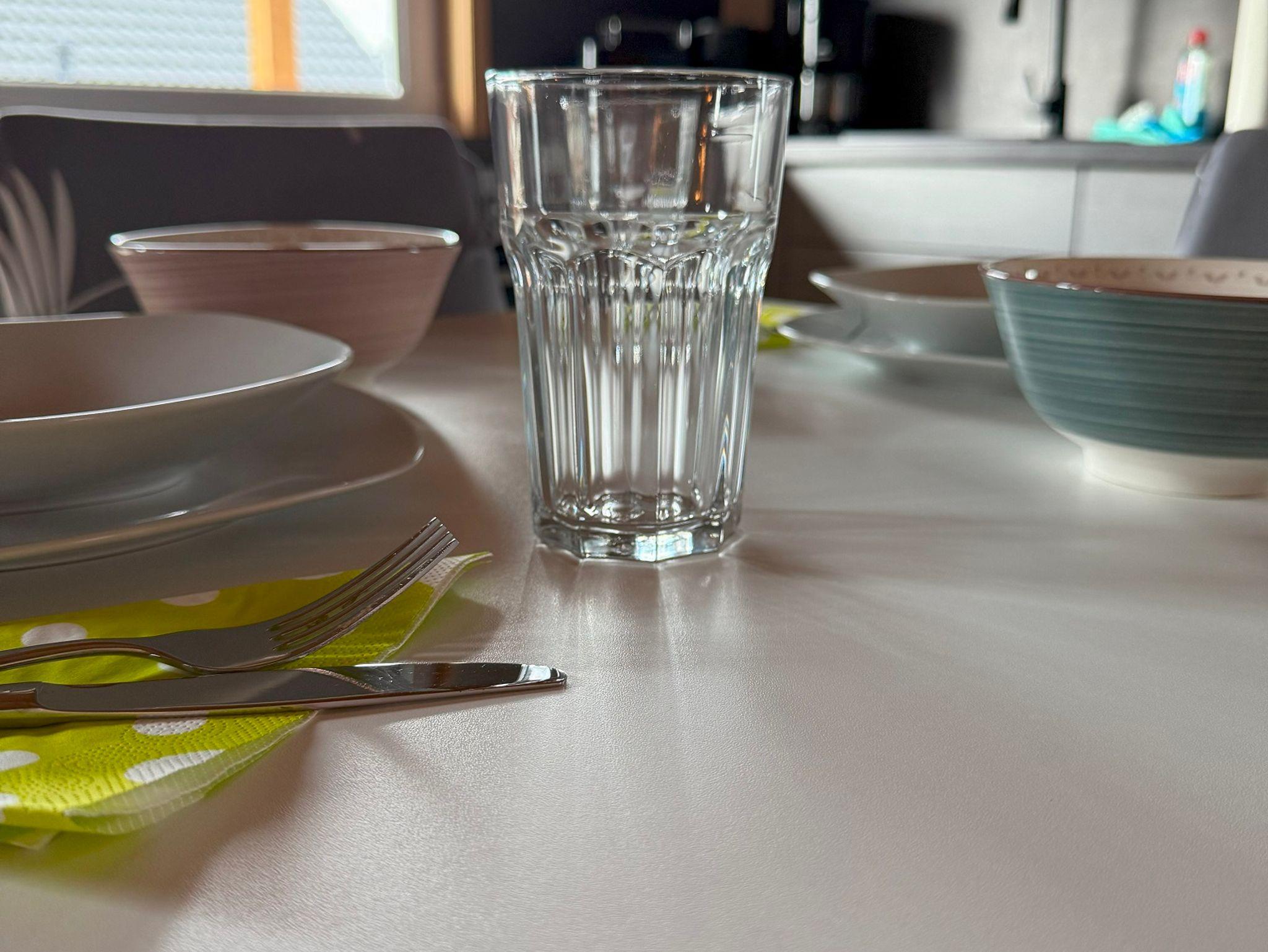 Die Küche ist mit einem Herd und Kochfeld mit 4 Platten ausgestattet. Ein Kühlschrank mit Gefrierfach, Mikrowelle, Kaffeemaschine, Wasserkocher und einem Toaster ausgestattet. Diverses Kochgeschirr, Ess- und Kaffeeservice sind genauso vorhanden wie verschiedene Gläser und Schüsseln.