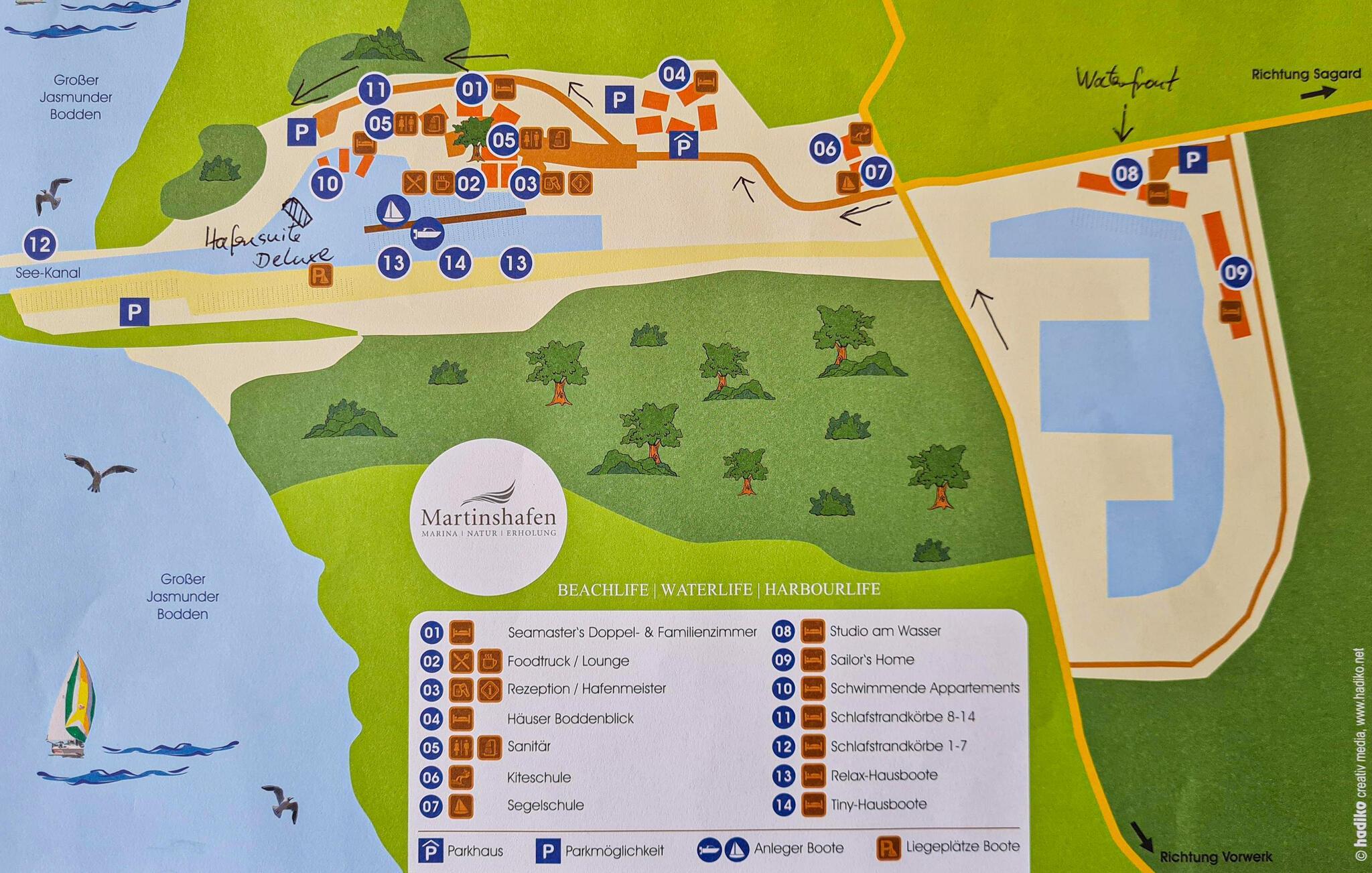 Das kleine Resort wächst steig weiter mit neuen Liegeplätzen und kleinen Suiten und Ferienhäusern in bester Wasserlage. Der Hafen liegt nur wenige Kilometer vom bekannten Inselhighlight Freilichttheater Ralswiek und einen schönen Ausflug vom Kap Arkona entfernt und bietet diverse Unterkünfte am und auf dem Wasser mit einem kleinen Hafen-Snack-Restaurant und kostenfreiem WLAN in allen Bereichen sowie kostenfreien Privatparkplätzen auf dem Marinagelände. Die größeren Orte Sassnitz und Bergen sind nach nur wenigen Minuten mit dem Auto erreichbar. Das Areal liegt ideal, um Ausflüge zum Rügendamm und der Hansestadt Stralsund zu unternehmen und verfügt über eigene kleine Strandbereiche und Wasserzugänge. Das vorhandene kleine Hafenbistro bietet einen herrlichen Blick auf Hafen und den Jasmunder Bodden und bietet eine Sonnenterrasse. Die Gegend eignet sich ideal als Ausgangspunkt für Inselerkundungen und zum Radfahren. Diverse Aktivitäten auf dem Wasser drängen sich geradezu auf. Traumhafte lange feine Sandstrände auf der Schaabe liegen nur einen kurzen Ausflug auf dem Fahrradweg entfernt. Planen Sie auch einen Ausflug nach Stralsund, dessen Hauptbahnhof und Hafen Sie gut erreichen.
