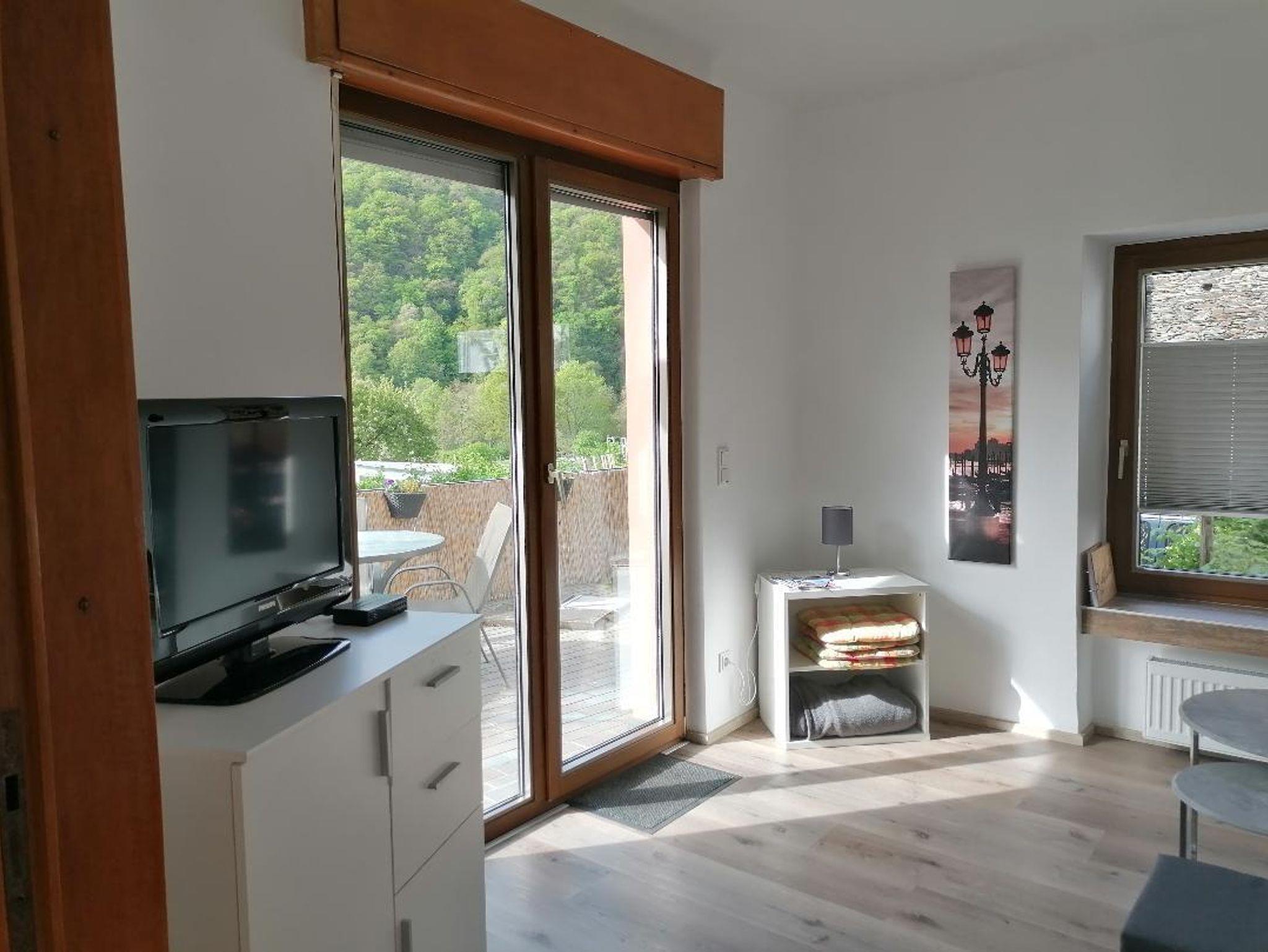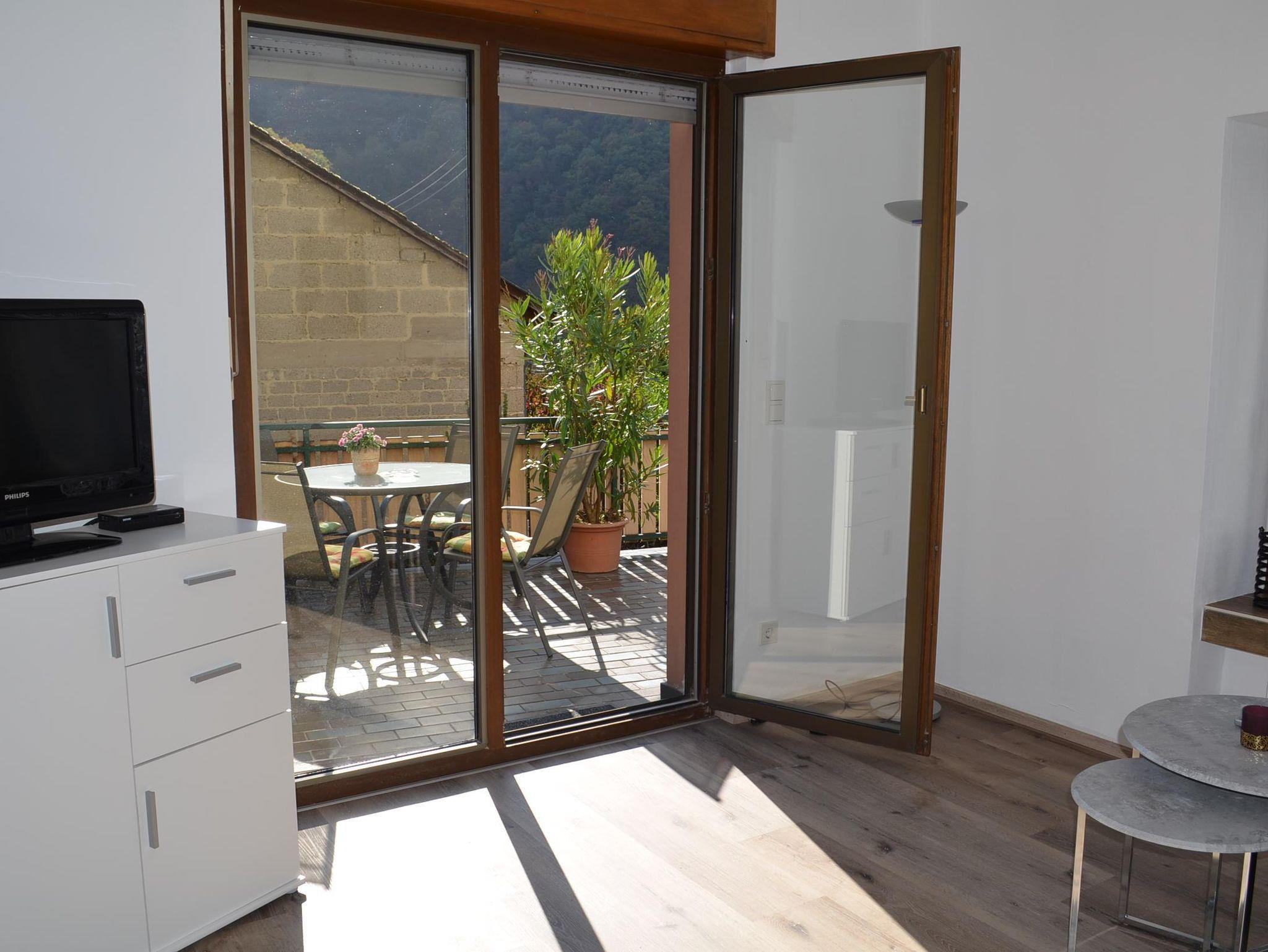 Das sonnige Wohnzimmer bietet einen Zugang zur großzügigen Terrasse mit (eingeschränktem) Moselblick.