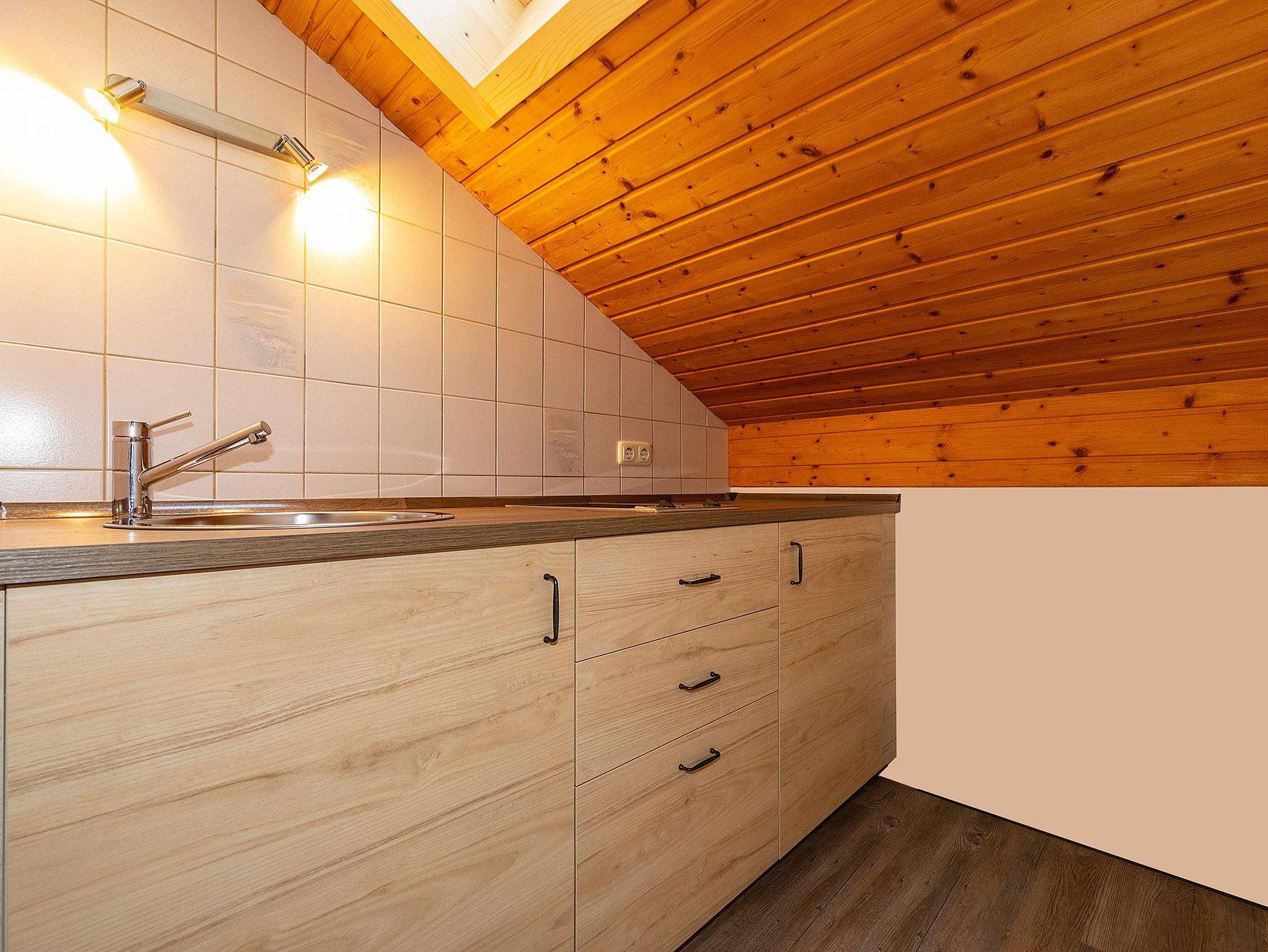 Die Wohnküche mit Mikrowelle, 2 Platten Cerankochfeld, gemütlicher Sitz- und Essecke, ist im bayerischen Stil augsestattet.