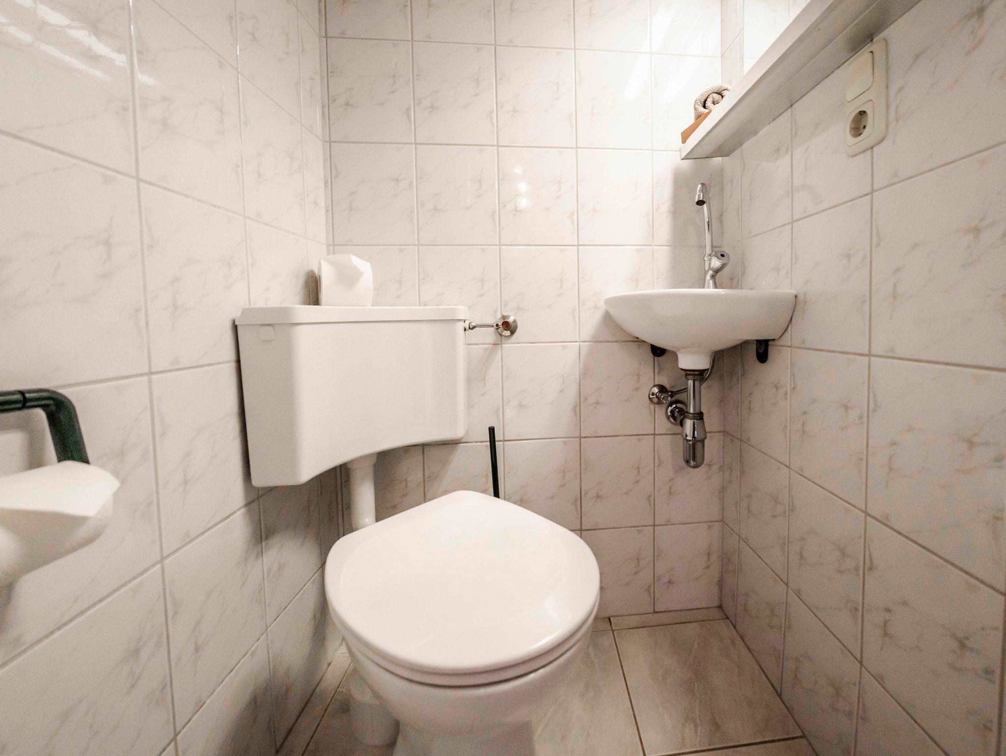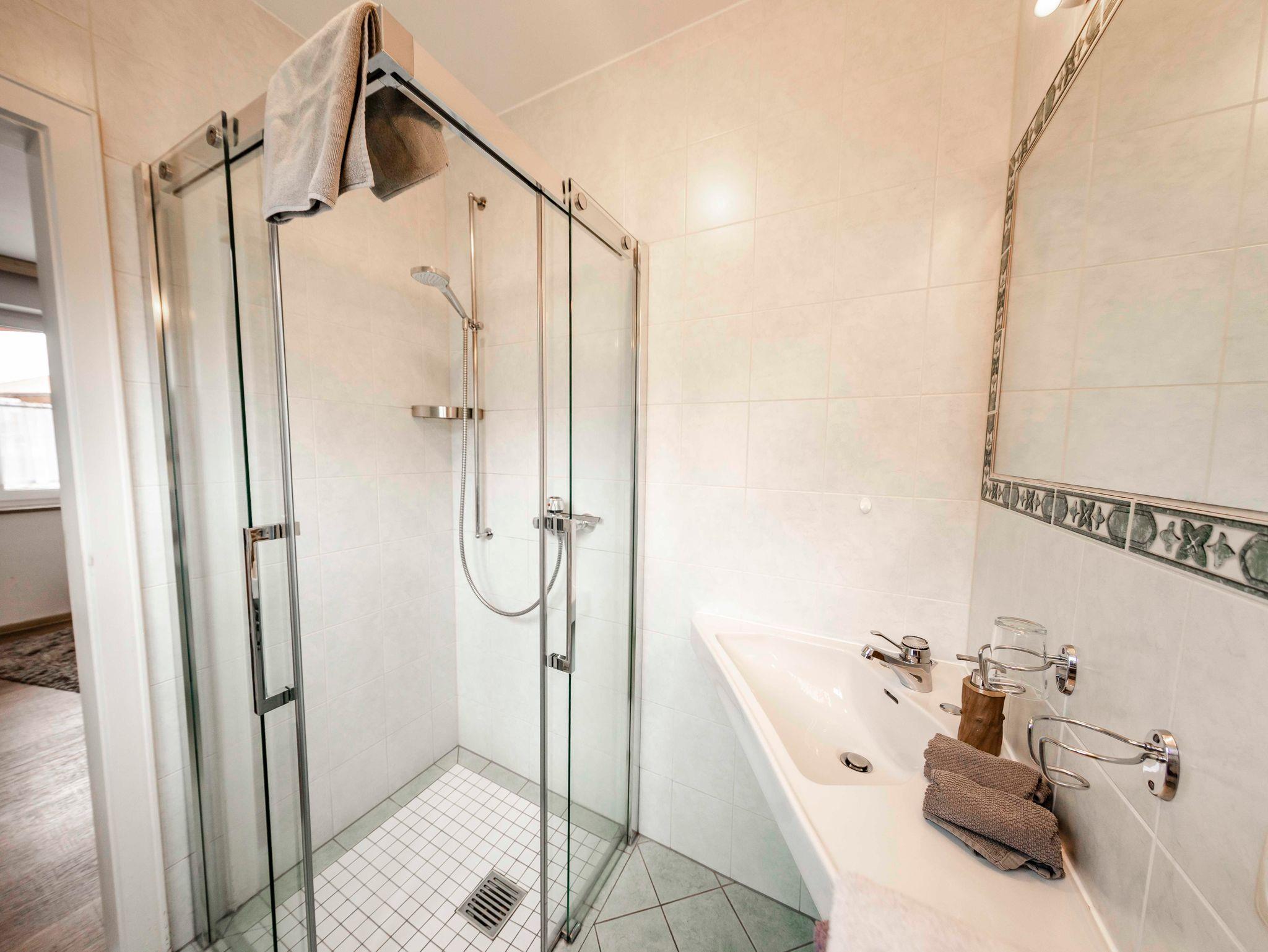 Das Badezimmer verfügt über eine Dusche, ein Waschbecken und ein WC. Zusätzlich gibt es ein separates Gäste-WC, um den Komfort für die Gäste zu erhöhen.