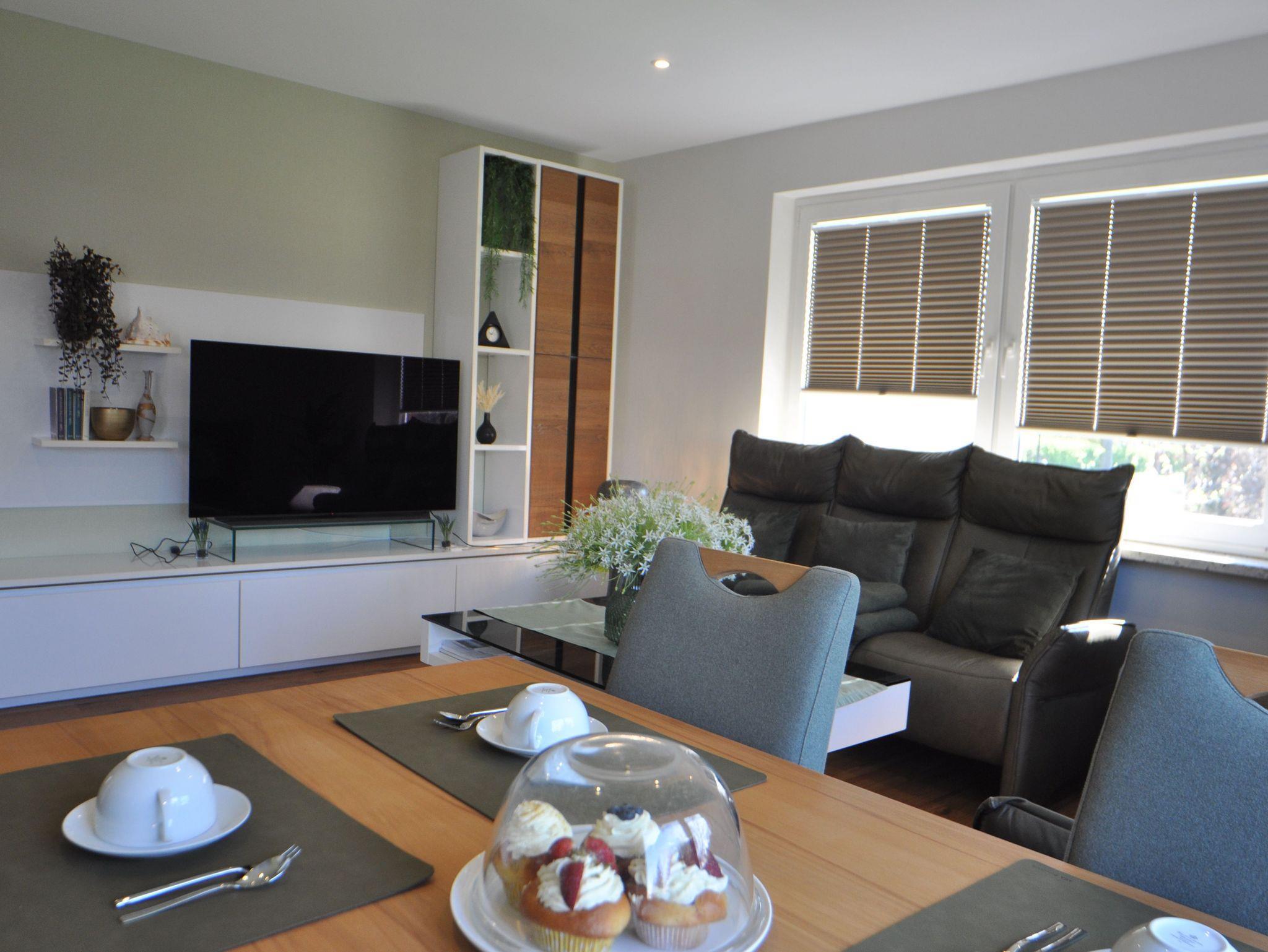 Das Haus mit Gartenanlage und Terrasse liegt in einer ruhige Wohngegend. Die Wohnung verfügt über 2 Doppelzimmer sowie ein Zimmer mit einem Einzelbett für ein Kind. Starten Sie Ihren Morgen mit einem Kaffe unseres Kaffeevollautomat (kostenfreie Kaffeebohnen). Die Küche verfügt über einen Kühlschrank mit Eiswürfelnspender. Im Wohzimmer erwartet Sie ein Zweisitzer Sofa mit Relaxfunktion. Die Buchung des zweiten Schlafzimmers bei einer Buchung von 2 Personen ist gegen einen einmaligen Aufpreis von 30 Euro zubuchbar. Parkplätze am Haus sind vorhanden. Outdoor-Tischtennis möglich.