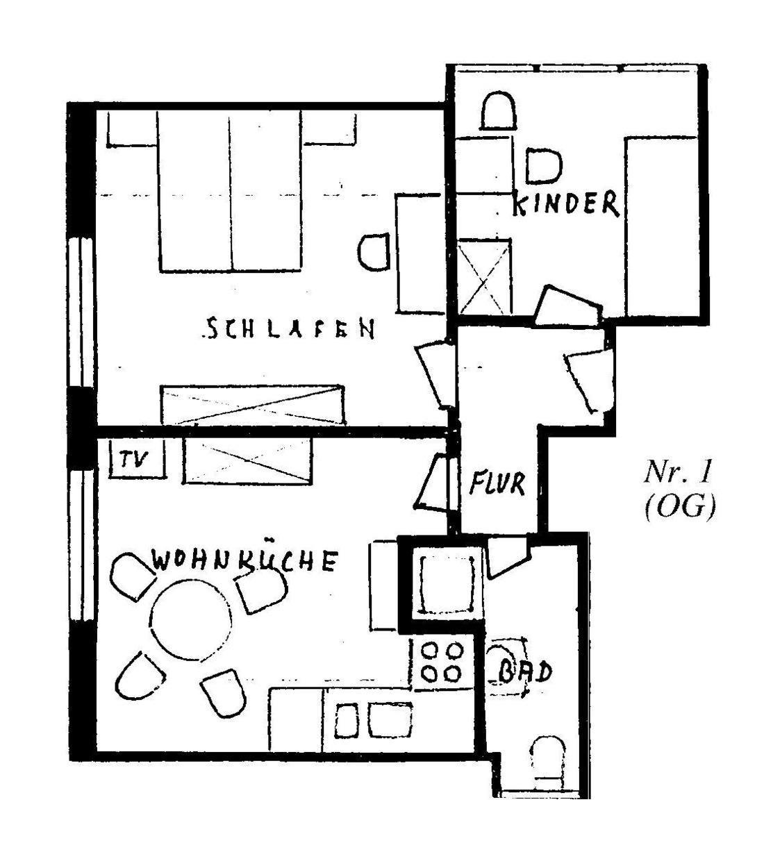 Lage im Obergeschoß links, Wohnküche und Schlafzimmer nach Osten, Richtung Wattenmeer, Kinderzimmer nach Süden, Richtung Mühle, Größe ca. 50 qm