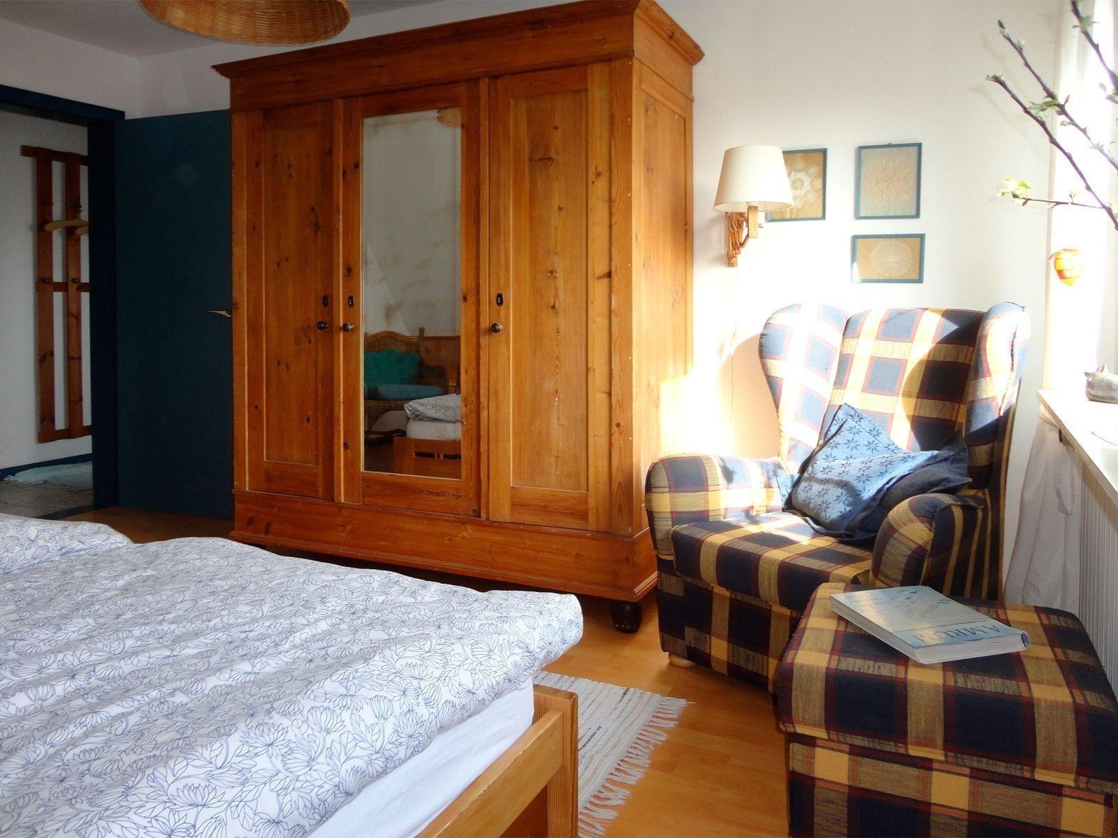 Schlafzimmer: Betten 200 x 90 cm mit Federkernmatratze, Kleiderschrank, Kommode, Babybett 120 x 60 cm, gemütlicher Lesesessel