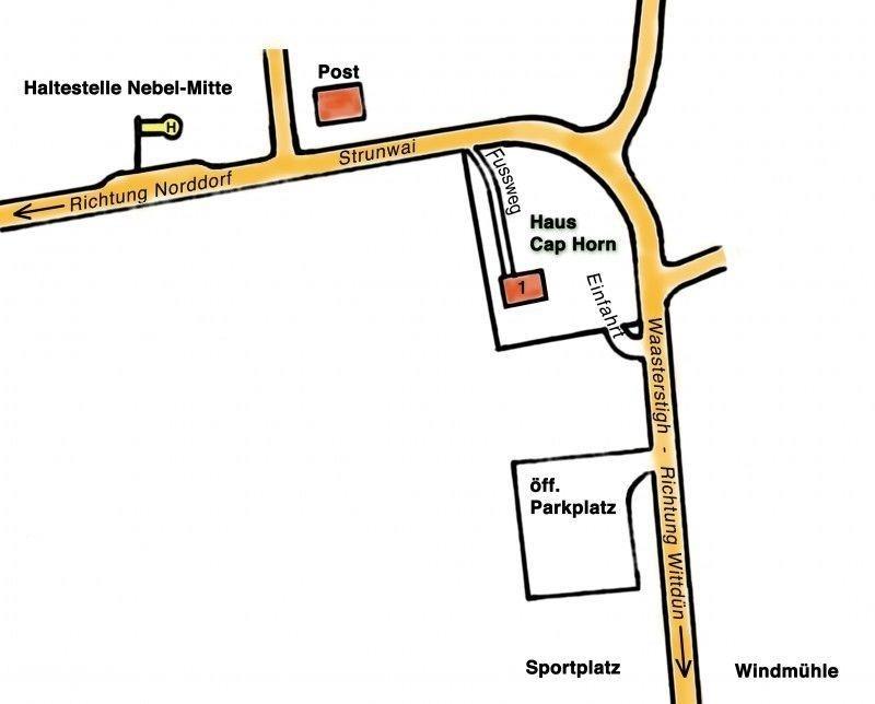Das Haus liegt am Rande des historischen Ortskerns nahe der Mühle (Bushaltestelle Nebel-Mitte). Einkaufsmöglichkeiten (Bäcker, Edekamarkt, Fisch-und Zeitungsladen), Restaurants, Arztpraxis, Kirche und Wattenmeer im Umkreis von ca.300 m.