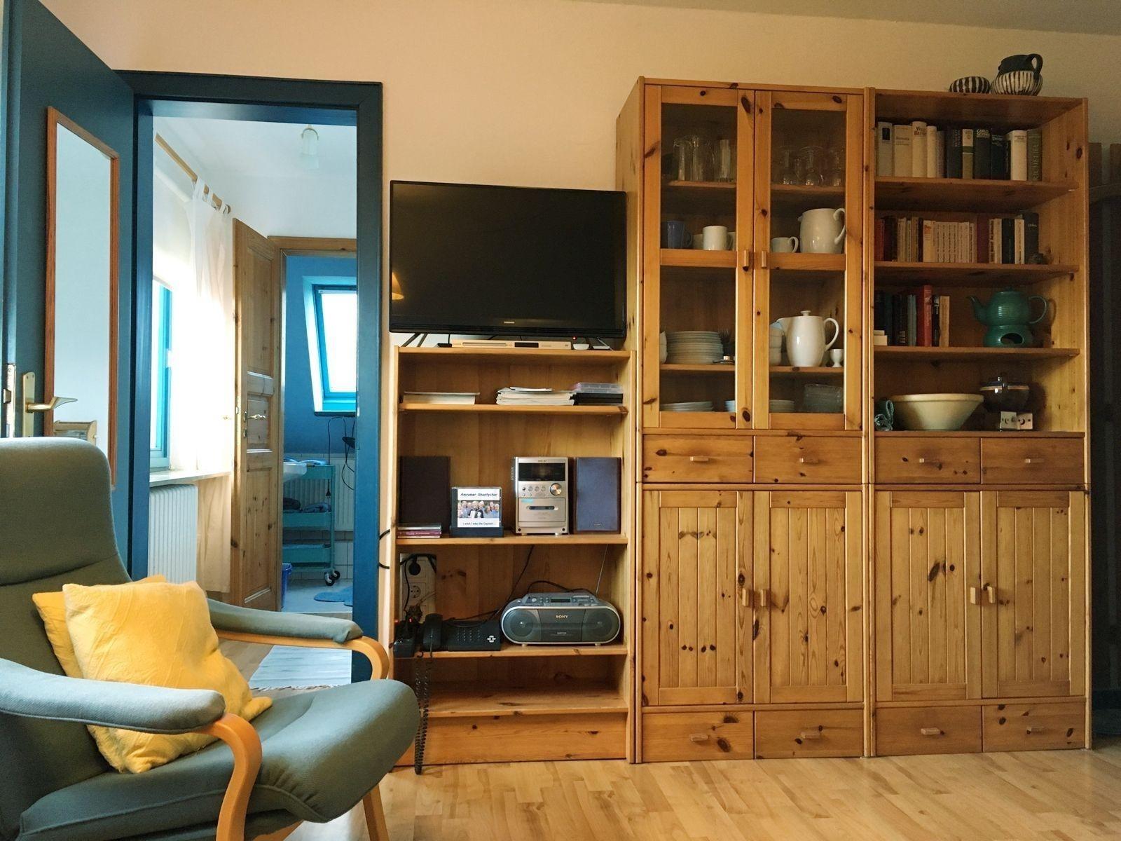 Wohnküche: Sitzgruppe mit zwei Stühlen und Eßtisch, Kiefernschrankwand mit Wäschefächern,