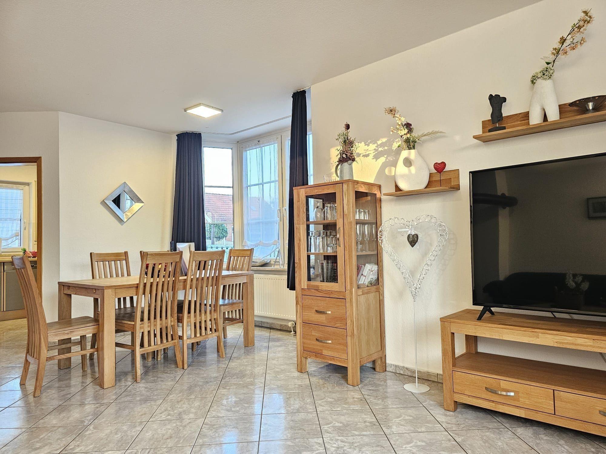 Die Ferienwohnung bietet ideale Voraussetzungen für einen erholsamen Aufenthalt. Sie umfasst drei Schlafzimmer, darunter ein Doppelbett und vier Einzelbetten, die optimalen Komfort gewährleisten. Die separate, vollständig ausgestattete Küche verfügt über einen Geschirrspüler, einen Elektro-/Gasherd, einen Backofen sowie eine Mikrowelle. Ein großzügiger Esstisch lädt zum gemeinsamen Essen ein.
