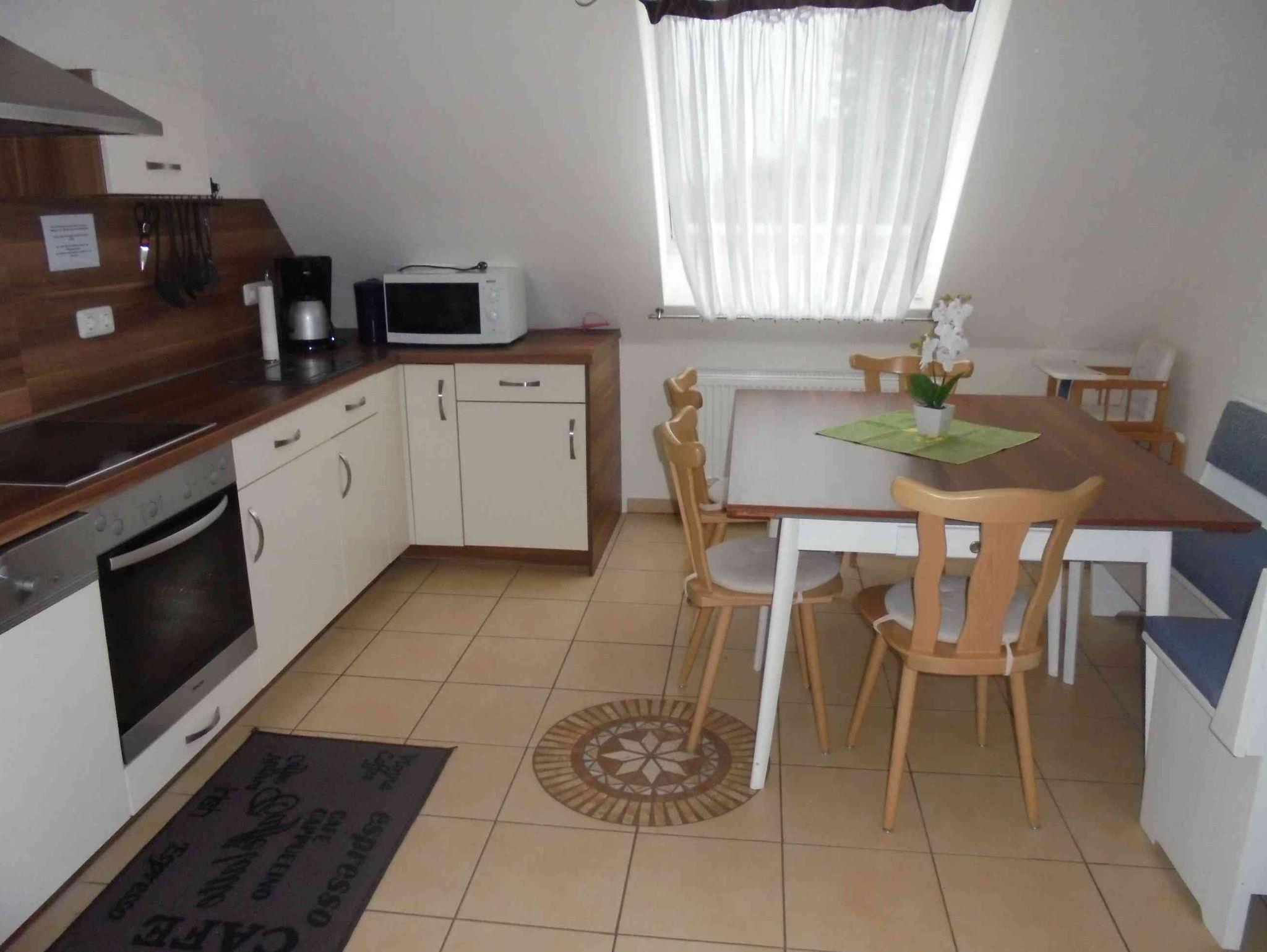 Ceranfeld/Backofen, Geschirrspülmaschine, Kühlschrank, Mikrowelle,Kaffeemaschine, Wasserkocher, Toaster, Geschirr und Besteck.Die Sitzecke mit großem Tisch und Kinderhochstuhl lässt keine Wünsche offen.Für Ihren wohlverdienten Schlaf haben wir zwei Schlafzimmer die mit Bettwäsche ausgestattet sind. Ein Doppelbettzimmer mit Kinderbett und ein Zweibettzimmer.Für unsere kleinen Gäste haben wir eine Mal- und Spielecke.Das lichtdurchflutete Badezimmer verfügt über eine große Dusche,WC, zwei Waschtischen und einen Fön. Die hauseigenen Dusch- und Handtücher stehen Ihnen gerne zur Verfügung.