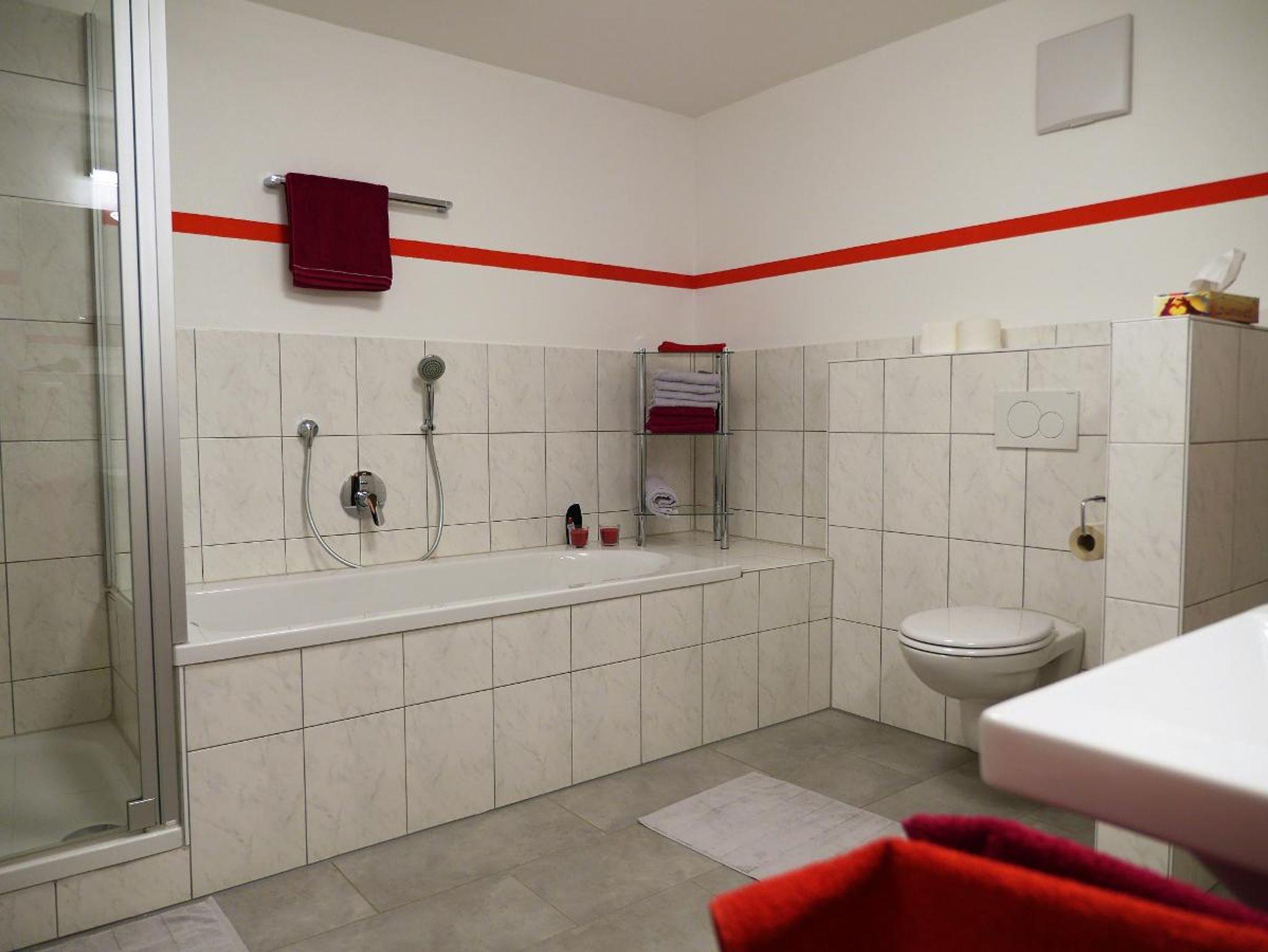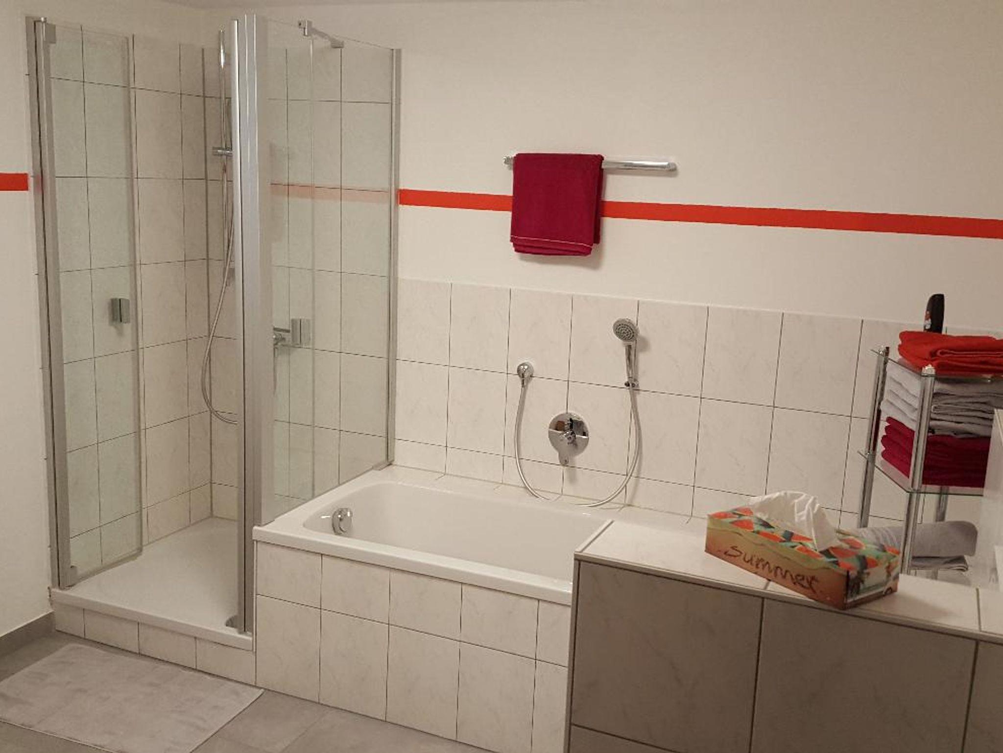 Das Bad bietet eine Dusche, eine Badewanne, ein Wand-WC, einen Waschtisch. Handtücher, Fön, Shampoo, Duschgel und Seife sind vorhanden.