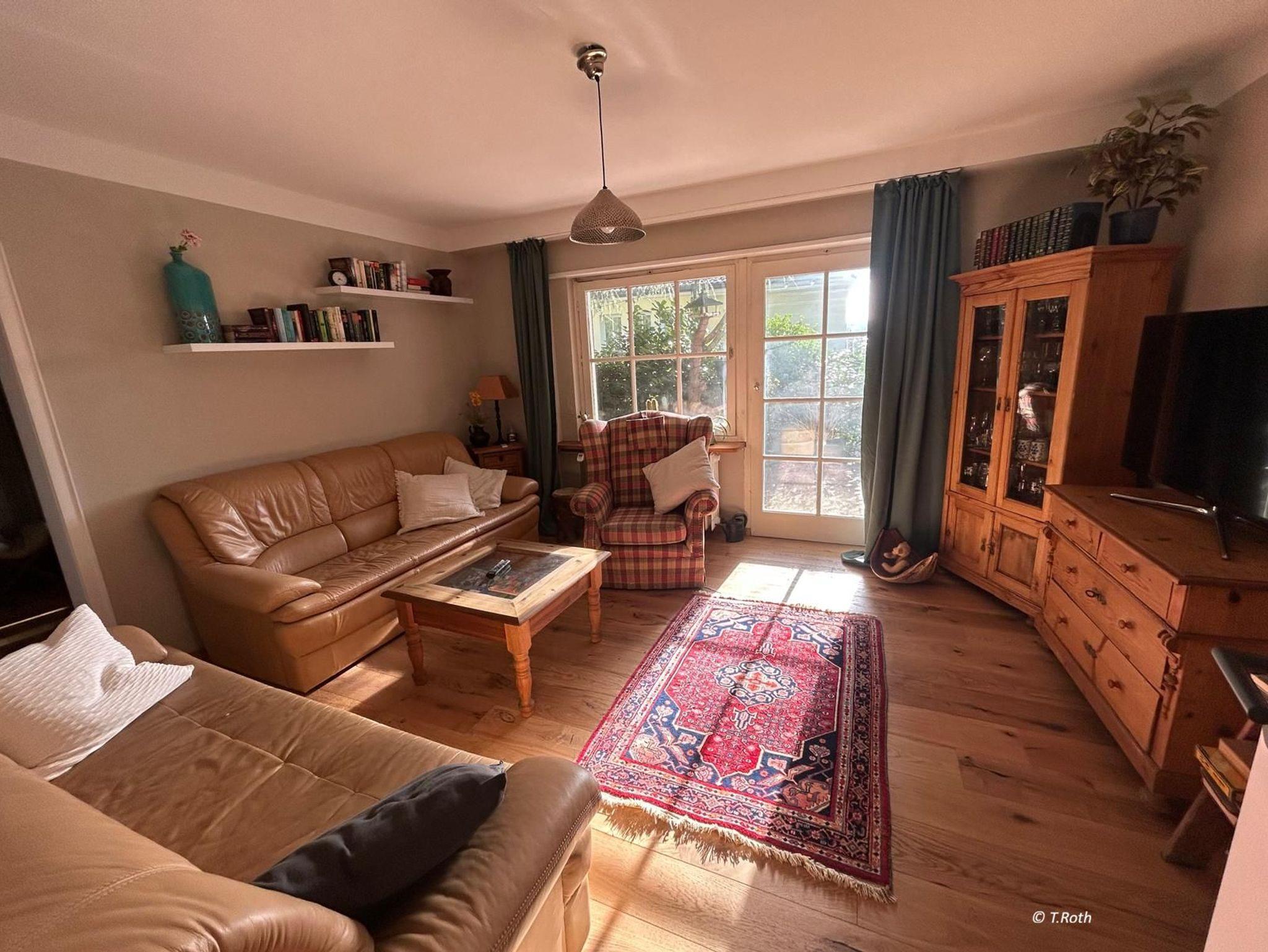 Das Wohnzimmer bietet mit TV, 2 großen Ledercouchen und einem gemütlichen Sessel viel Platz zum Entspannen, Lesen und Verweilen.