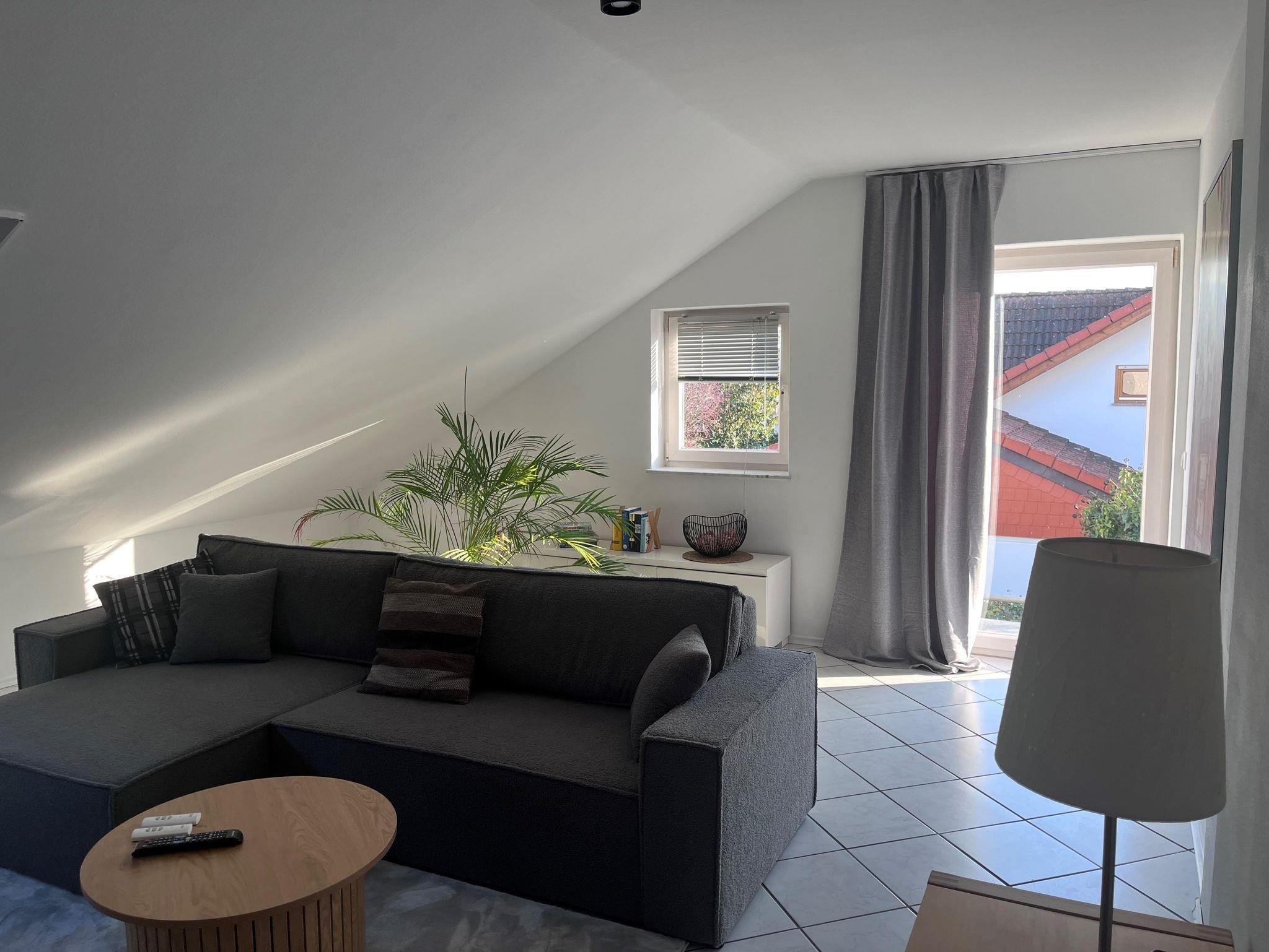 Das helle Wohnzimmer lädt zum Verweilen ein und bietet direkten Zugang zum Balkon. Von dort aus genießen Sie einen schönen Blick auf das Hambacher Schloss und die umliegende Landschaft. WLAN, Fernseher und gängige Haushaltsutensilien sind vorhanden.