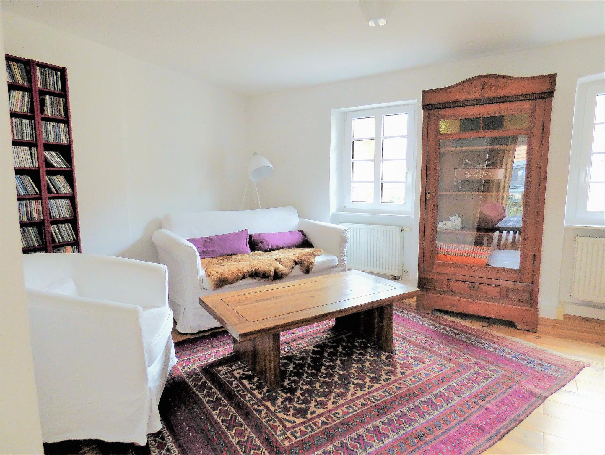 Die Ferienwohnung Goldberg erstreckt sich über zwei Stockwerke. Im Untergeschoss befindet sich eine kleine gemütliche und großzügig ausgestattete Wohnküche mit Blick auf das Leben in der Dorfstrasse. Ebenso im Grundgeschoss, unter dem Treppenaufgang, befindet sich das Bad. Dementsprechend ist es sehr klein und ganz sicher ein Raumwunder - mit moderer Ausstattung! Über eine geschwungene Holztreppe gelangt man in das Obergeschoss. Hier liegt das ruhige Schlafzimmer mit Ausgang zu einem kleinen Balkon mit Blick auf den Hof. Durch eine Schiebetür betritt man ein geschmackvoll eingerichtetes Wohnzimmer mit CD-Sammlung. In allen Zimmern liegen teils die alten, teils neue Holzdielen. Auf Wunsch steht in dieser Wohnung ein extra Raum zur Nutzung zur Verfügung.