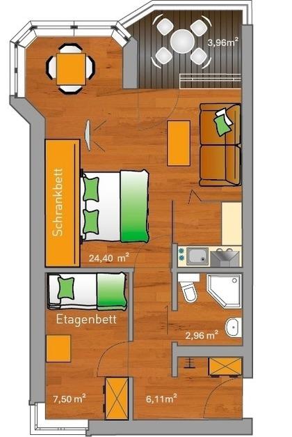 In der 1. Etage bieten Ihnen 41 m² Wohnfläche allen Komfort für max. vier Personen, der einen erholsamen und wirklich besonderen Urlaub ausmacht. Genießen Sie die wundervolle Aussicht vom Balkon. Das Wohnzimmer ist ausgestattet mit einer Sitzgarnitur, einem Essplatz für vier Personen sowie einem elektrisch ausfahrbaren Doppelbett (1,80x2,00 m), das auf Wunsch und Knopfdruck unsichtbar wird. Die Gaube, die einen sehr schönen Blick auf das Wasser bietet, verleiht dieser Wohnung einen ganz besonderen Charme.