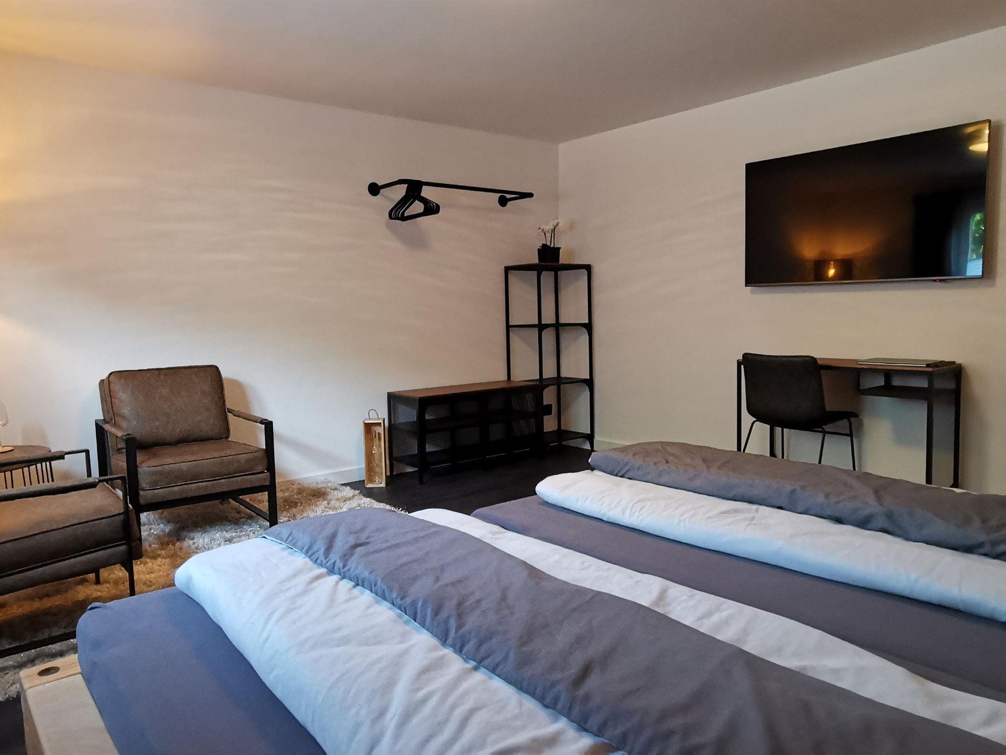 Ausgestattet ist die komplett kernsanierte Unterkunft mit einem King-Size-Bett (180 x 200 cm) inkl. Matratzenschoner, einer gemütlichen Sitzecke mit 2 Sesseln, einem 55” Smart-TV mit Ambilight, einem Schreibtisch und kostenlosem WLAN.