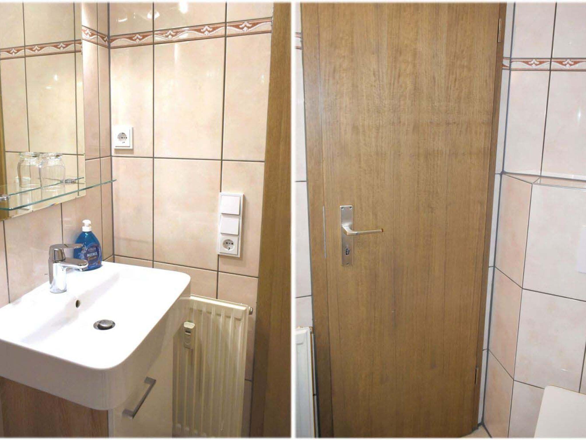 Bad 1: Dusche, Duschkabine, Handtuchhalter, Spiegel, Waschtisch mit Unterschrank, WC