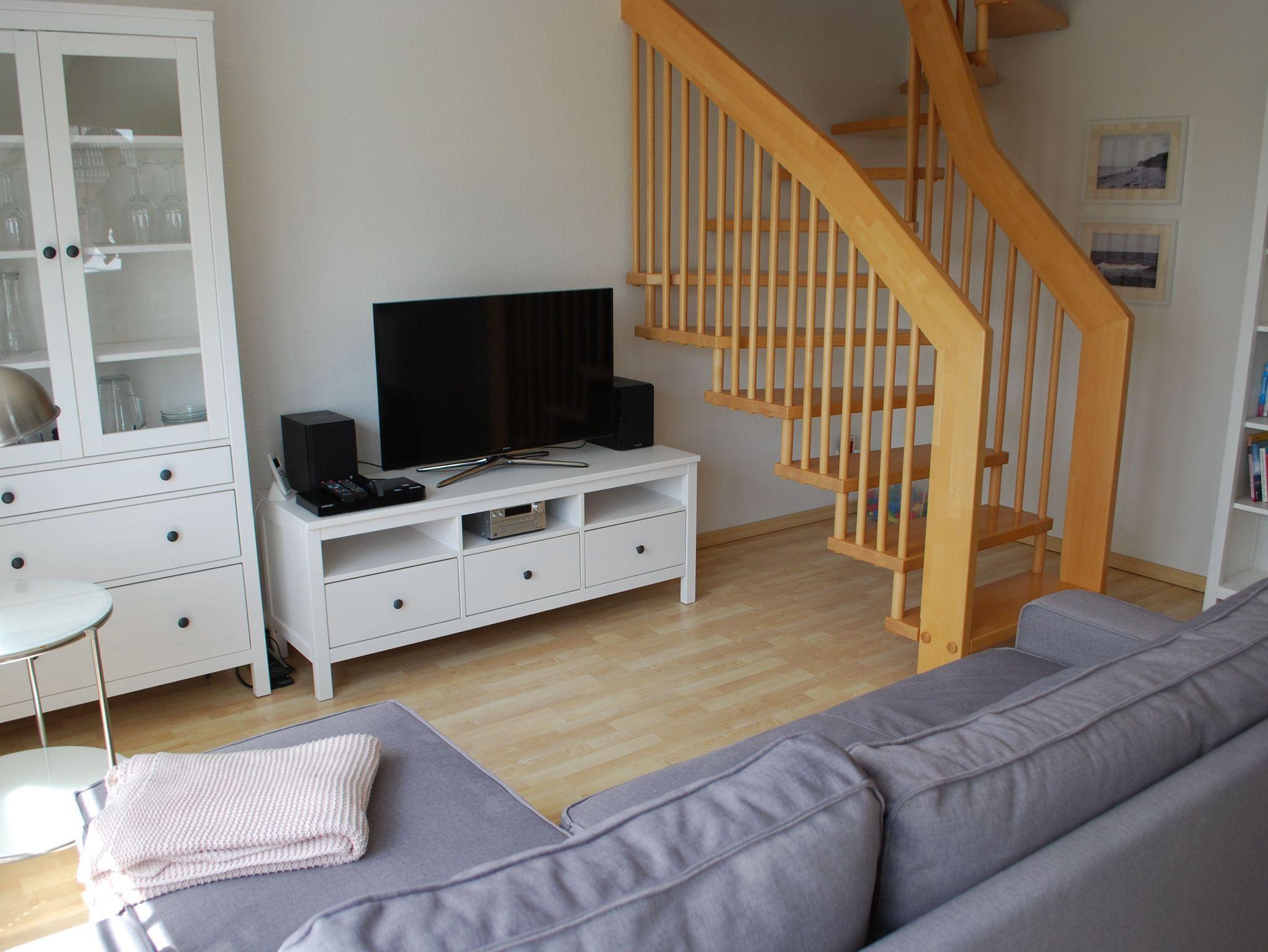 Zur Wohnung gehört eine Einbauküche mit Backofen, Kühlschrank inkl. Gefrierfach und Geschirrspülmaschine. Die im Bad befindliche Waschmaschine können Sie kostenfrei nutzen. 3D Flachbildschirm TV, Stereoanlage, Blu-Ray und DVD Player sind vorhanden. Ein frei verfügbarer mega schneller DSL Anschluß (100.000 kbit/s) mit W-LAN sorgt für den Kontakt in die weite Welt. Gebührenfreie Anrufe ins deutsche Festnetz können über das bereitgestellte Telefon getätigt werden. Haben Sie zu vier Personen mehr an Bord, so buchen Sie einfach die im Haus befindliche Erdgeschoßwohnung „Steilküste“ dazu. Das 3 Raum Appartement verfügt über zwei Schlafzimmer, eines mit 2 Einzelbetten im Dachgeschoss und ein weiteres mit Doppelbett. Unser Wohnzimmer verfügt über eine geräumige Schlafcouch. Die bereitgestellten 2,2 m langen Bettdecken sorgen für ein kuscheliges Schlafvergnügen. Für unsere kleinen Gäste stellen wir gerne kostenfrei Reisebabybettchen und Kinderhochstuhl zur Verfügung. Wir bitten Handtücher und Bettwäsche mitzubringen. Hiermit weisen wir daraufhin das keine Vermietungen an gewerbliche Gäste möglich ist.