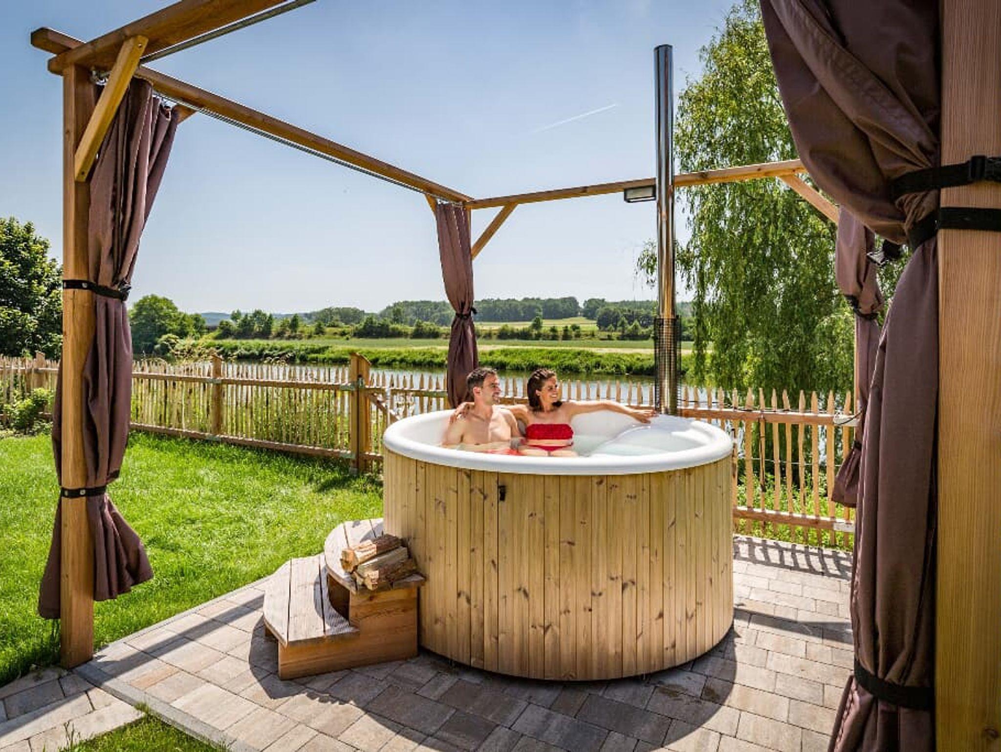Übernachten Sie bei uns in Holzferienhäusern am Flussufer mit Kamin, großer Terrasse, Balkon, kleinem eingezäunten Garten und eigenem Hot Tub oder in einer von sieben gemütlichen Ferienwohnungen mit romantischem Kreuzgewölbe.