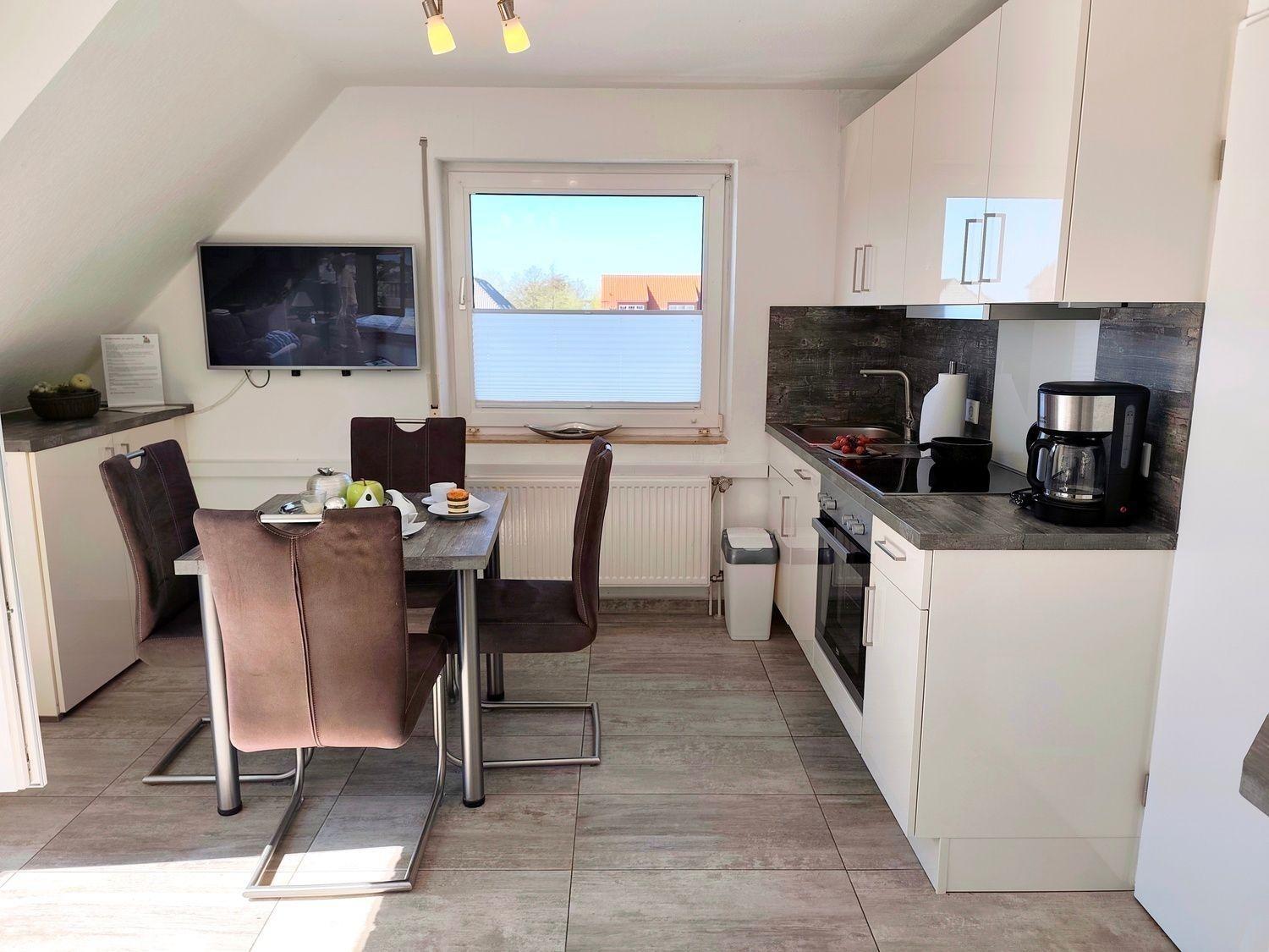 Die Wohnküche mit neuer, heller Küchenzeile ist mit Ceranfeld, Backofen, Mikrowelle, Kühlschrank mit Eisfach, Spülmaschine, Kaffeemaschine, Wasserkocher sowie die Utensilien für den täglichen Gebrauch gut ausgestattet.