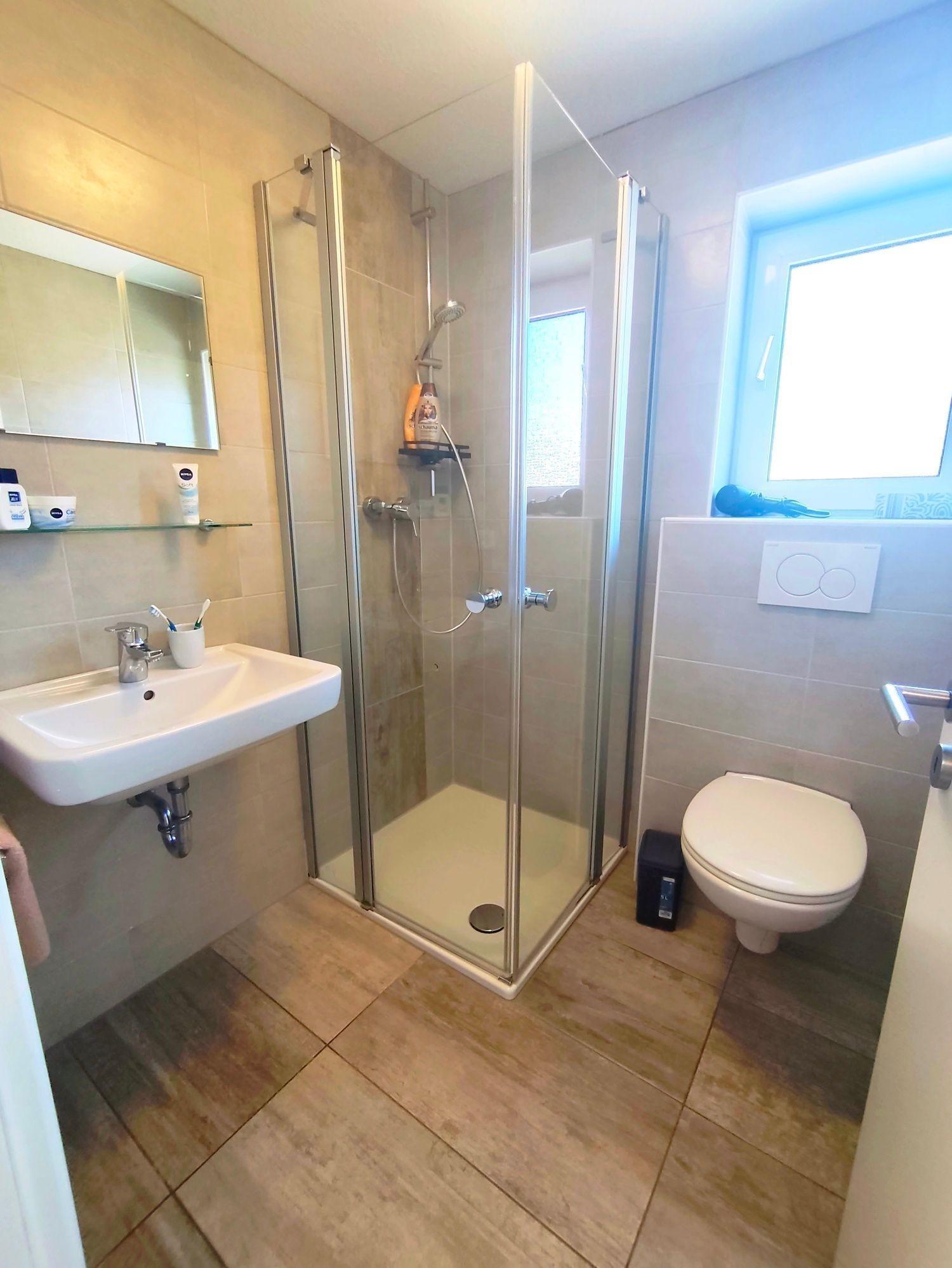 Erfrischen können Sie sich im schönen Tageslichtbad mit bodentiefer Dusche. Ein Handtuchwärmer sorgt für wohlig warme Handtücher.