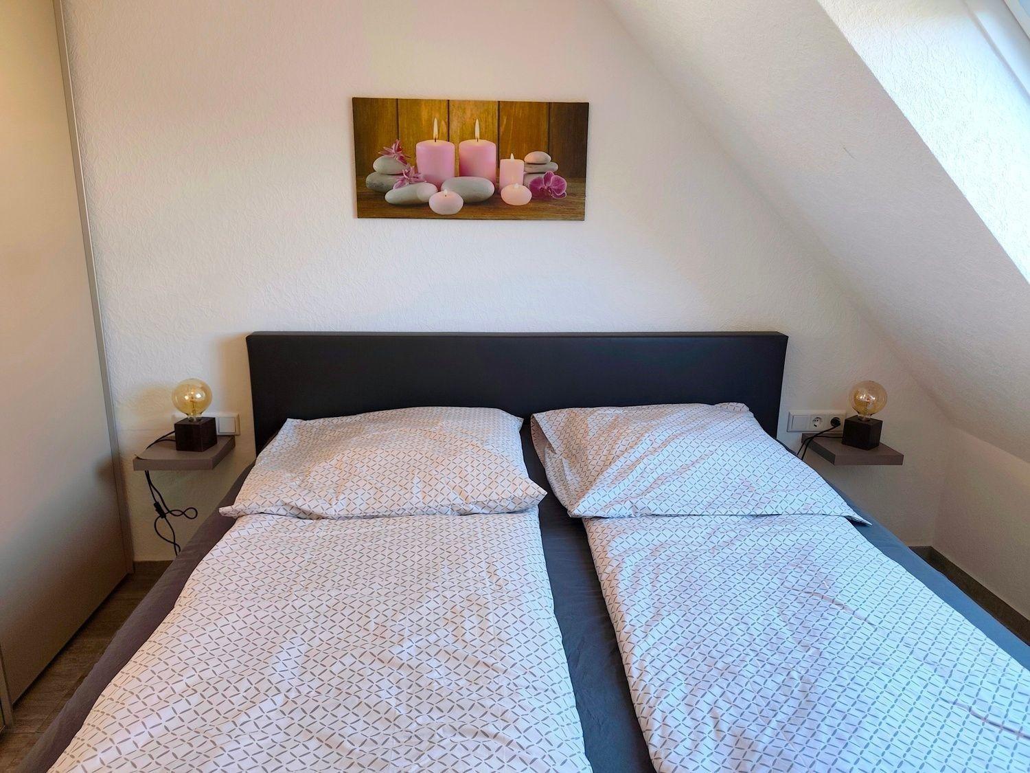 Im Schlafzimmer finden Sie ein gemütliches Boxspringbett (180 cm x 200 cm) vor und im Kleiderschrank können Sie Ihre Wäsche ordentlich unterbringen. Das Zimmer lässt sich mit einem Verdunklungsrollo abdunkeln.