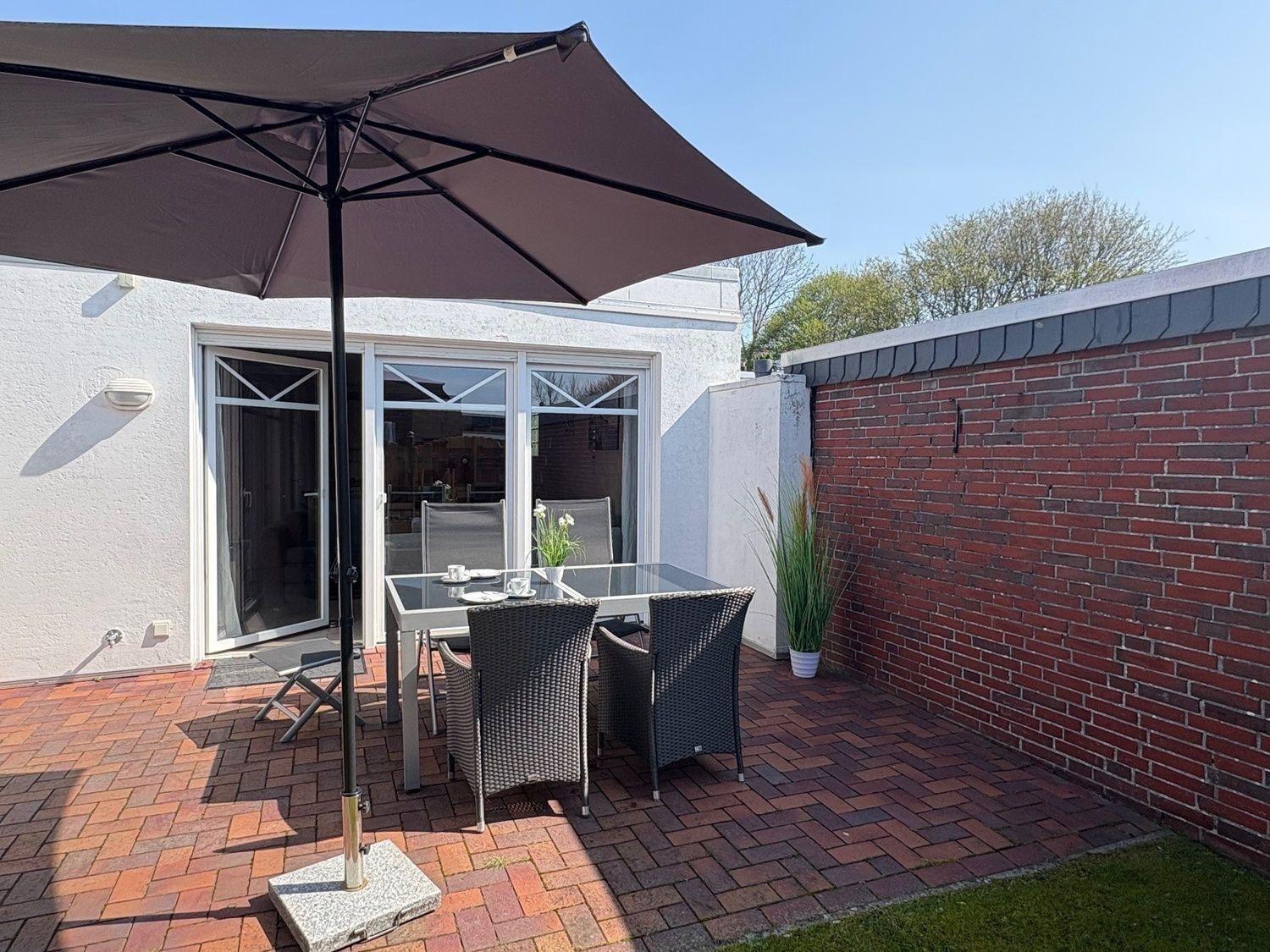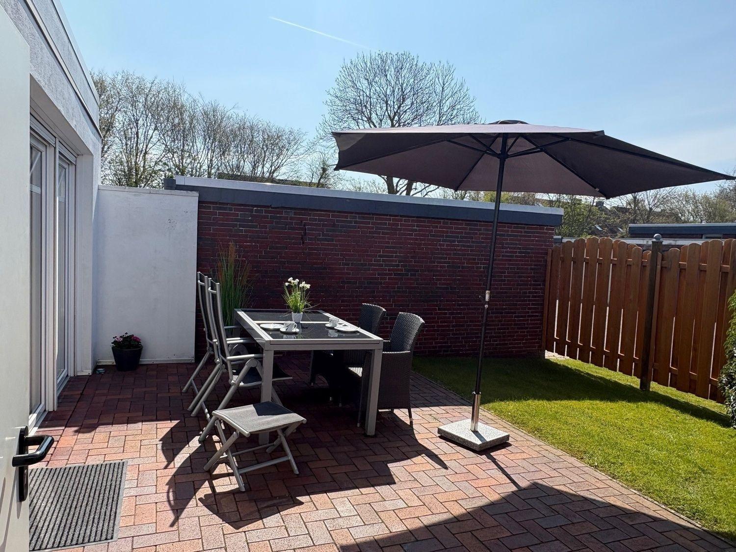 Durch die helle Wohnküche gelangen Sie auf die schöne windgeschützte Terrasse mit Gartenmöbeln, Sonnenschirm und Grill.
