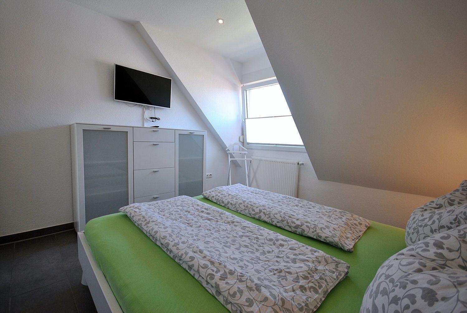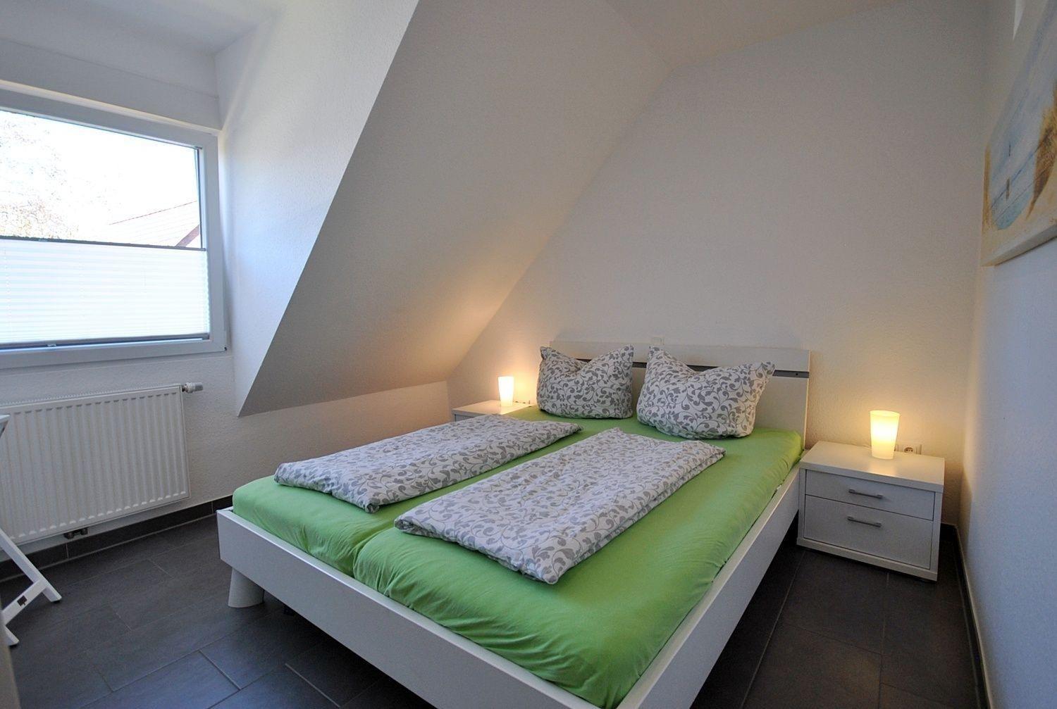 Das Schlafzimmer bietet ein Doppelbett - mit Komfort-Matratzen an. Sie selber entscheiden, ob lieber harte oder weiche Seite der Matratze Ihnen die Nächte versüßt.