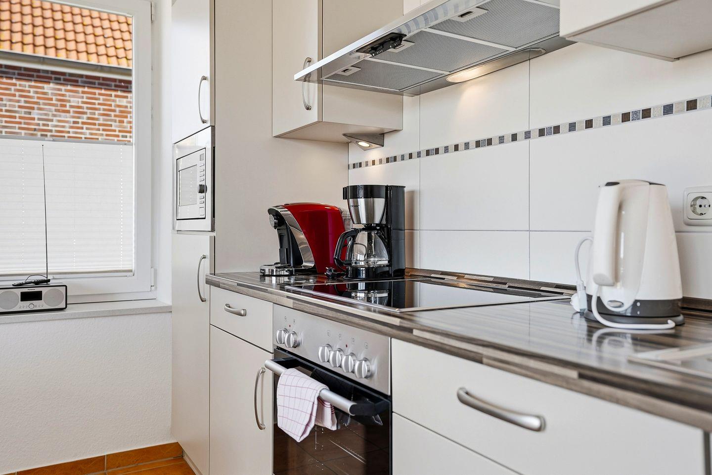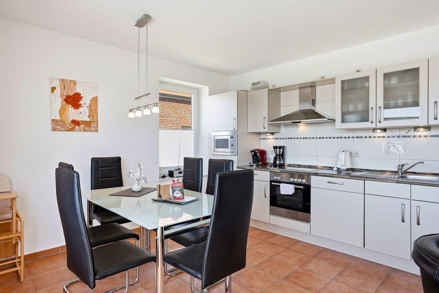Großer Wohn-Essbereich mit voll ausgestatteter Küche mit Cerankochfeld, Kühl-Gefrierkombination, Geschirrspüler, Mikrowelle, Wasserkocher, Kaffeemaschine, Toaster etc.. Flachbildschirm, CD-Player und DVD-Player.