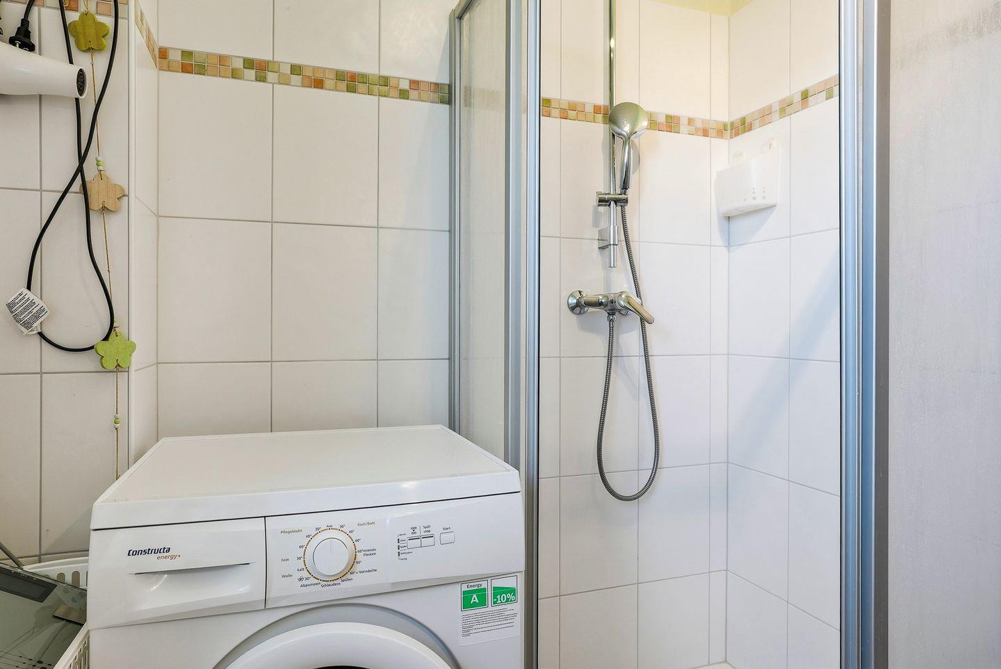 Bad mit Dusche (mit niedrigem Einstieg), WC, Waschmaschine, Fussbodenerwärmung und Handtuchwärmer. Bügelbrett/-eisen sind ebenfalls vorhanden.