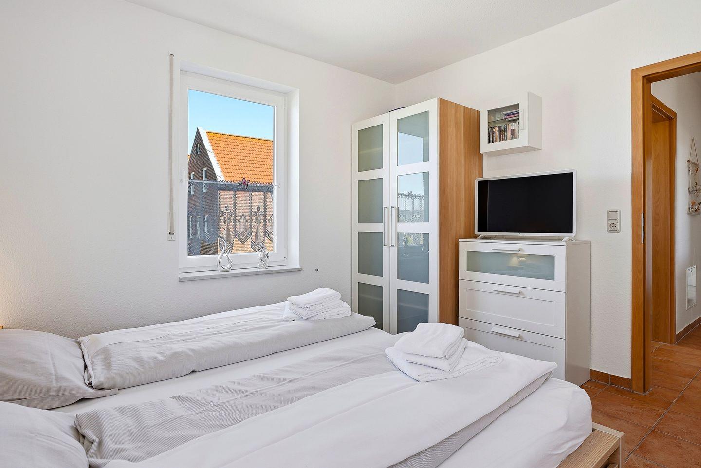 2 Schlafräume (1 x Doppelbett, 1 x Ausziehbett (neu Ende 2025)) mit Außenjalousien. In jedem Schlafzimmer befindet sich ein Fernseher!