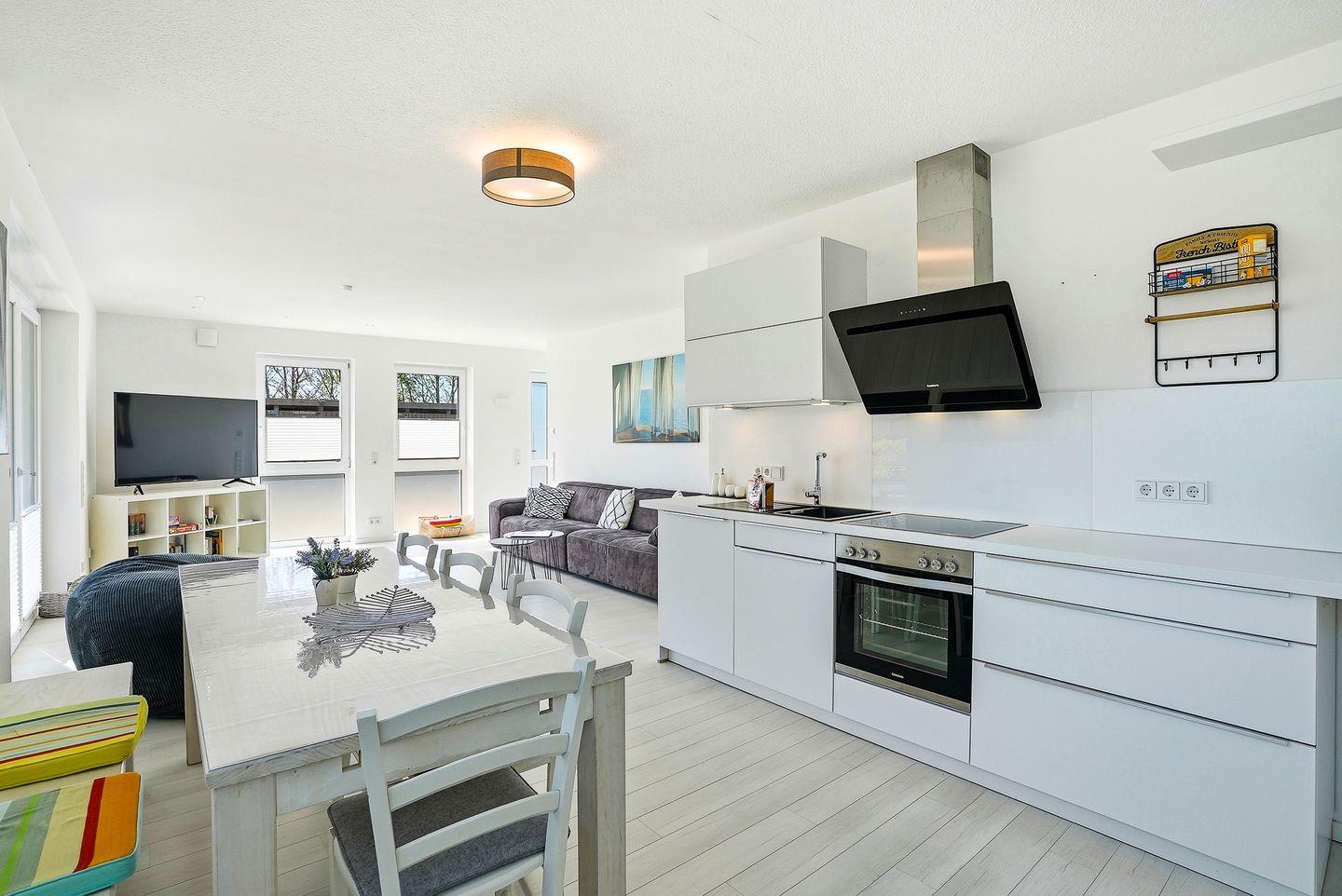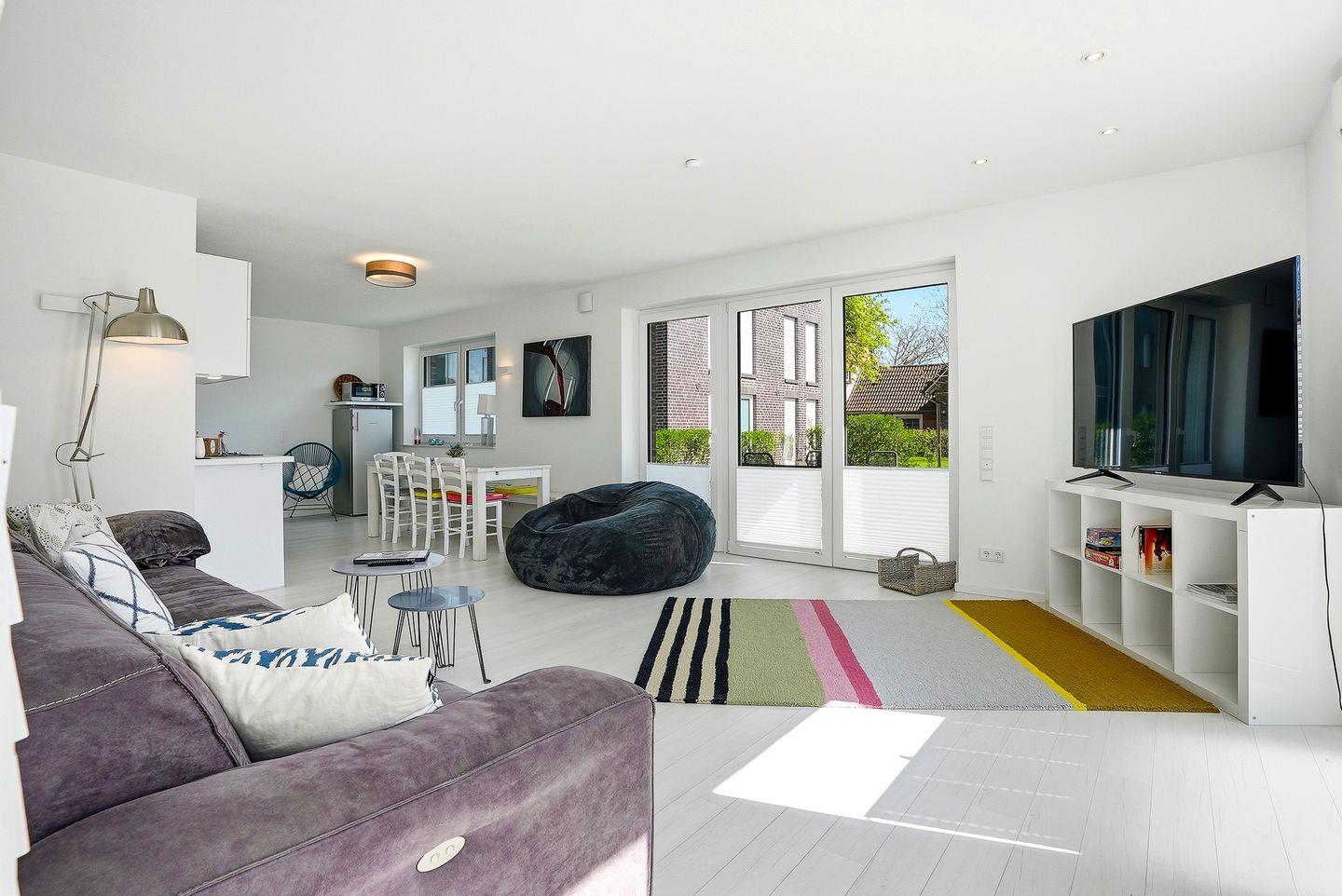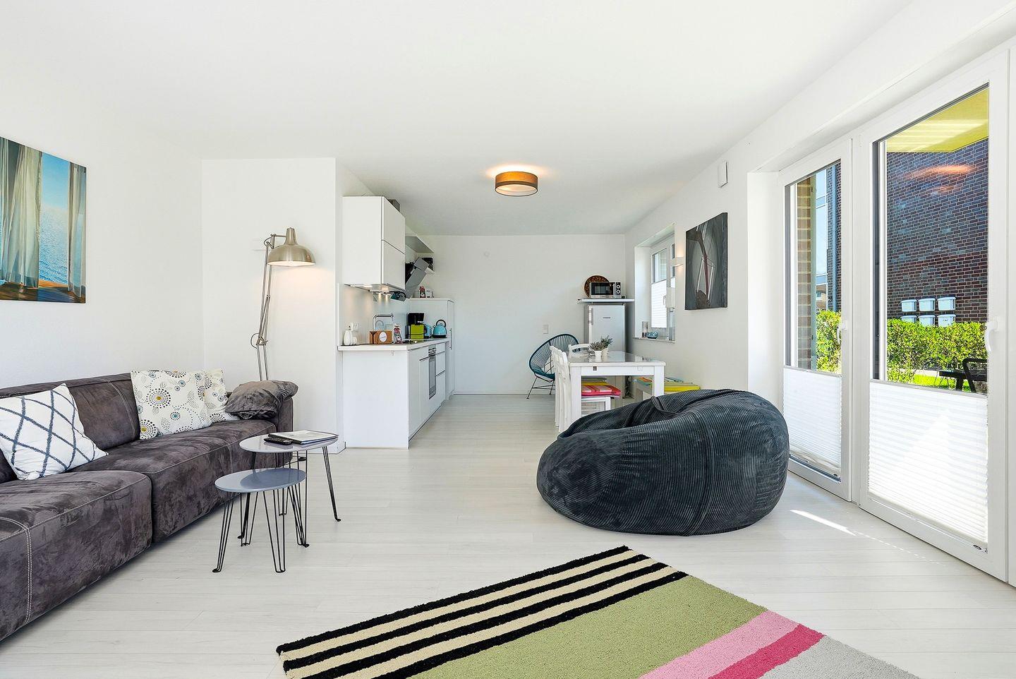 Der eigene Eingang direkt vom Parkplatz aus führt Sie direkt in den kleinen Flur, von dem aus Sie in den großzügigen Wohnbereich eintreten können. Hier befinden sich ein großes Sofa mit Blick auf den großen TV, sowie der Essbereich mit Sitzplätzen für 7 Personen und die vollausgestattete Küche, die u.a. über Geschirrspülmaschine, Backofen, Cerankochfeld, großen Kühlschrank mit Gefrierfach, Mikrowelle, Kaffeemaschine, Nespresso-Kapselmaschine, Wasserkocher und Toaster verfügt. Vom Wohnbereich gelangt man auch direkt auf die möblierte (6 Stühle, Tisch, Sonnenschirm) Terrasse mit Gartenbereich, der von einer kleinen Hecke umgeben ist.