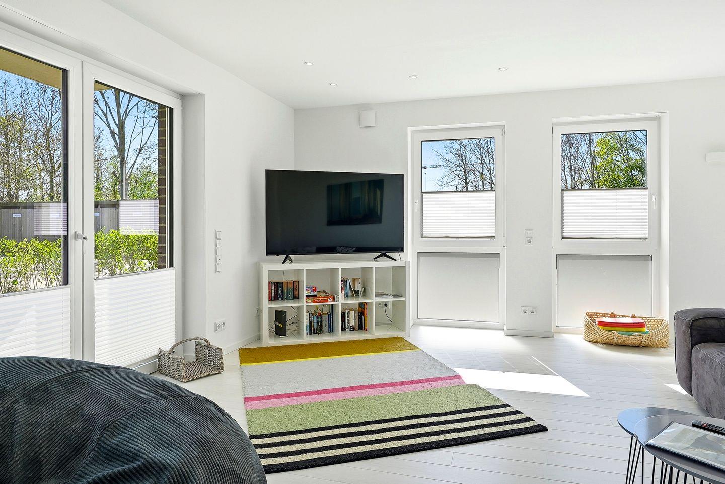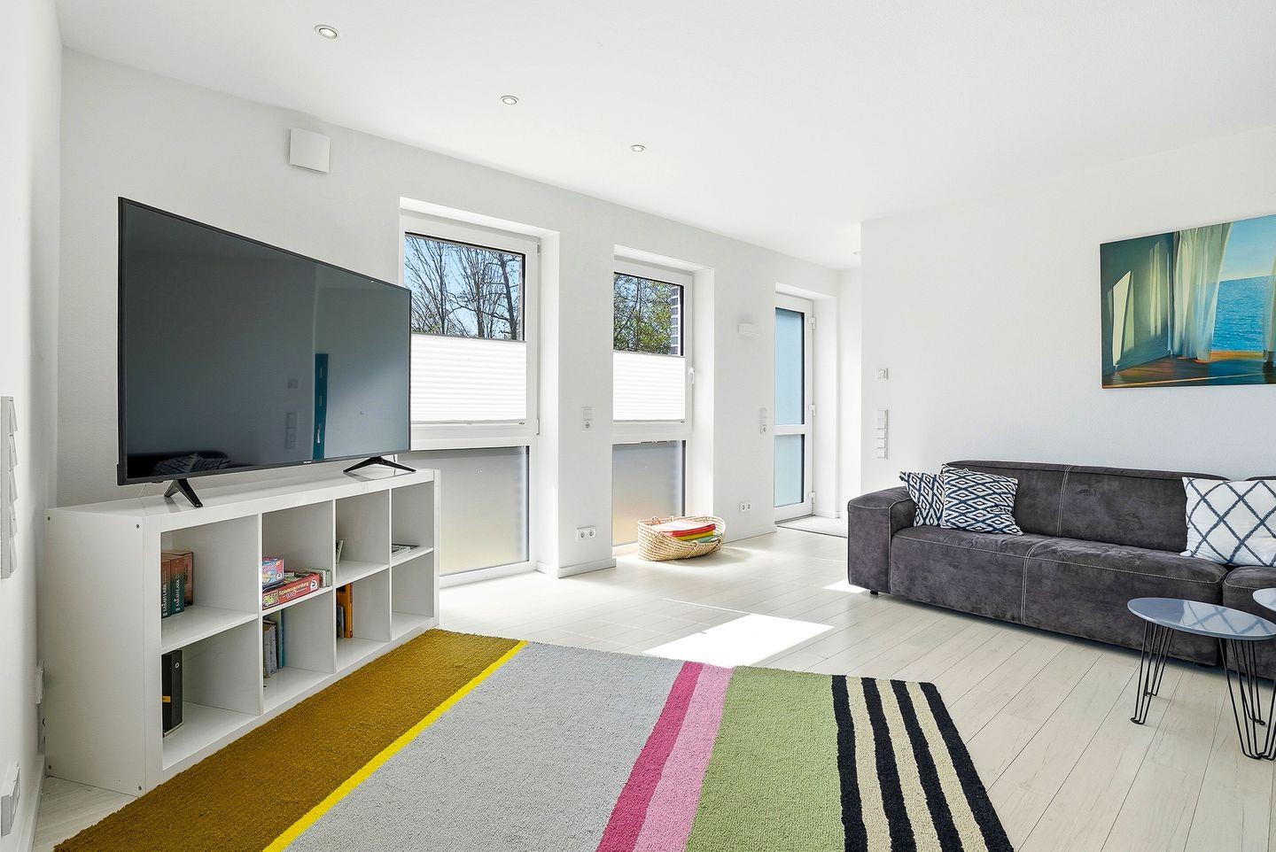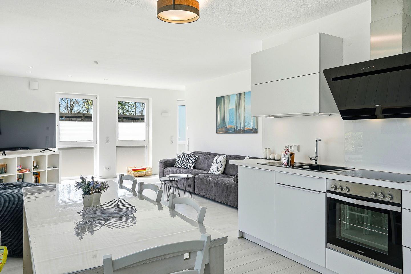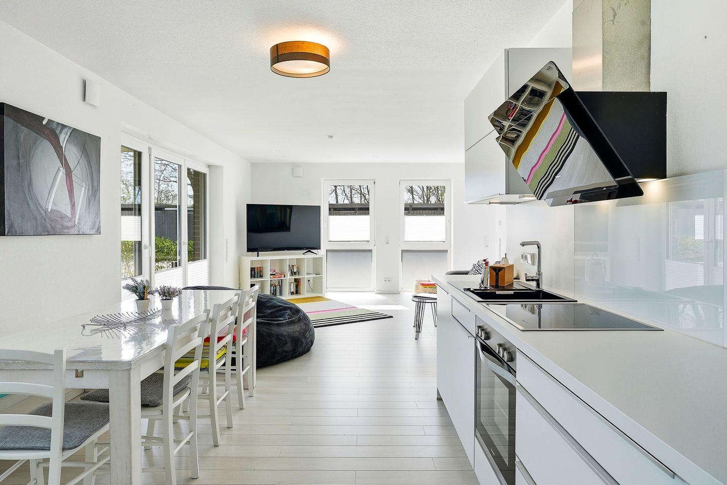 Der eigene Eingang direkt vom Parkplatz aus führt Sie direkt in den kleinen Flur, von dem aus Sie in den großzügigen Wohnbereich eintreten können. Hier befinden sich ein großes Sofa mit Blick auf den großen TV, sowie der Essbereich mit Sitzplätzen für 7 Personen und die vollausgestattete Küche, die u.a. über Geschirrspülmaschine, Backofen, Cerankochfeld, großen Kühlschrank mit Gefrierfach, Mikrowelle, Kaffeemaschine, Nespresso-Kapselmaschine, Wasserkocher und Toaster verfügt. Vom Wohnbereich gelangt man auch direkt auf die möblierte (6 Stühle, Tisch, Sonnenschirm) Terrasse mit Gartenbereich, der von einer kleinen Hecke umgeben ist.