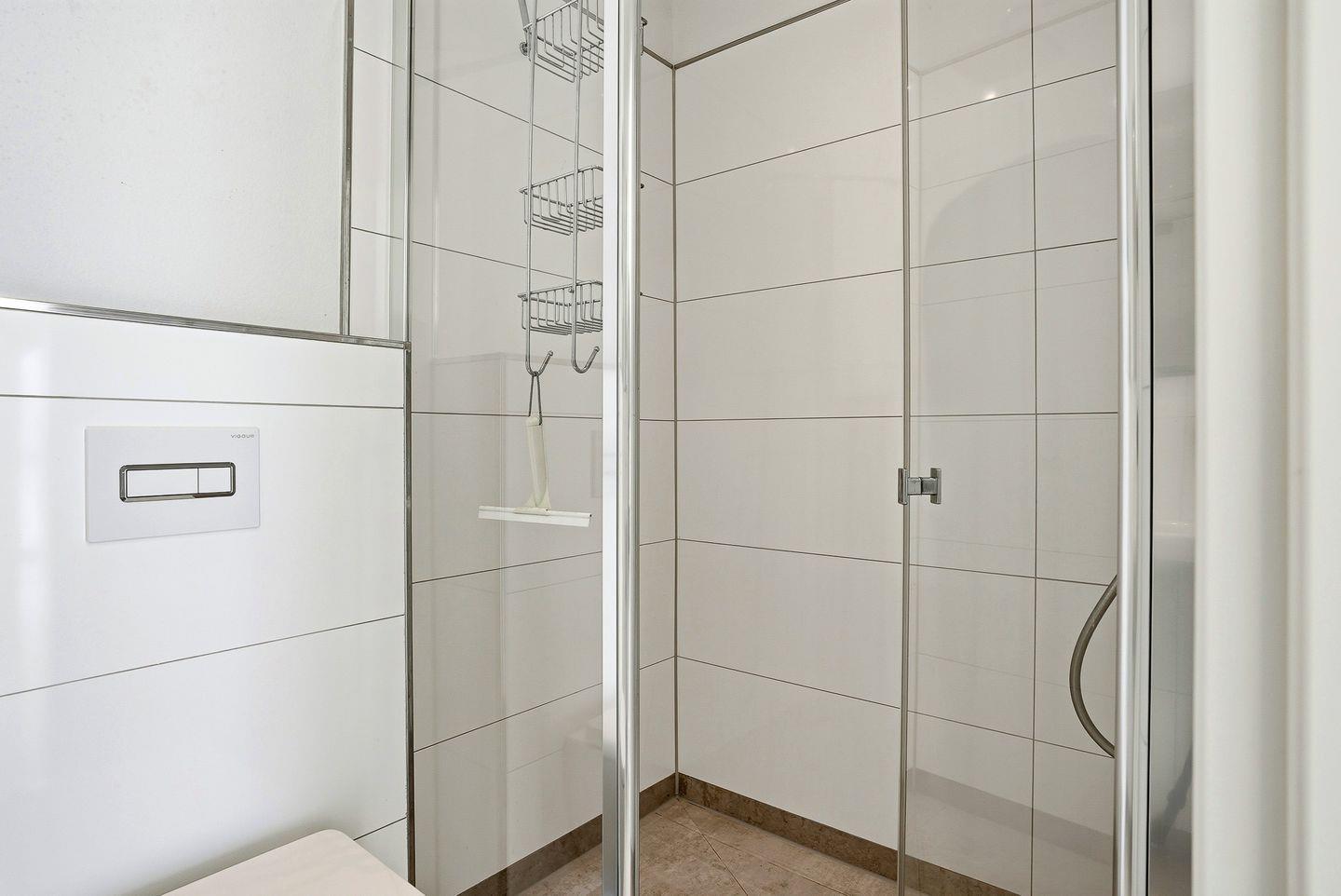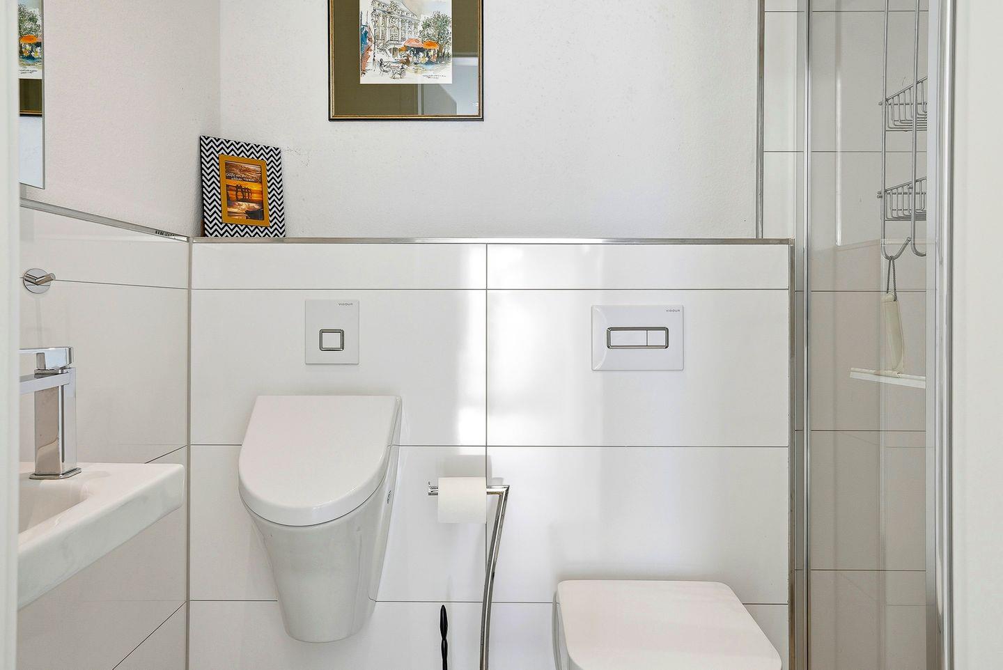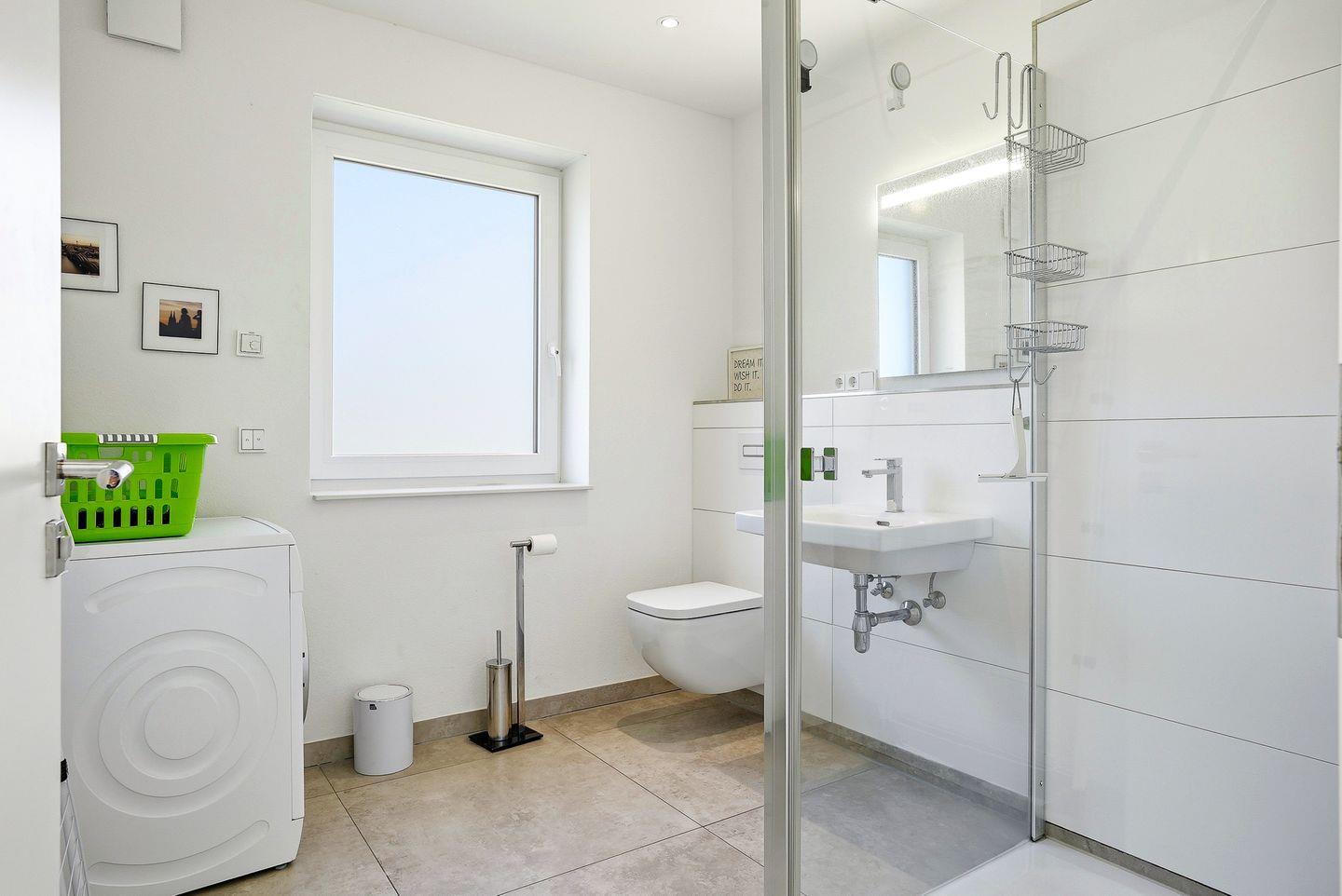 Die Wohnung verfügt im Erdgeschoss weiterhin über ein Schlafzimmer mit Boxspring-Doppelbett (durchgehender Topper, 1,80 m), Sessel und Kleiderschrank, sowie die beiden Badezimmer: Eines der Badezimmer ist mit großer, ebenerdiger Dusche, elektrischem Handtuchheizkörper, Fenster, WC, Waschbecken, Waschmaschine, Wäscheständer und Föhn ausgestattet, das zweite Badezimmer verfügt über eine weitere bodentiefe Dusche, Pissoir, WC und ein kleines Waschbecken.
