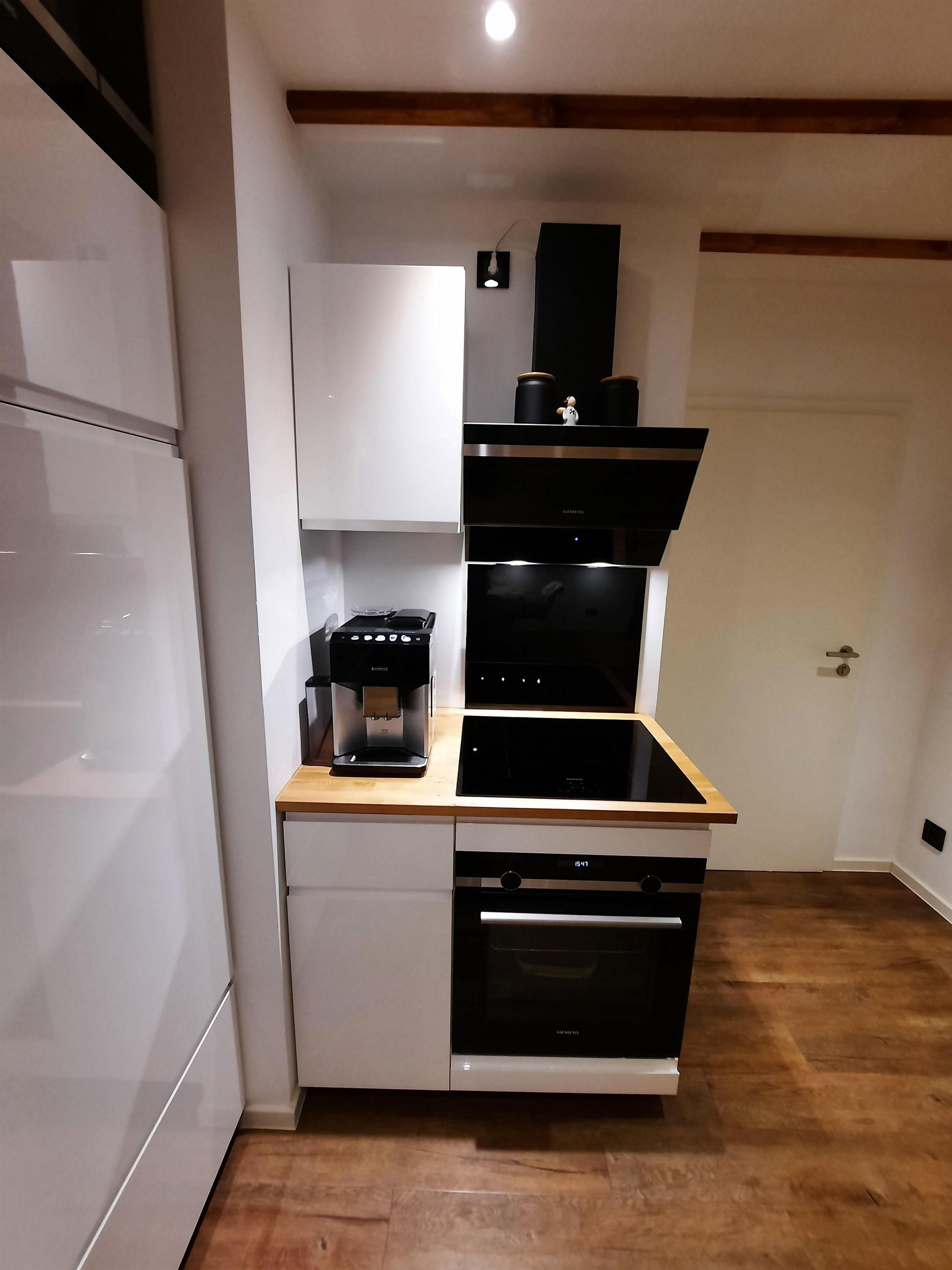 Die Küche ist mit allen nötigen Utensilien wie Kühlschrank inkl. Gefrierfach, Geschirrspüler, Induktionskochfeld, Mikrowelle, Dunstabzugshaube, Wasserkocher, Waffeleisen, elektrischer Stabmixer, Toaster, Kaffeevollautomat, Backofen etc. ausgestattet (Geräte von Siemens).