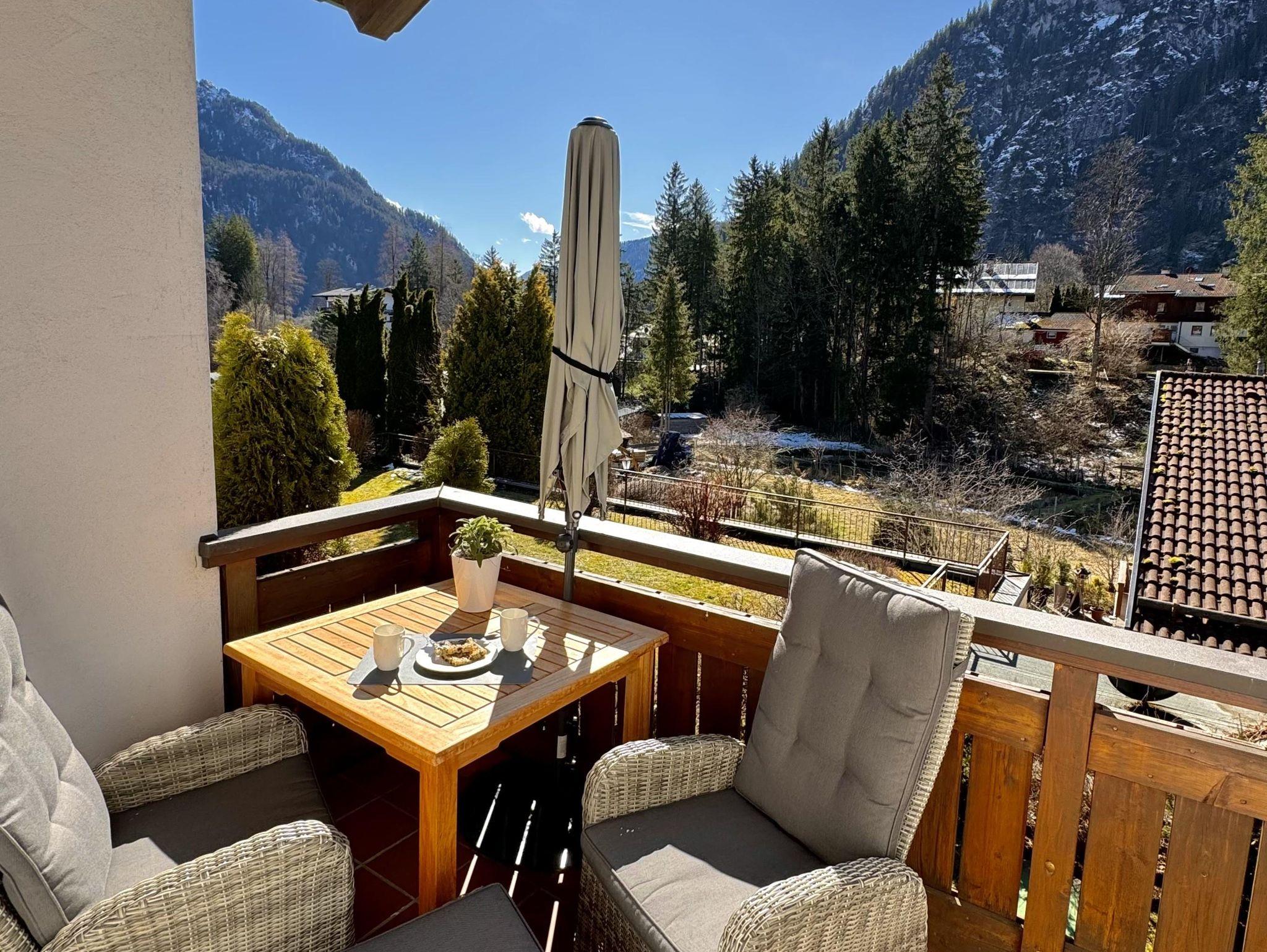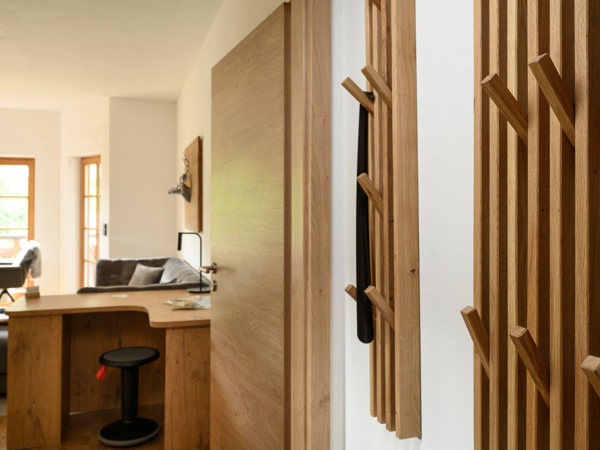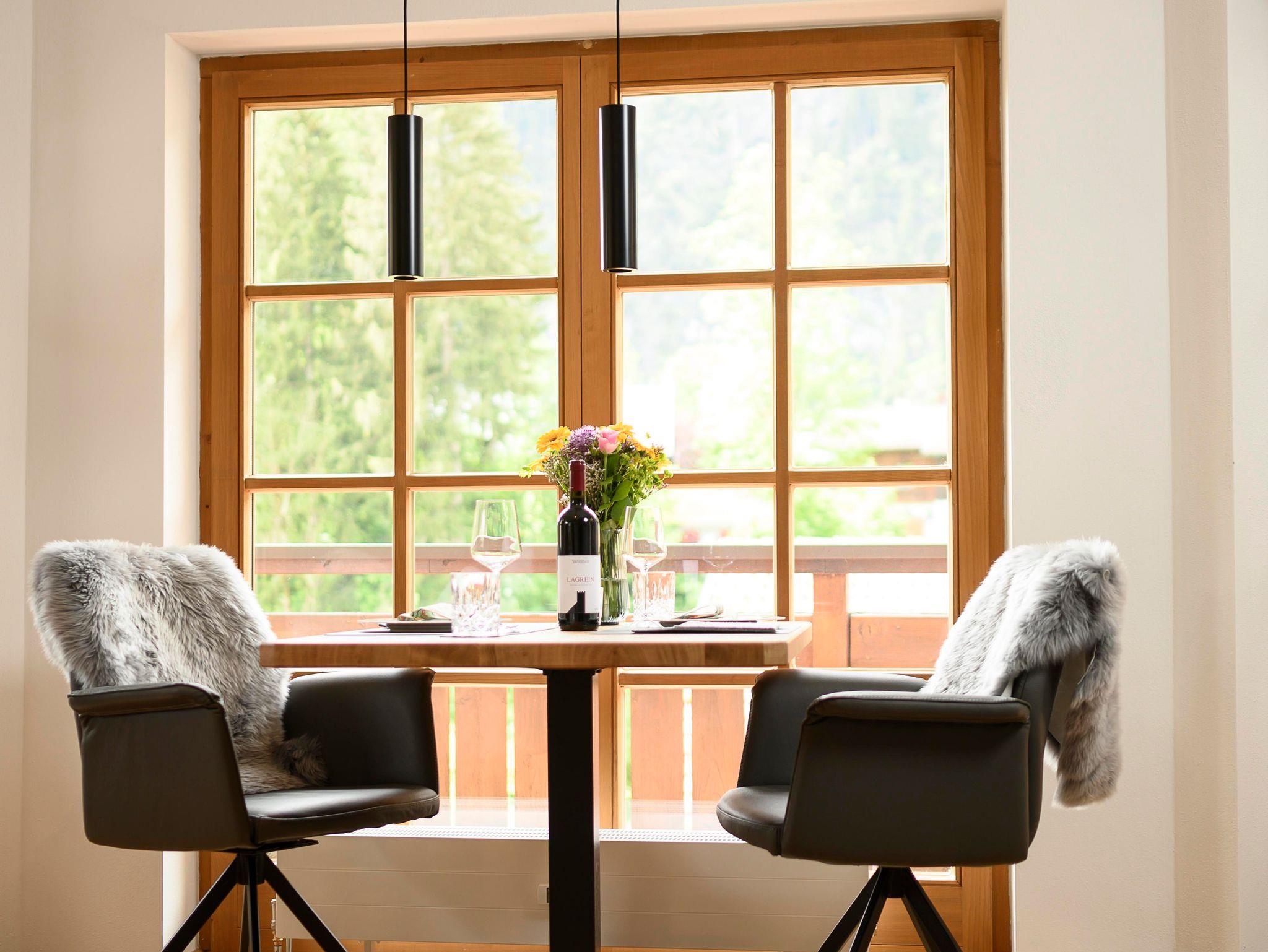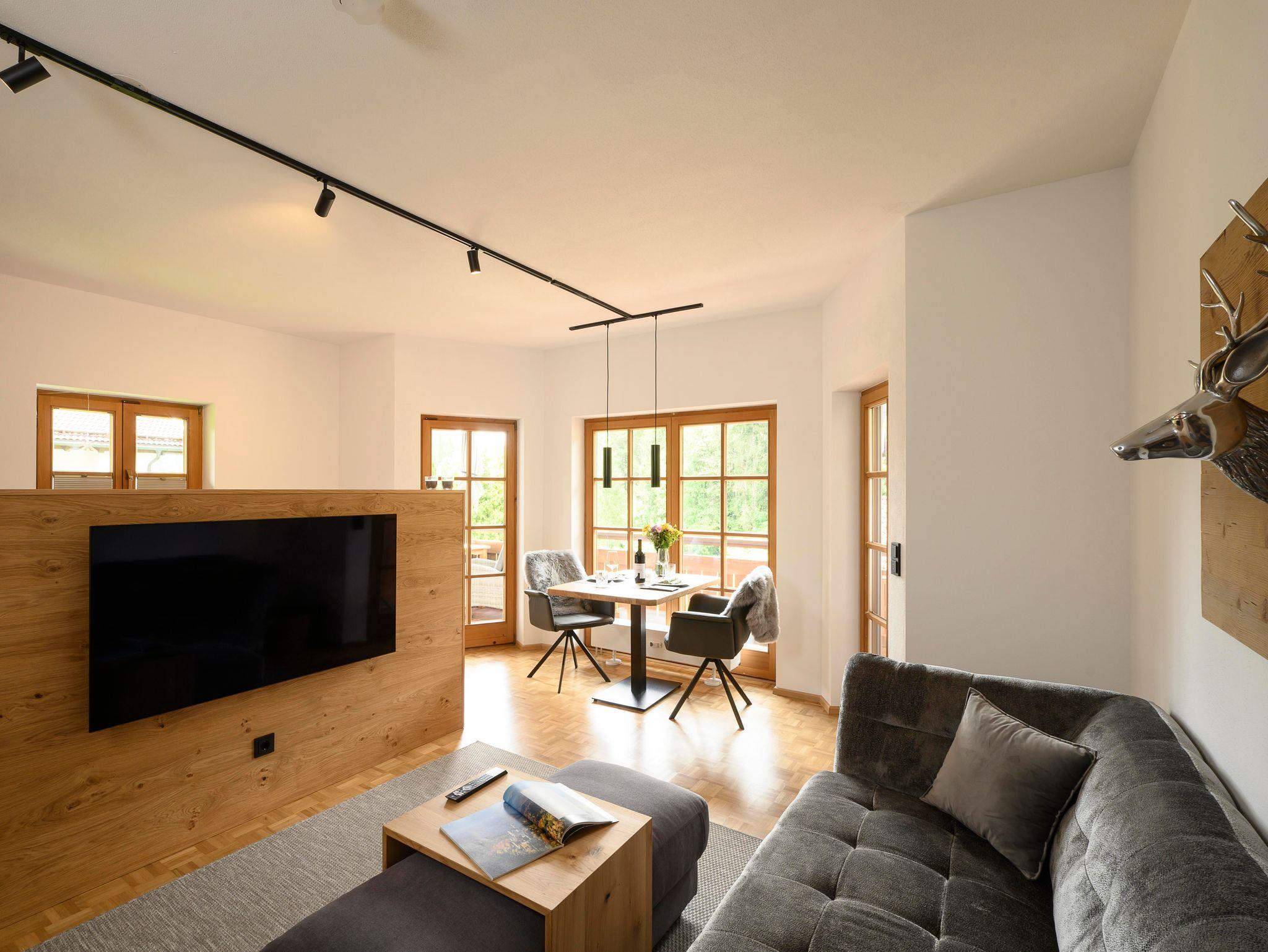 In der Ferienwohnung verspricht der helle, große und gemütliche Wohn- und Schlafbereich dank komfortablem Doppelbett eine erholsame Nachtruhe, einen schönen Eckschreibtisch, einen einladenden Essbereich mit traumhaftem Bergblick und einen gemütlichen Sitzbereich mit Smart-TV. Von hier gelangen Sie auf den wohlig ausgestatteten Balkon und genießen relaxt im Hängesessel das zauberhafte Bergpanorama.