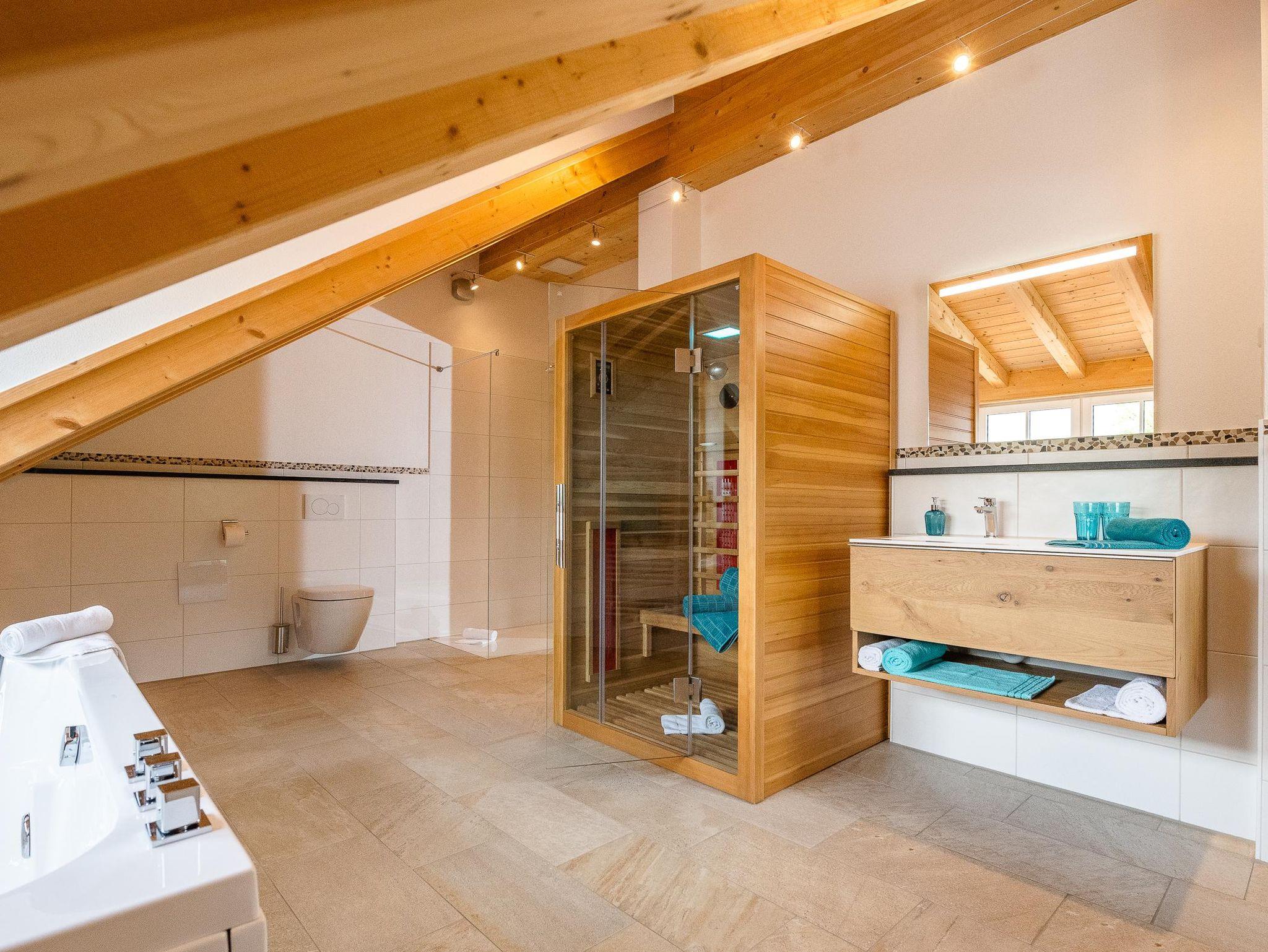 Bei uns erwarten Sie moderne Ferienwohnungen, die im August 2020 fertiggestellt und mit Liebe zum Detail eingerichtet wurden. Die großzu¨gigen Wohneinheiten laden ein in romantischer Zweisamkeit zu entspannen. Wa¨hlen Sie zwischen einer privaten Sauna in der Ferienwohnung „Wolfsgrube“ oder einer Infrarotkabine fu¨r zwei Personen in der Wohnung „Kofelau“. Fu¨r Wasserratten haben wir in der „Kofelau“ oder der „Ba¨renbad“ eine Whirl-Wanne fu¨r Zwei mit einem herrlichen Blick aus den Dachgauben auf die umliegende Bergwelt.