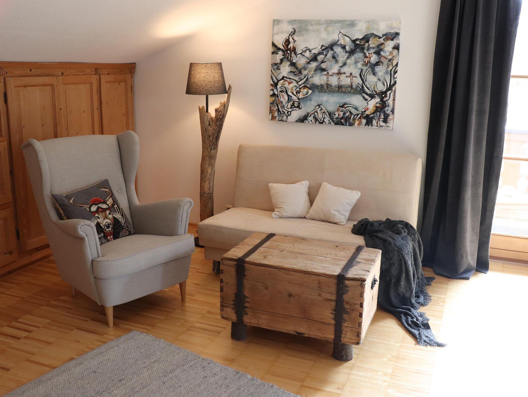 Genießen Sie einen entspannten Urlaub in unserer gemütlich in moderen Alpenstil eingerichteten 93m² Ferienwohnung in Oberammergau. Sie liegt im ersten Stock und ist bestens für Familien geeignet. Das 30m² große Schlafzimmer verspricht nicht nur Dank rückenschonender Matratzen einen erholsamen Schlaf, sondern lädt auch noch mit einer kleinen Couch und einem Lesesessel zum Verweilen ein. Im zweiten Schlafzimmer mit zwei Einzelbetten von Anno 1880 geraten Sie ins Träumen. Das großzügige Wohn- und Esszimmer mit großen 65 zoll SAT-TV und kostenlosen WLAN bietet genügend Platz für gemütliche Abende. Dort befindet sich ein großes modernes Ecksofa und eine gemütliche Essgruppe. Die gegenüberliegende Küche ist mit allen nötigen Küchenutensilien und technischen Geräten ausgestattet. Sogar ein Kaffeevollautomat ist vorhanden. Das Tageslichtbad verfügt über eine Dusche und einem antiken Waschtisch. Ein Süd- und Westbalkon mit entsprechenden Sitzgelegenheiten verleihen der Ferienwohnung einen Panoramablick auf den Naturpark der Oberammergauer Alpen. Die Ferienwohnung ist eine Nichtraucherwohnung und vor dem Haus sind ausreichend Parkplätze vorhanden. Gerne holen wir Sie auch vom Bahnhof ab.