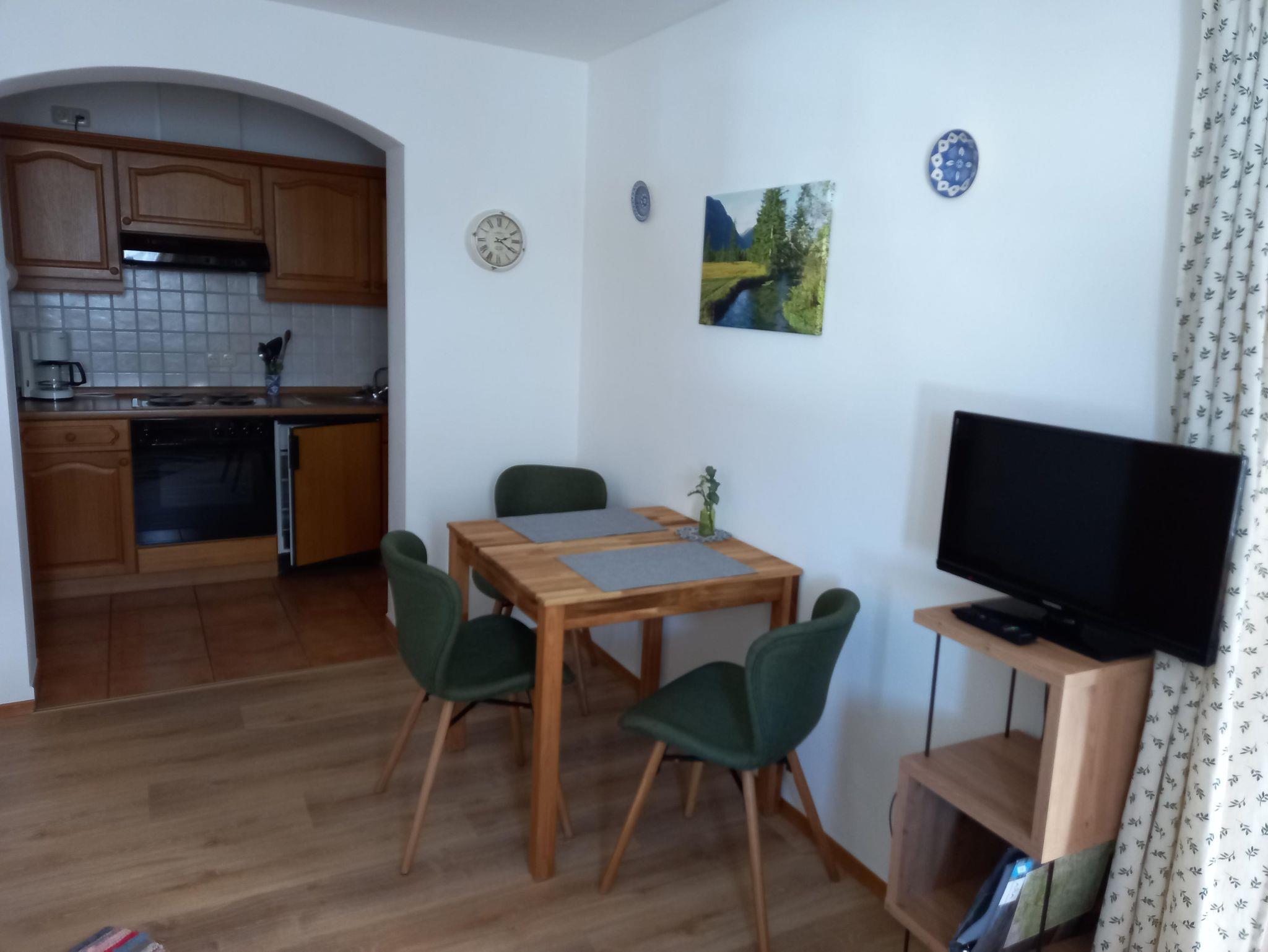 Ferienwohnung mit separaten Wohn- und Schlafraum, Kochnische mit den gängigen Elektrogeräten ( Kaffeemaschine, Wasserkocher, Eierkocher, Toaster) 4Platten- Elekroherd mit Backofen und Kühlschrank.
