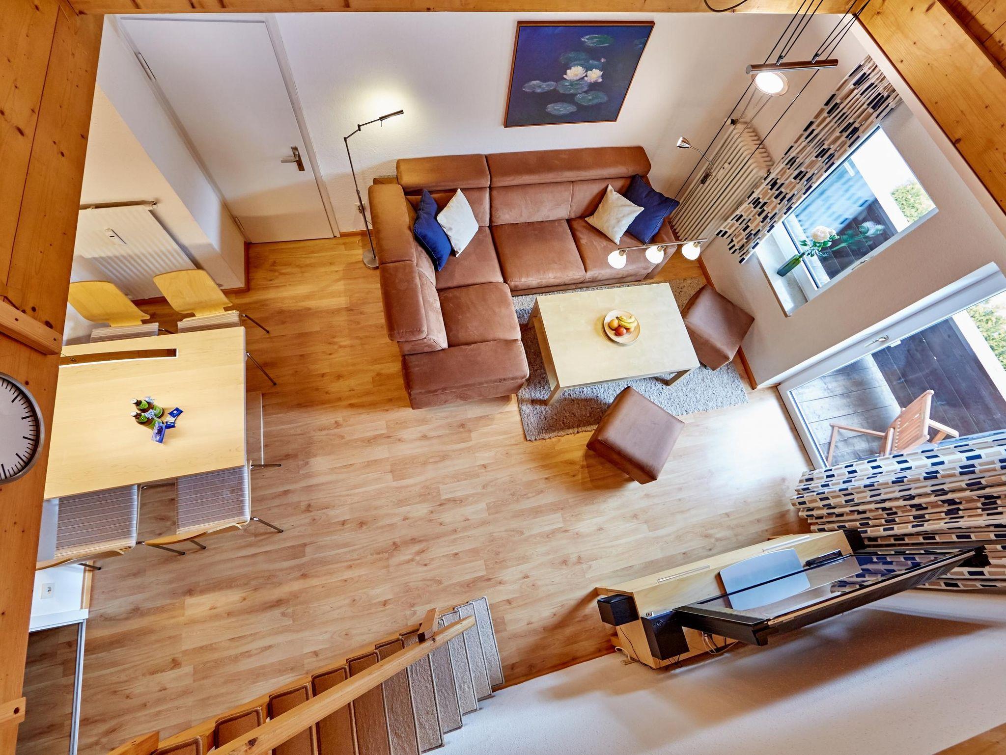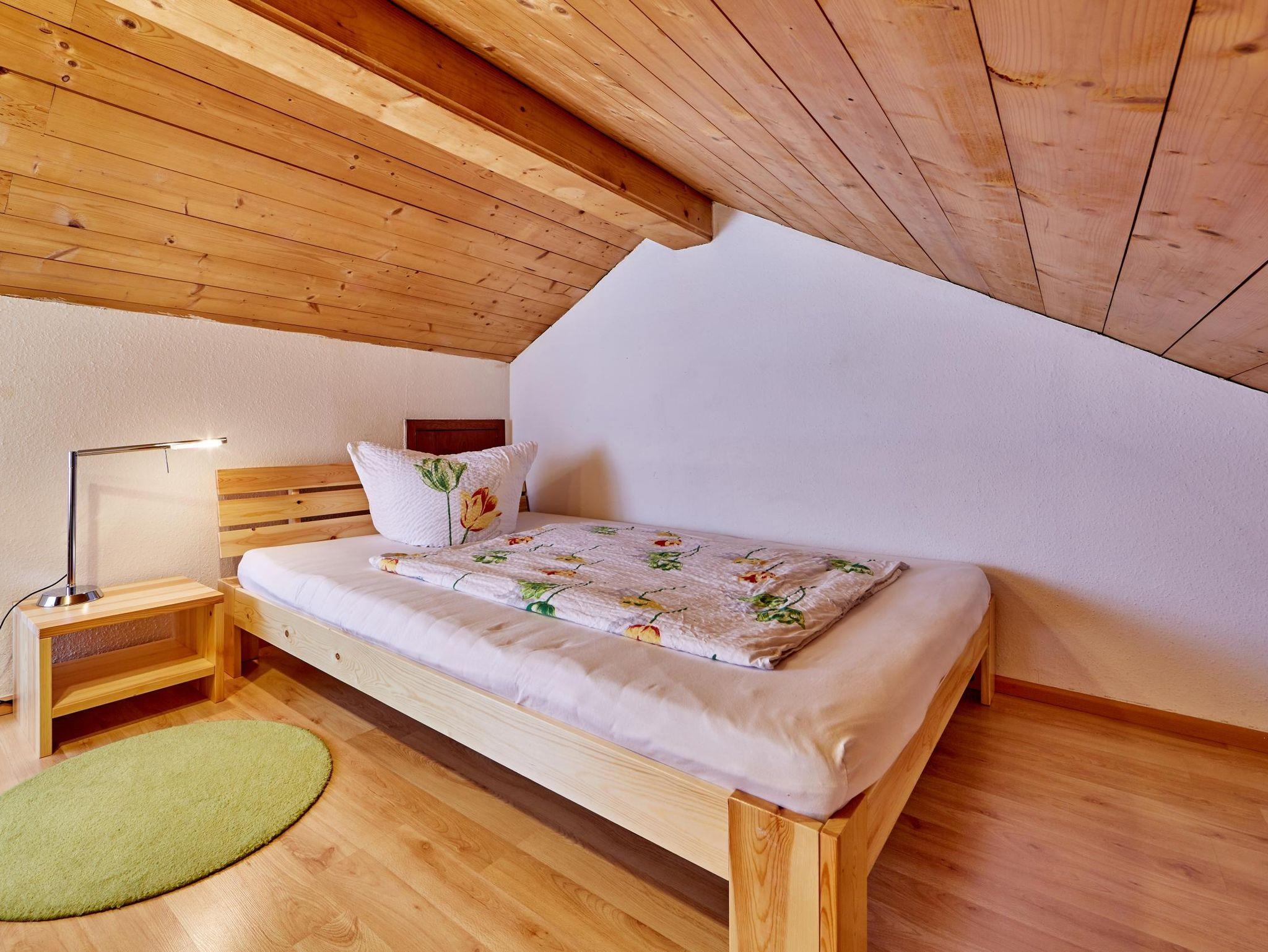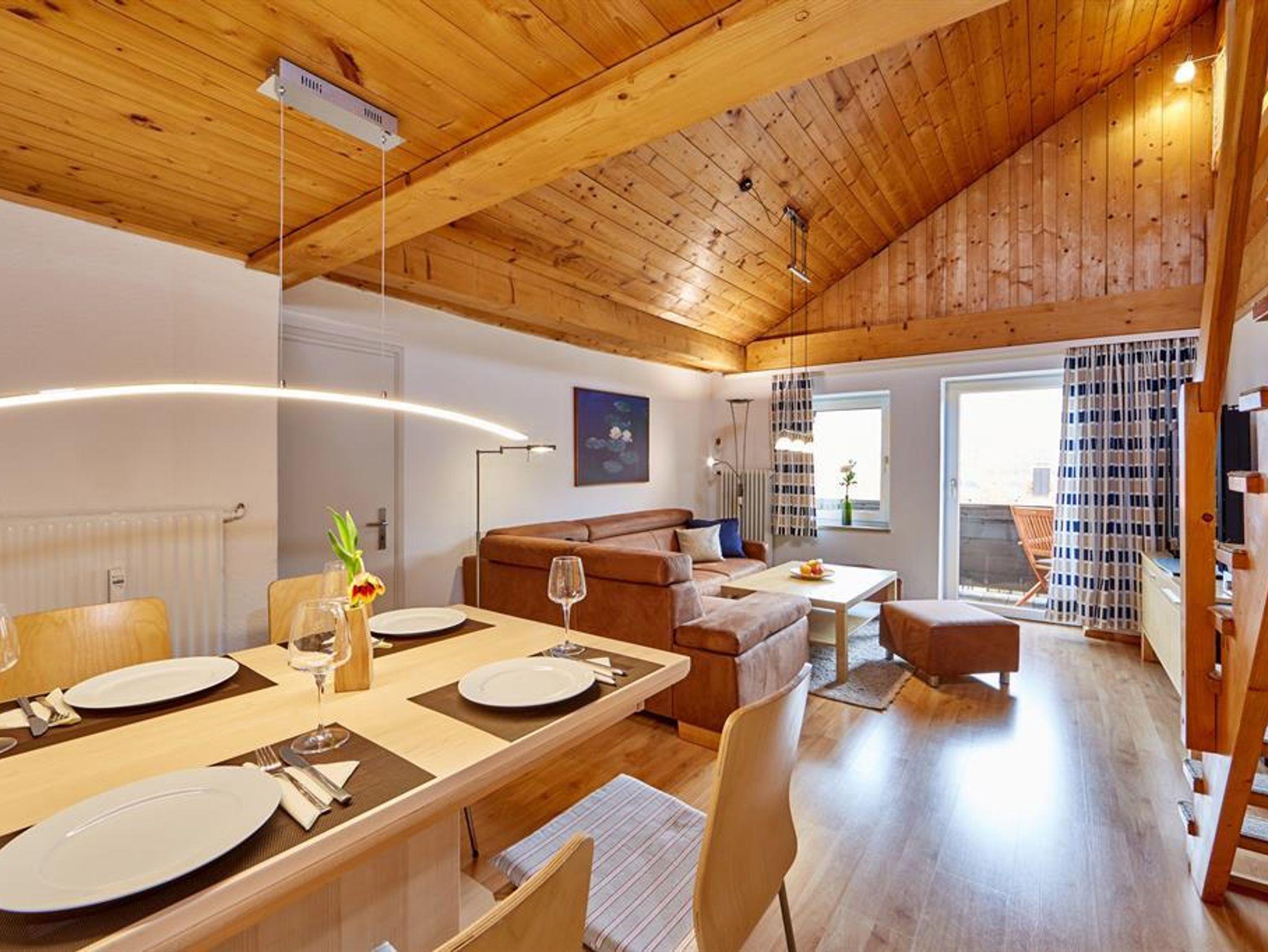 Unserer Ferienwohnung liegt im 3. OG, ist sehr gemütlich und modern ausgestattet sowie bestens geeignet für Familien mit Kindern. Das Wohnzimmer mit Schlaf-Couchecke verfügt über einen Essplatz für bis zu sechs Personen. Sie können den Balkon von Wohnzimmer aus ebenso betreten wie vom danebenliegenden geräumigen Schlafzimmer mit Doppelbett. Im Einzelschlafzimmer - mit der Möglichkeit ein zweites Bett auszuziehen - fühlen sich Erwachsene wie größere Kinder wohl. Das extra Kinderzimmer bietet Schlafmöglichkeit für zwei Kinder; ein Bett ist speziell für Kleinkinder. Spielsachen stehen zur Verfügung. Über eine Holztreppe im Wohnzimmer erreicht man eine Empore, die gern von Kindern zum Spielen genutzt wird. Ein großes Bett als weitere Schlafmöglichkeit für eine Einzelperson steht dort zur Verfügung. Unsere Küche ist technisch gut ausgerüstet mit allen nötigen Küchenutensilien. Eine großzügige Diele, Duschbad mit WC und Balkon mit Blick auf die Berge runden unsere gemütliche Ferienwohnung ab. Ganz aktuell:Wir haben für Sie eine neue Medienanlage im Wohnzimmer installiert: Flachbildschirm 55, Blueray-/DVD-Spieler, Audioanlage für DVD´s, Rundfunk sowie iPod-/MP-3 Player (bitte hierfür entsprechendes USB-Kabel mitbringen).