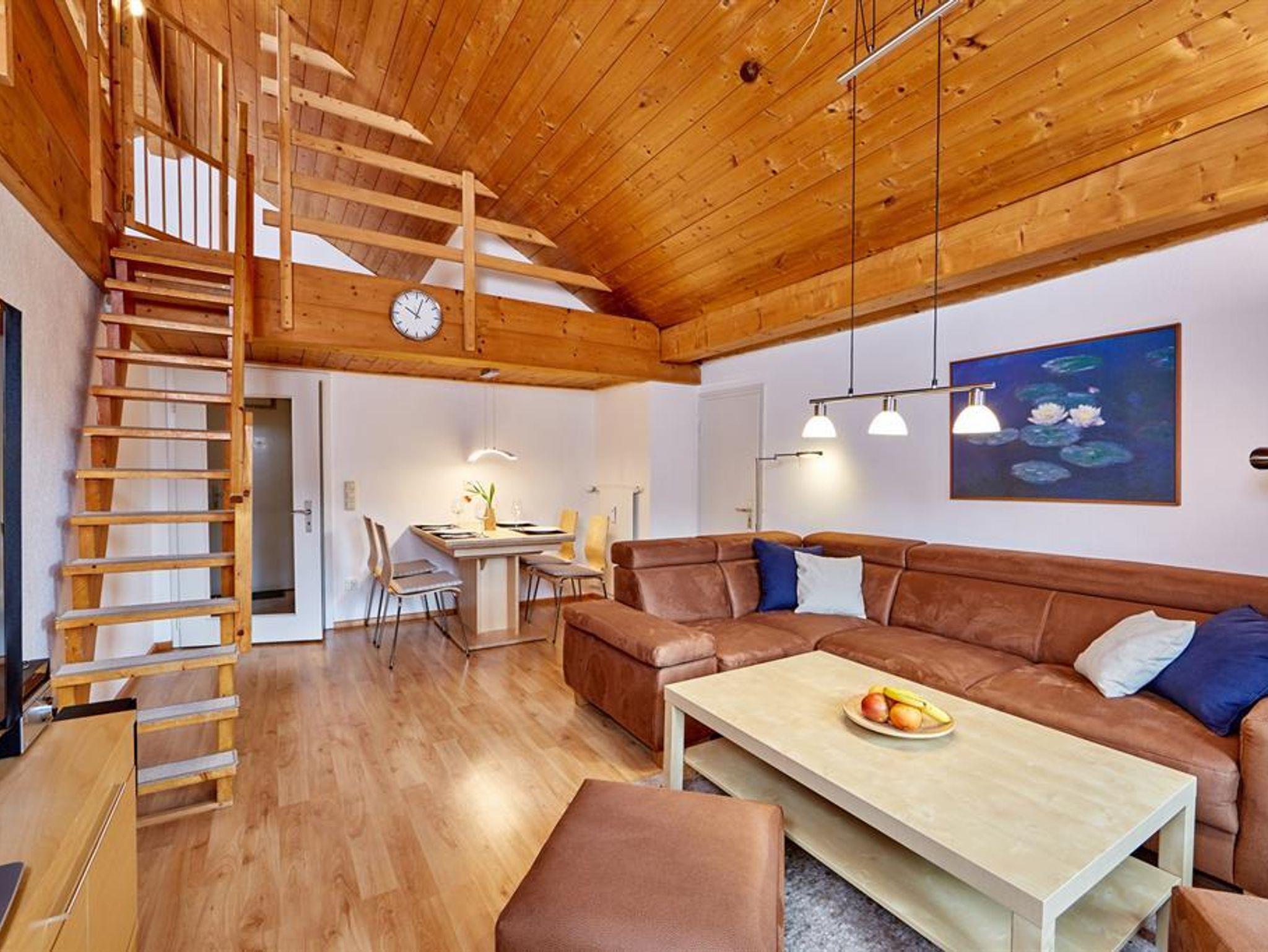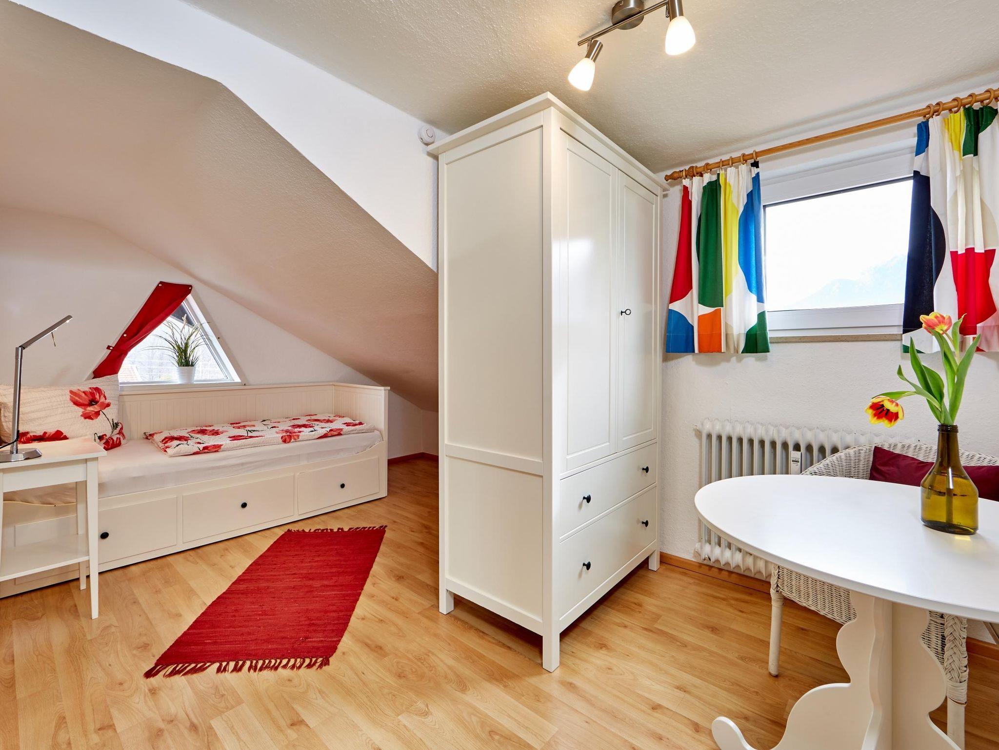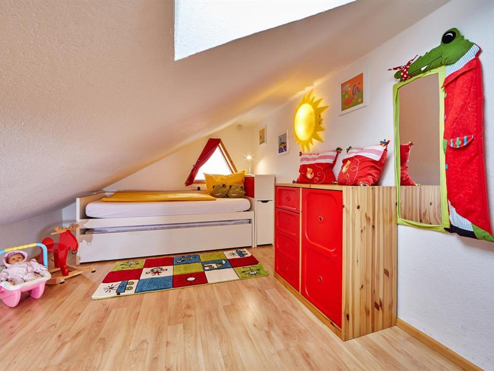 Unserer Ferienwohnung liegt im 3. OG, ist sehr gemütlich und modern ausgestattet sowie bestens geeignet für Familien mit Kindern. Das Wohnzimmer mit Schlaf-Couchecke verfügt über einen Essplatz für bis zu sechs Personen. Sie können den Balkon von Wohnzimmer aus ebenso betreten wie vom danebenliegenden geräumigen Schlafzimmer mit Doppelbett. Im Einzelschlafzimmer - mit der Möglichkeit ein zweites Bett auszuziehen - fühlen sich Erwachsene wie größere Kinder wohl. Das extra Kinderzimmer bietet Schlafmöglichkeit für zwei Kinder; ein Bett ist speziell für Kleinkinder. Spielsachen stehen zur Verfügung. Über eine Holztreppe im Wohnzimmer erreicht man eine Empore, die gern von Kindern zum Spielen genutzt wird. Ein großes Bett als weitere Schlafmöglichkeit für eine Einzelperson steht dort zur Verfügung. Unsere Küche ist technisch gut ausgerüstet mit allen nötigen Küchenutensilien. Eine großzügige Diele, Duschbad mit WC und Balkon mit Blick auf die Berge runden unsere gemütliche Ferienwohnung ab. Ganz aktuell:Wir haben für Sie eine neue Medienanlage im Wohnzimmer installiert: Flachbildschirm 55, Blueray-/DVD-Spieler, Audioanlage für DVD´s, Rundfunk sowie iPod-/MP-3 Player (bitte hierfür entsprechendes USB-Kabel mitbringen).