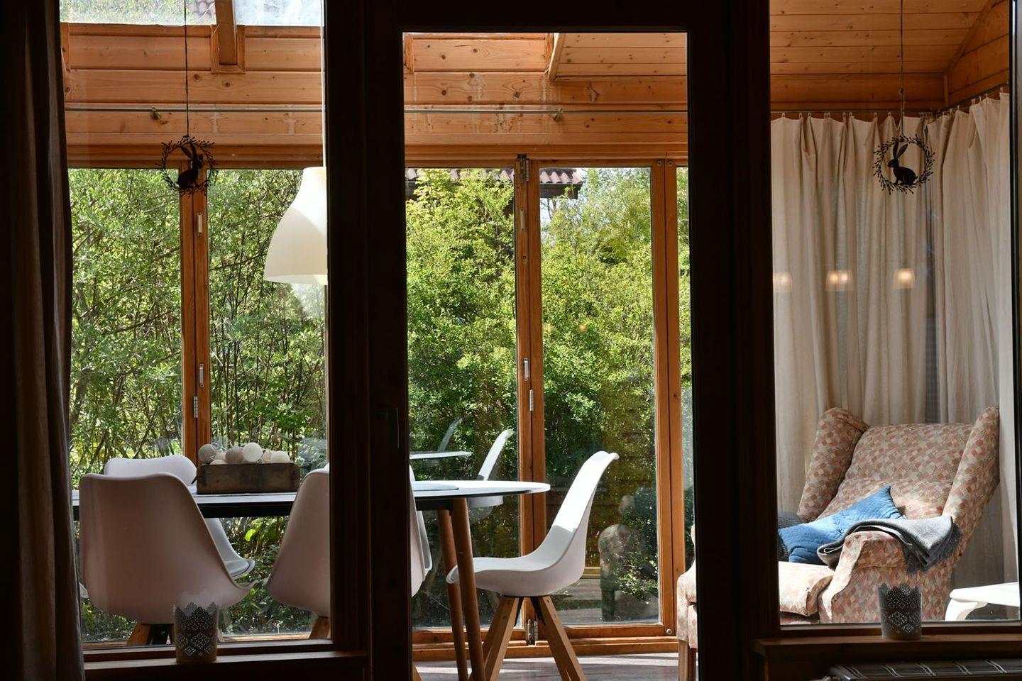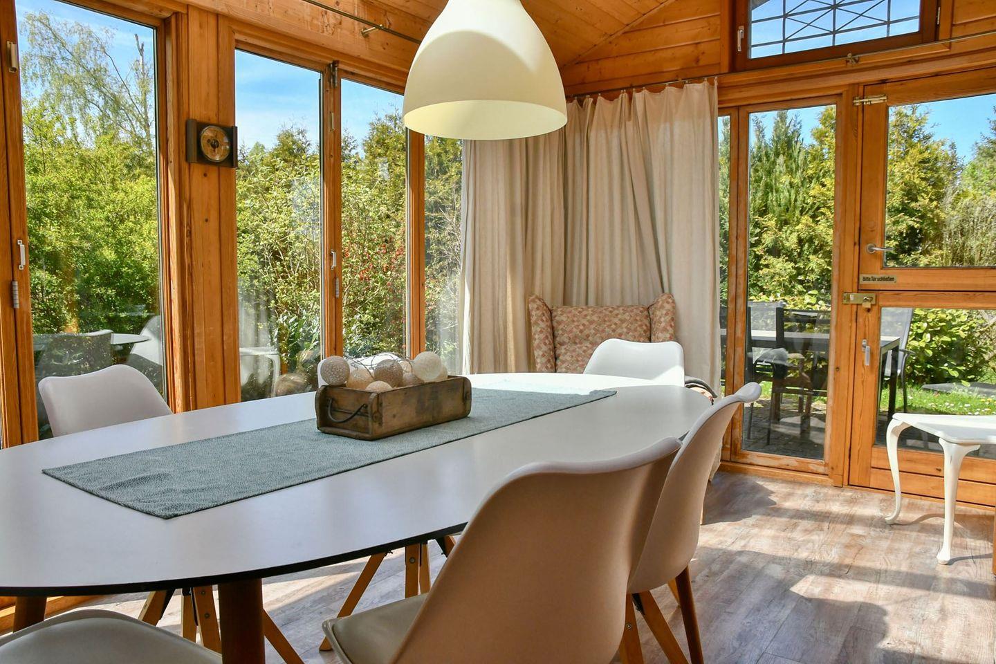 Der offene Wohn- und Essbereich bildet das Herz des Hauses. Große Fenster sorgen für viel Tageslicht und einen schönen Blick in die Natur. Mach es dir auf dem Sofa gemütlich, genieße einen Filmabend oder verbringe entspannte Stunden mit Familie und Freunden am Essbereich. Der an das Wohnzimmer angrenzende Wintergarten lädt zum Verweilen in geselliger Runde oder zum Lesen eines Buches ein.