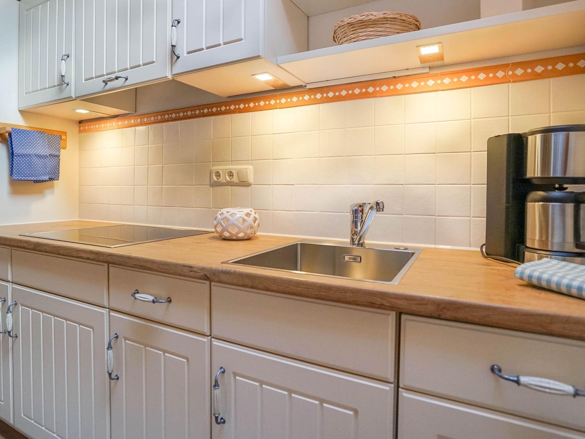 Die Küche bietet ein Cerankochfeld, Geschirrspülmaschine, Microwelle, Kühlschrank mit Gefrierfach.