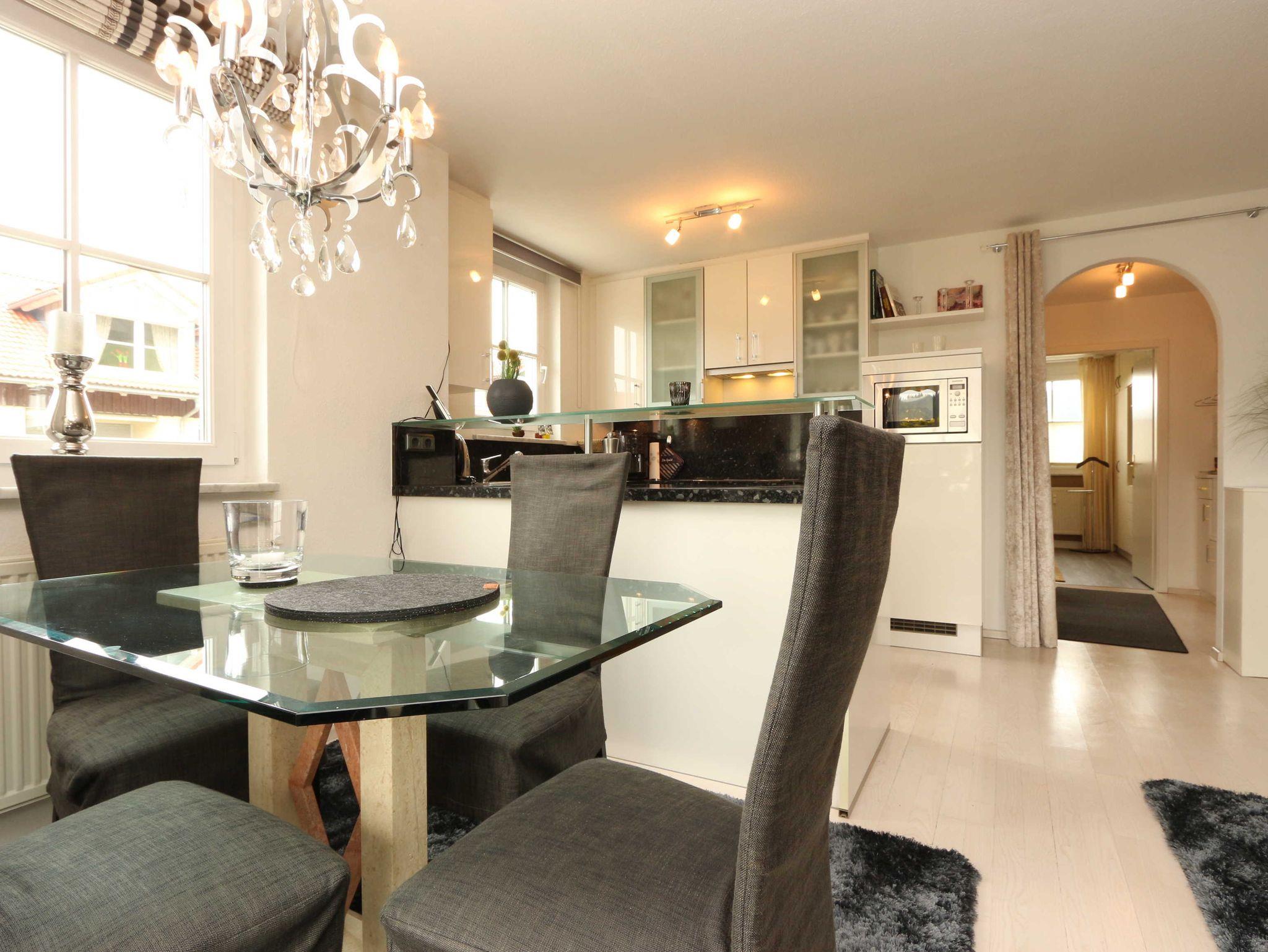 2-Zimmer-Wohnung mit gehobener Ausstattung für 2 - 3 Personen (ca. 52 m²) im Hochpaterre mit Schlafzimmer, Wohn- und Esszimmer, Terrasse, Küche und Bad.
